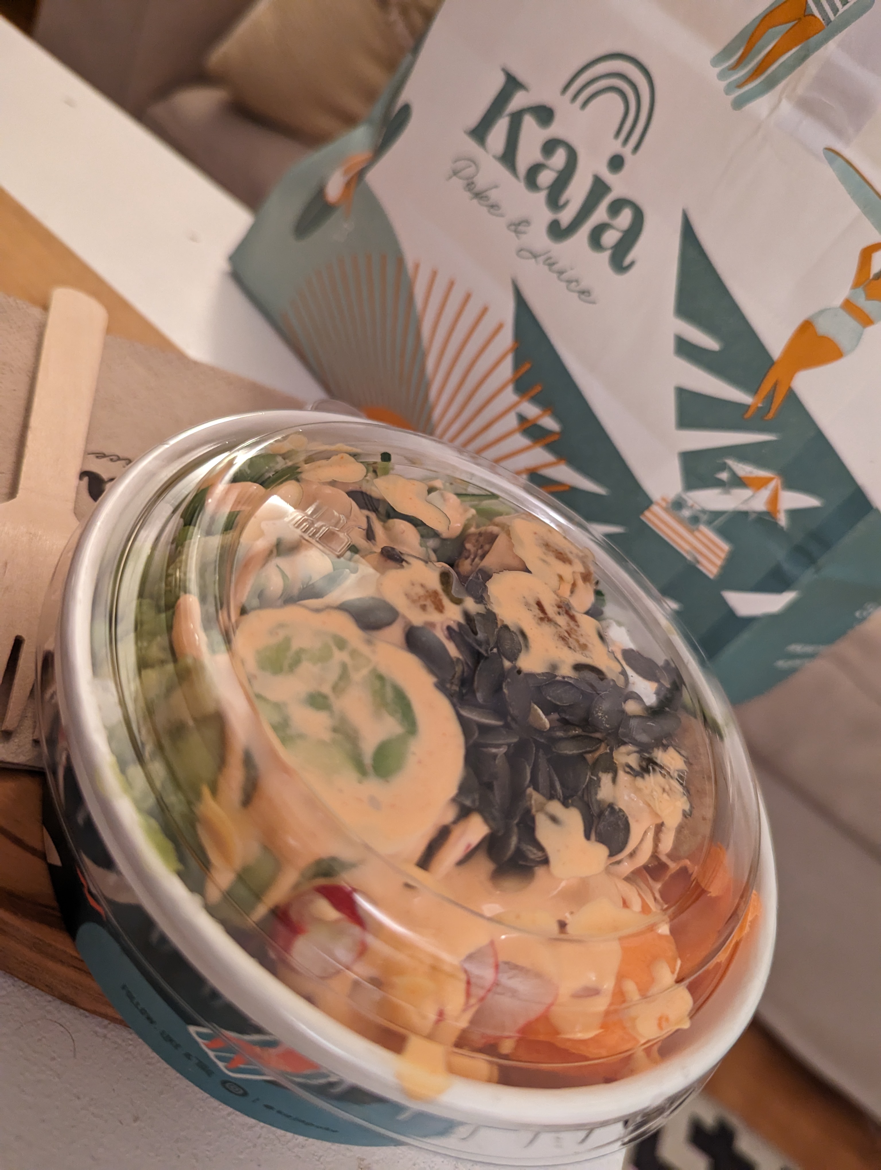 Aujourd’hui, la nourriture devrait être un peu moins chère. Et nous avons opté pour le Kaja poke & juice. Il y a quelques jours, nous mangions à côté chez Papa's Burgers et avons pu voir les délicieux bowls. Le bol sera fraîchement emballé. Il y en a des petits et des grands. Le petit est tout à fait suffisant, même s'il n'en a pas l'air. Tout était délicieux. Les légumes étaient frais et croquants. Vous pouvez choisir la sauce. J'avais de la mayonnaise épicée et c'était vraiment épicé. Ma conclusion 8/10 Un repas sain et délicieux :) Si vous aimez les bowls, vous pouvez vous procurer quelque chose ici ou le manger sur place sans aucun souci.