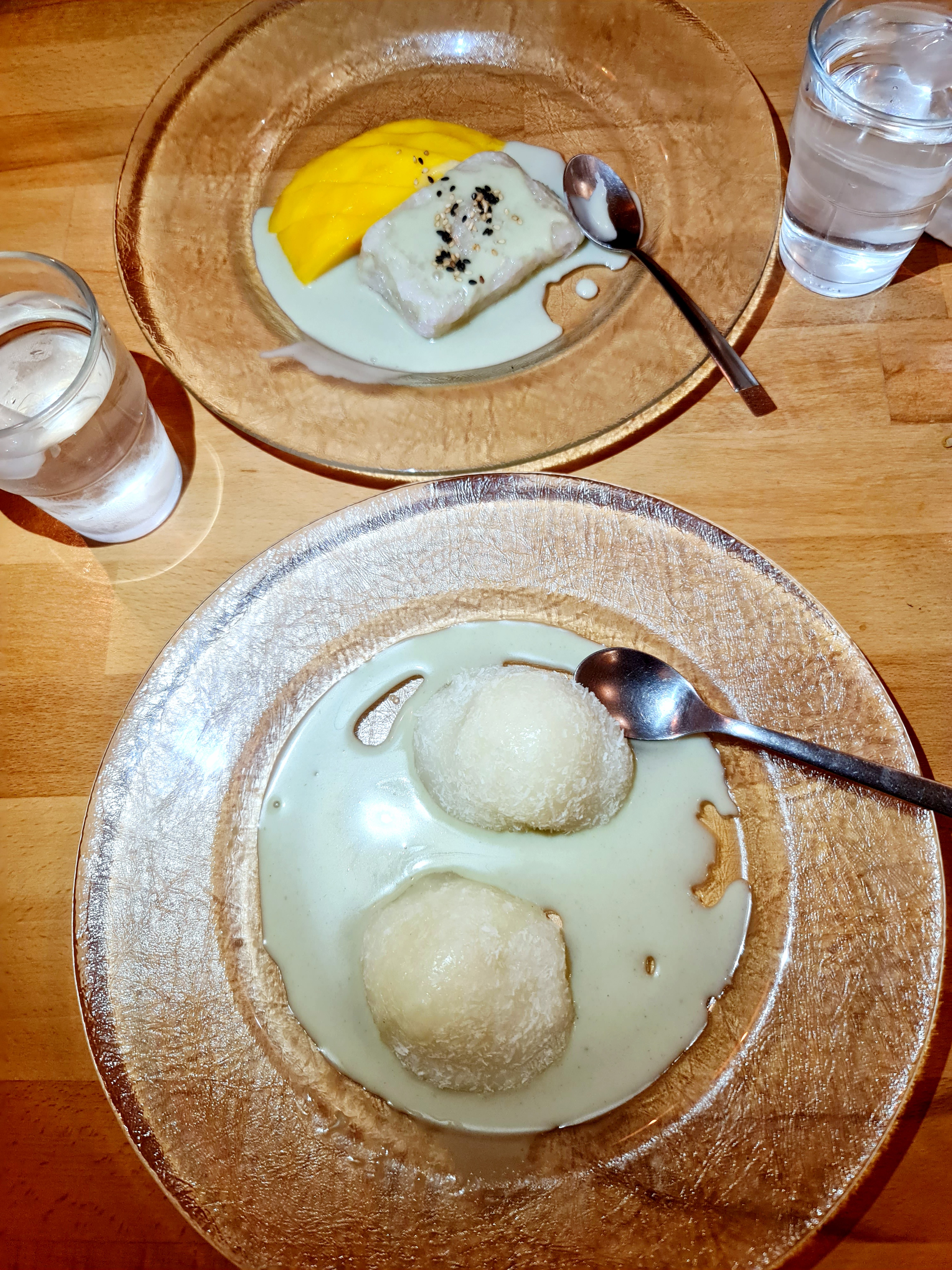 Cuisine excellente. Jai testé en entrée la salade mangue ananas crevette; très bien assaisonnée et fraiche. Le poulet servi dans une feuille de bananier avec riz gluant est légèrement épicé et savoureux. Et les desserts.....nous en avons testé 2: flan thaï et banane tapioca: délicieux. Je recommande vivement!