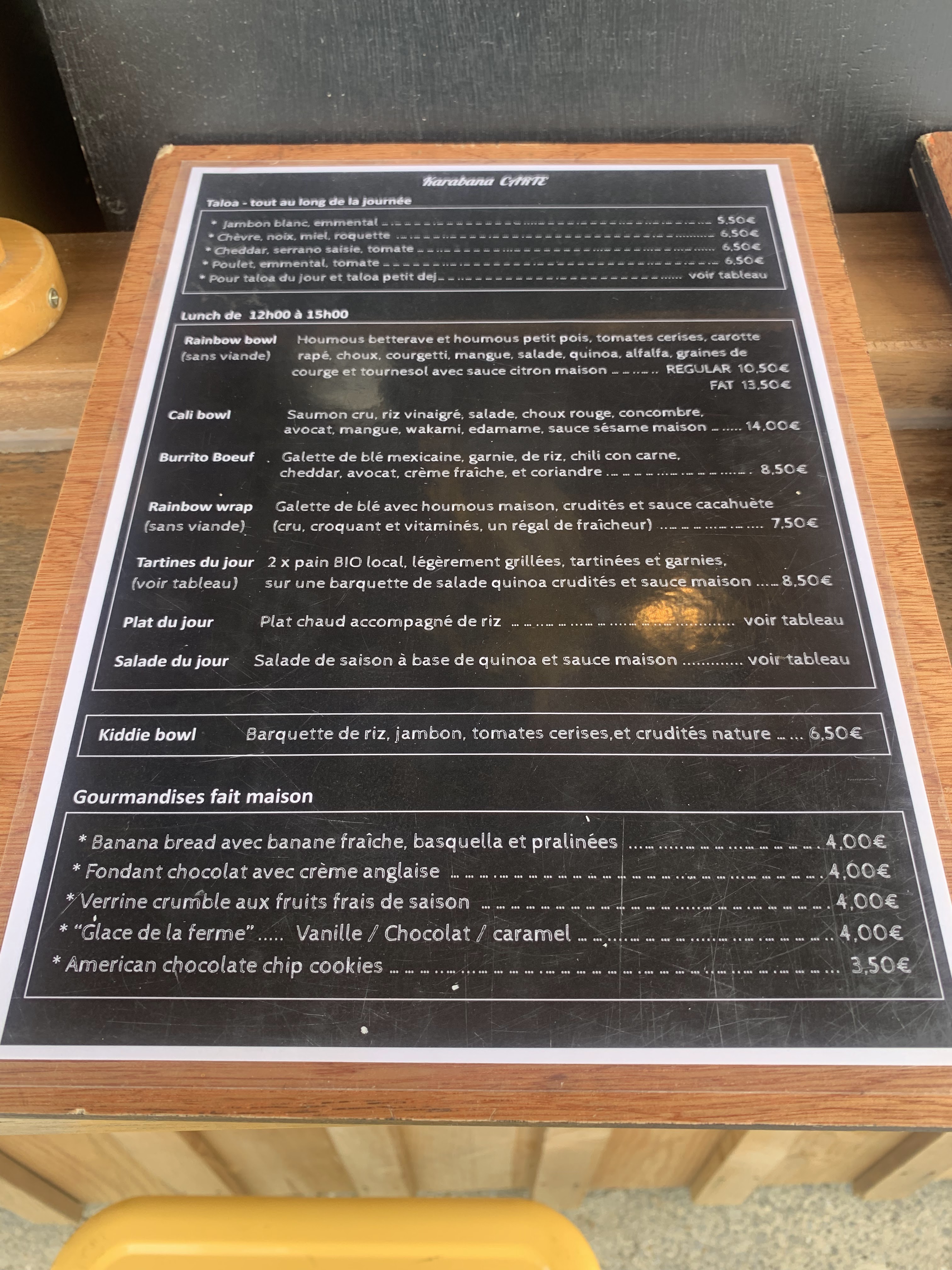 Réouvert tous les jours depuis le week-end de Pâques. Fermé en cas de pluie ou vent fort. Jus frais, taloas sucrées et salées, tartines, acaï bowl, plat du jour. Le Nutella est remplacé par le Basquella bien évidemment.