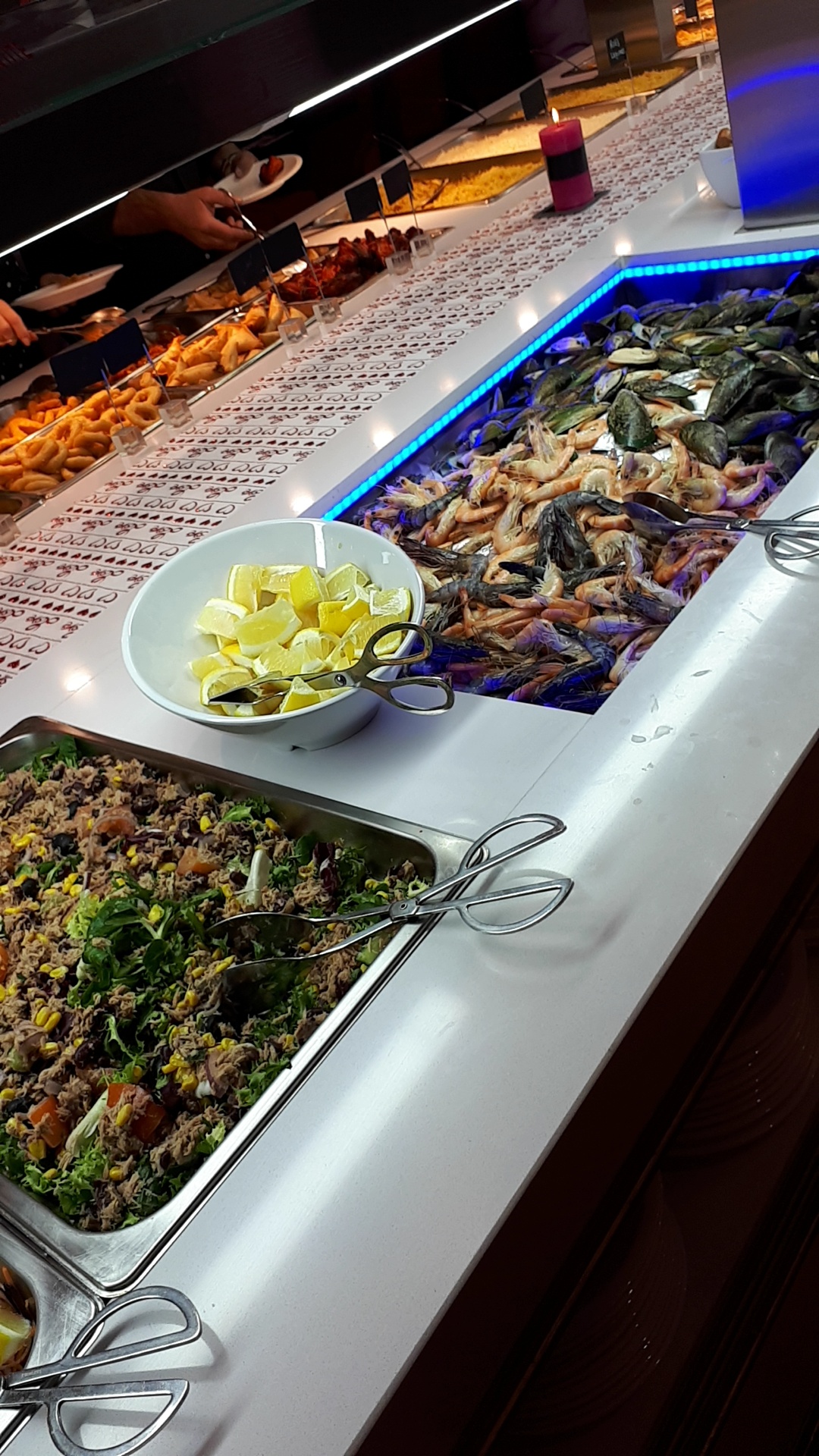 Un buffet chaud et froid avec beaucoup de choix et des plats qui se laissent déguste et nous font voyager, côté grillade et pain beaucoup d'attente, les desserts ne sont pas tous remis sur le buffet ! Alors qu'il était que 21h30 ! Nous y sommes allés en semaine pendant les vacances de Noël et c'était très bruyant. Un brouhaha infernal...