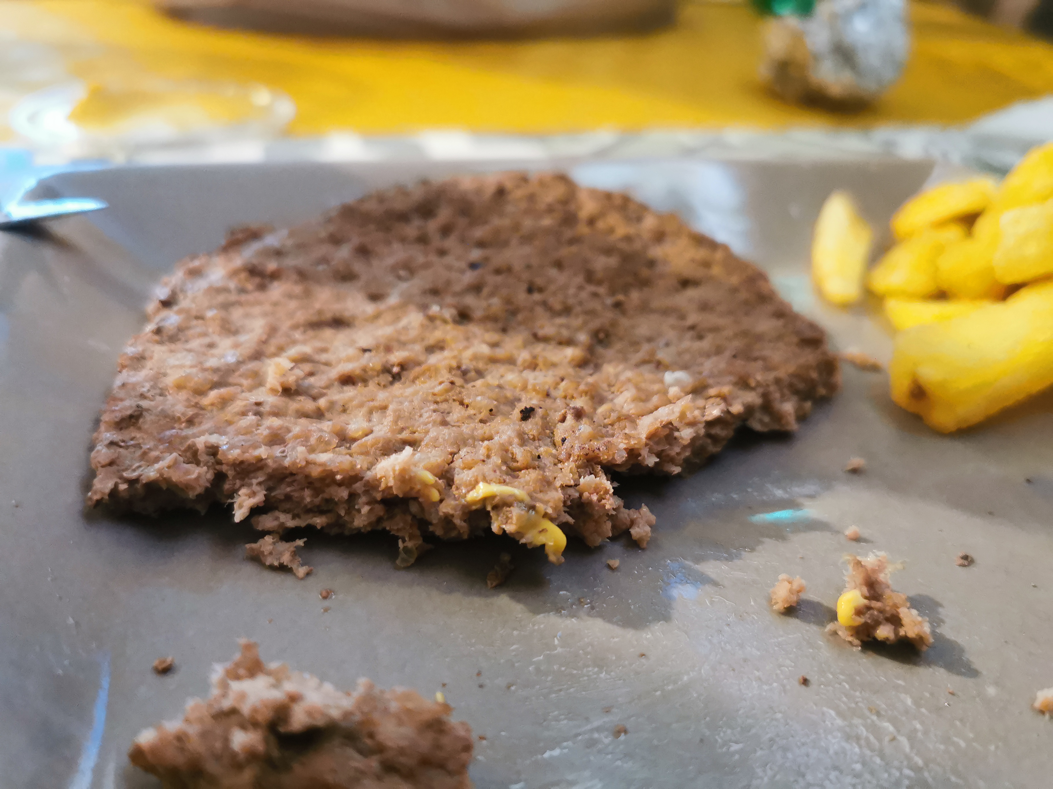 Frites convenables mais grande déception en ouvrant le papier d'aluminium contenant le steak haché...plat comme une semelle de godasse bon marché, sans goût. Je suis désolée mais cela ne vaut pas 4€. Chez mon boucher, j'ai un bon steak haché frais, qui a du goût pour 2€. Au moins, ce steak aura fait un heureux dans la soirée : mon chien.