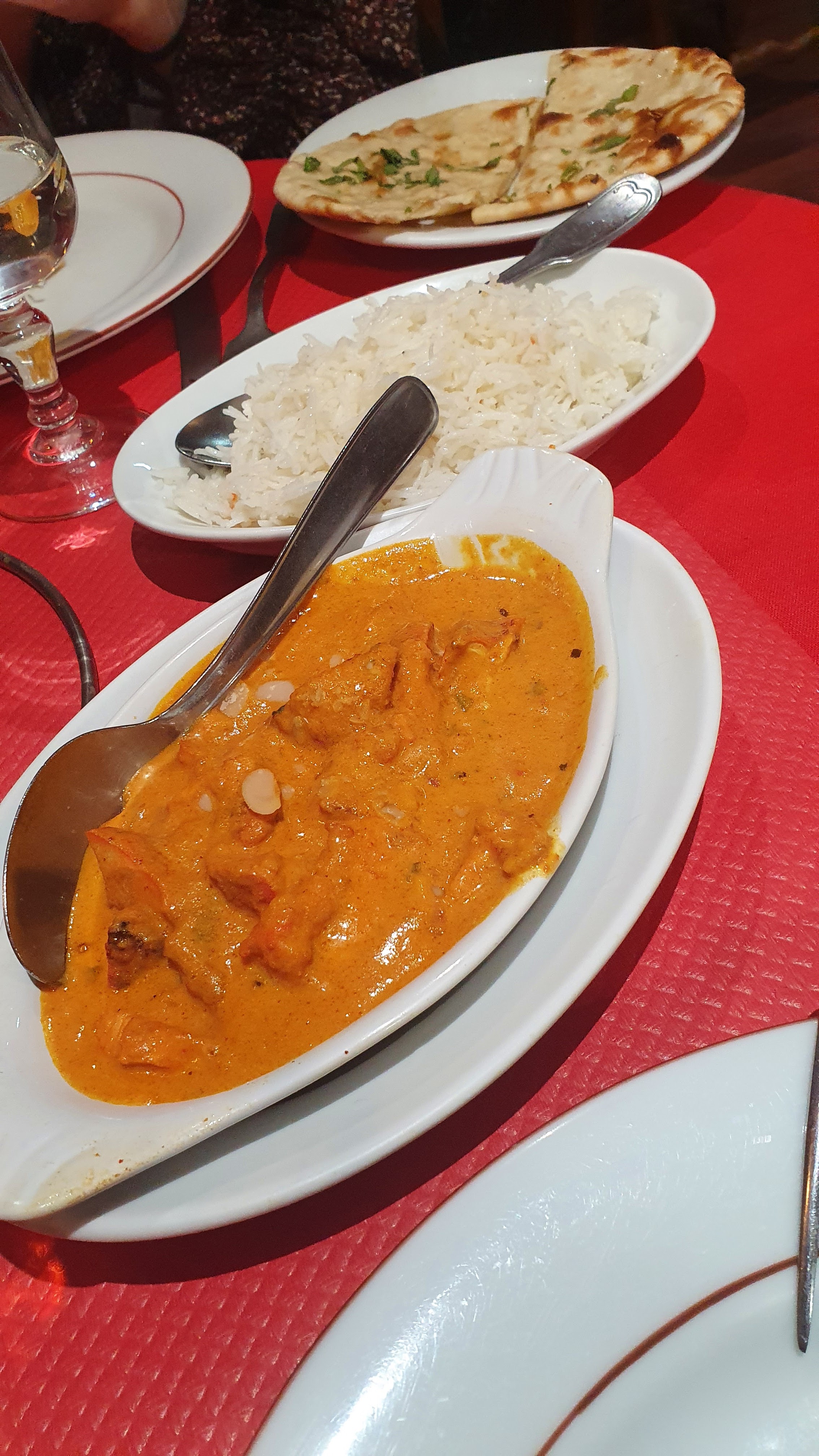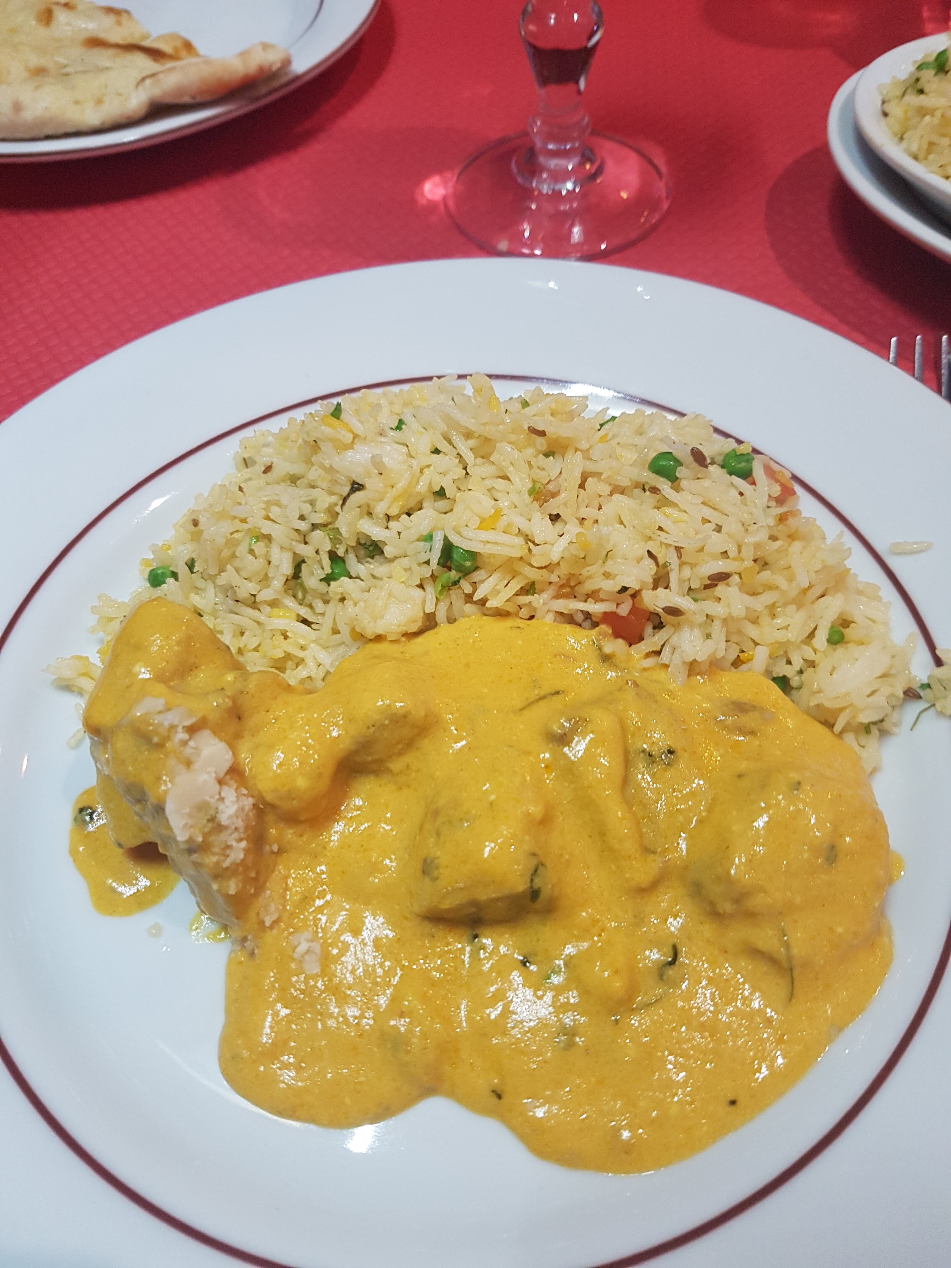 Nan fromage moyen on ne sent pas bien le fromage. Poulet tikka très bon sauces excellentes. Boeuf korma qui manque de saveurs mais bien cuit quand même avec le riz pulao au petits pois. Glace kulfi bonne mais sans plus on trouve mieux ailleurs. Service efficace sympa. Un cognac est quand même offert à la fin du repas.