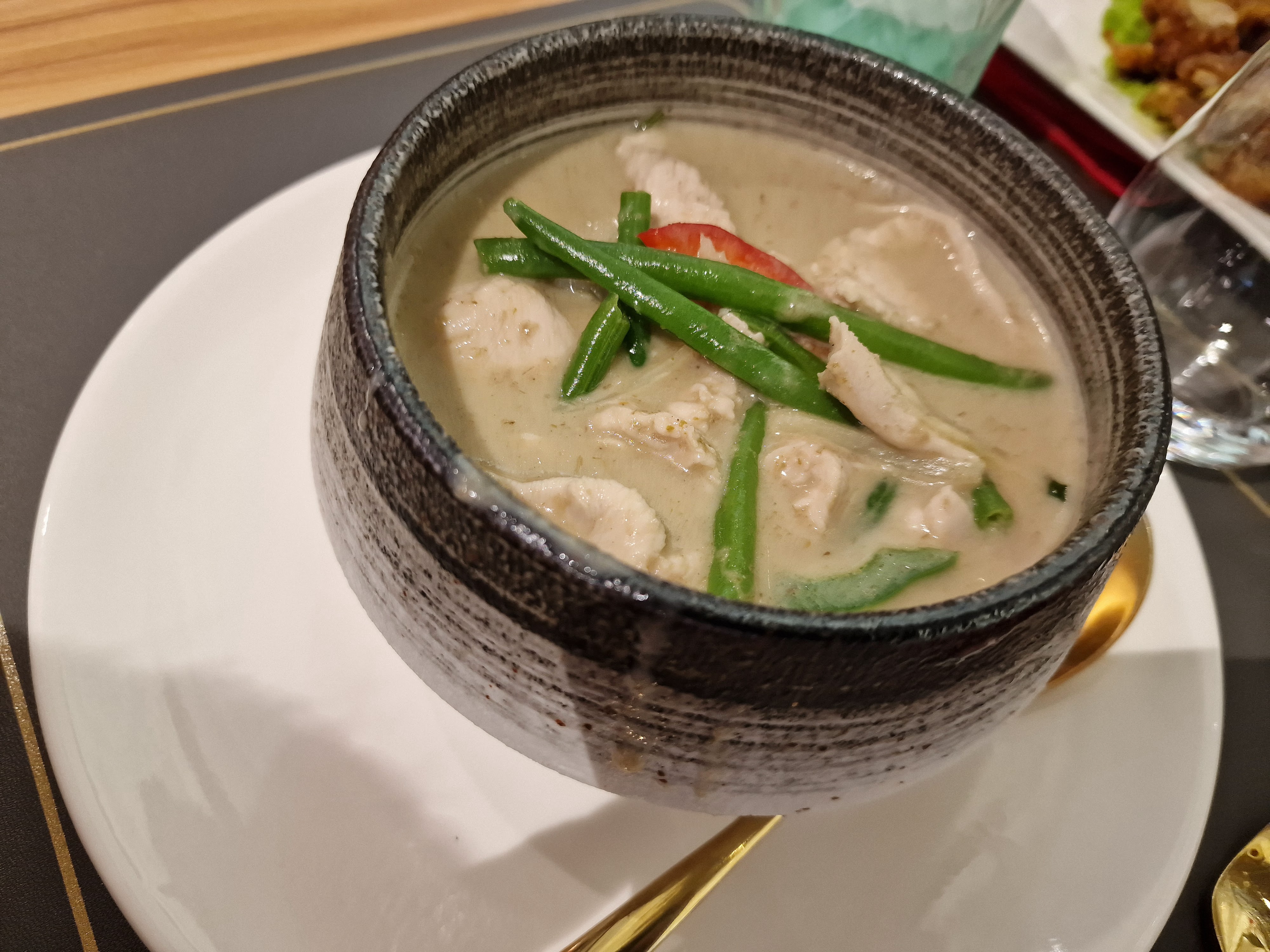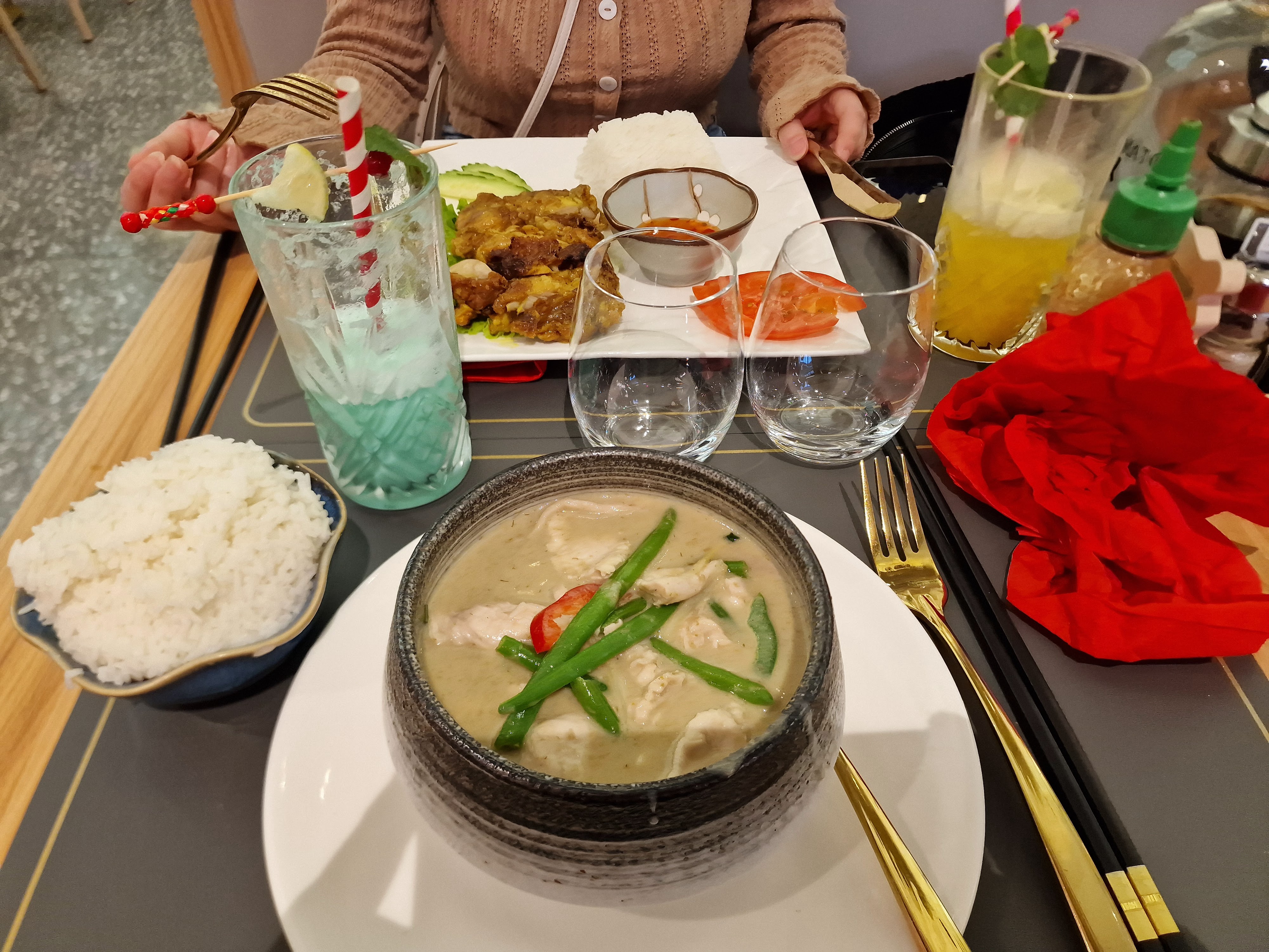 Nem congelé ( je trouve chère pour du congelé 6,50 les 4 ) Salade de papaye, bonne dose, manque de goût, râpé tres gros, manque de sauce Curry vert, bon goût, blanc de poulet un peu trop cuit du coup un peu sec J'aurais préféré que la sauce soit un peu plus pâteux car extrêmement liquide. Le riz 🍚 était un peu dur également, (manque d'eau) Boule de tapioca mangue, les boules de tapioca était très dur (resté au frigo sûrement un peu longtemps)