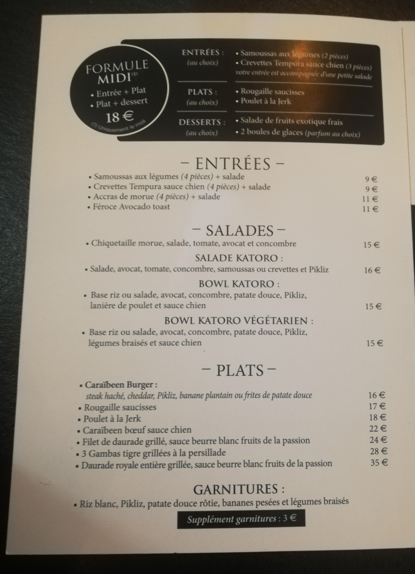 Hello, c'est la première fois que j'ai mangé chez Katoro après les avoir découvert sur les réseaux ...et franchement je n'ai pas été déçue! Nous avons été bien accueilli mon mari et moi par une femme...polie et cordiale. Le chef a également pris le temps de s'intéresser à nous..ce qui est fort appréciable. Continuez. La cuisine est bonne et savoureuse mais ça je vous laisse en juger. J'étais satisfaite par la présentation et par le goût au rendez-vous. Le punch coco ...hmmm je recommande ..Les tempura aussi ! Et le burger caraïbeebn également.