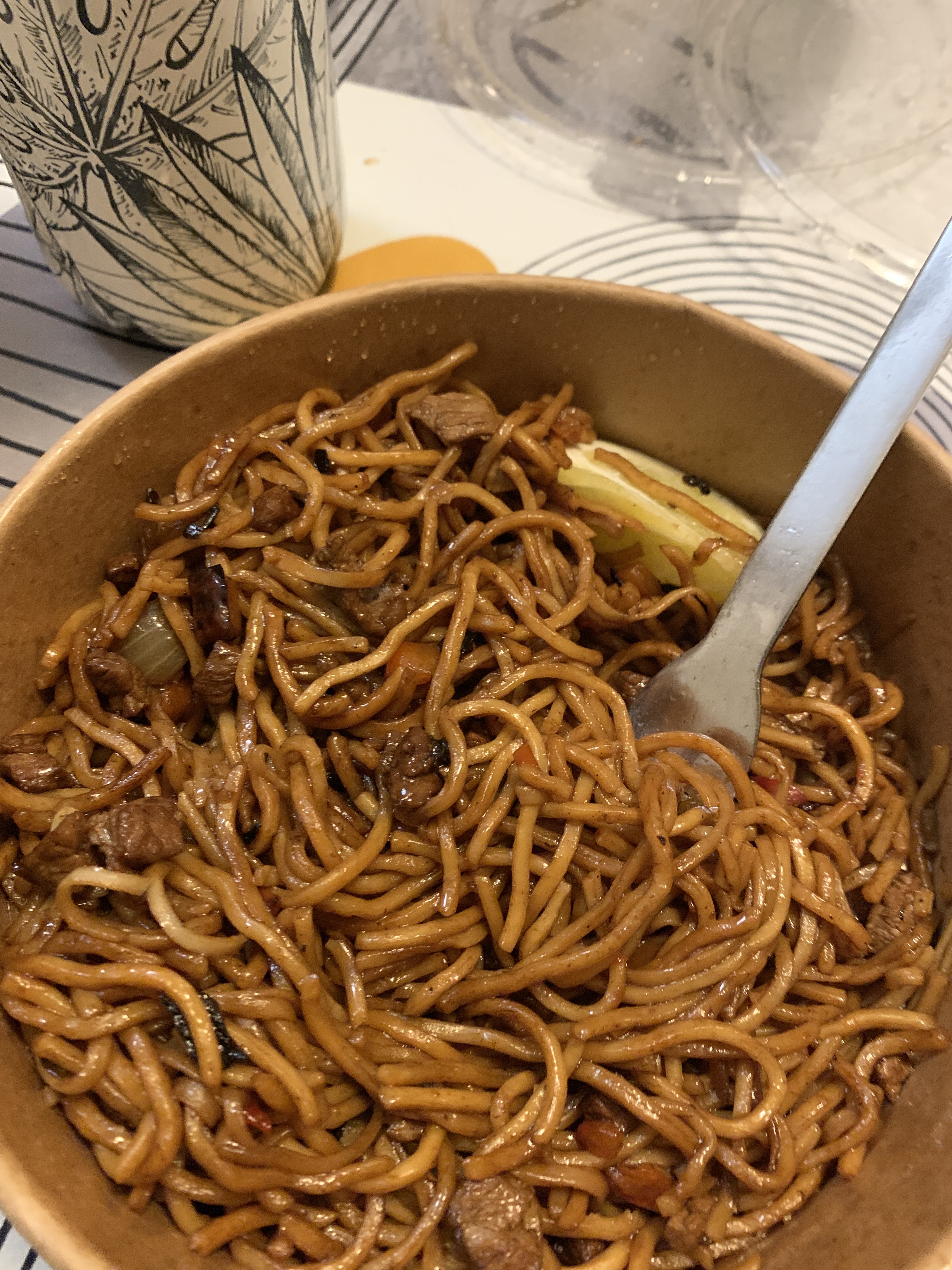 Nouilles sautées au boeuf très bonnes, accompagnées d'un petit pot de sauce aigre douce. Le mélange est très bon. Je regrette le manque de boeuf car il y en a pas mal mais vraiment des petits morceaux. Mais point de vue rapport qualité prix c'est top !