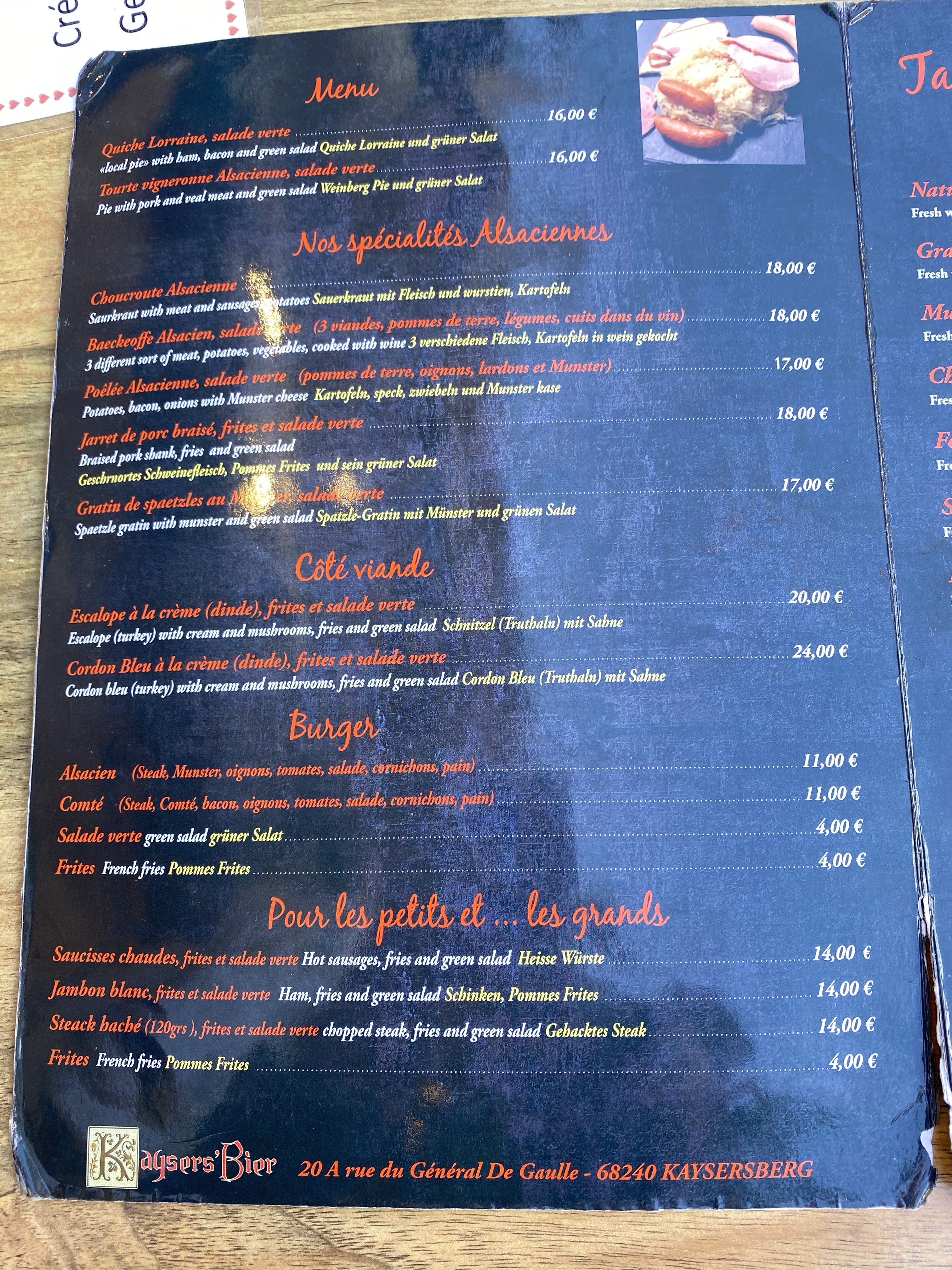 Très bonnes tartes flambées ! Nous nous sommes arrêtés au Kaysers'bier au détour du marché de Noël en famille. Alléchés par la carte extérieure, nous avons été déçus de constater qu'une carte spéciale marché de Noël avait été établie, sans aucun plat végétarien. Mais c'est très aimablement que la serveuse nous a proposé de retirer les lardons de la tarte flambée. Les tartes flambées sont excellentes et réalisées rapidement. Si vous souhaitez manger vite en période d'affluence, misez sur les tartes flambées ! La pâte est délicieuse, fine et croquante. Et que dire du Munster, du vrai Munster qui a du goût ! Très bonne carte des vins également. Les desserts sont en revanche nettement un cran en-dessous.