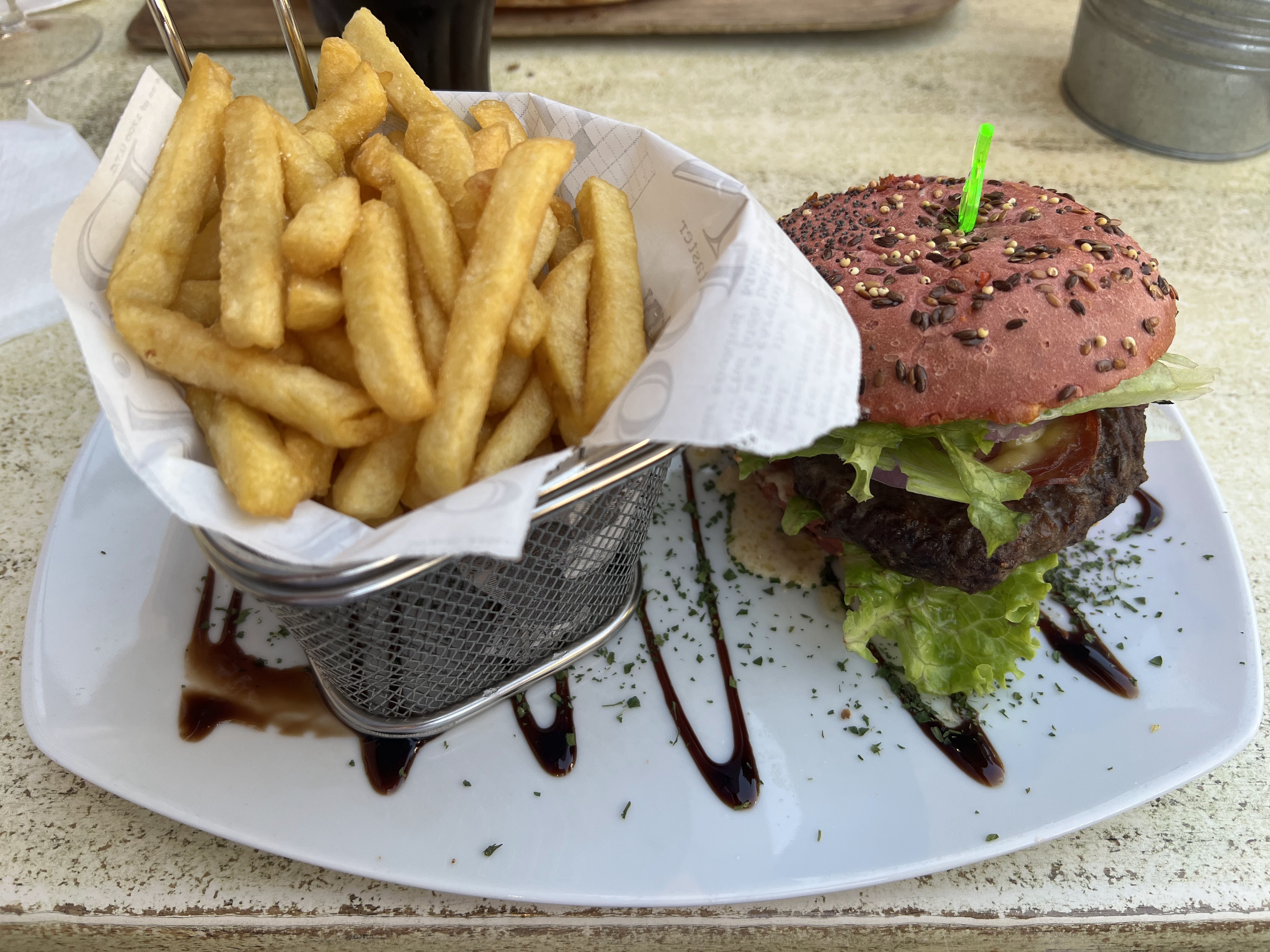 Site touristique🤷♂️ Version courte : Ça ne vaut pas le coup, car c'est ridiculement cher et ils osent s'ajouter eux-mêmes un pourboire de 3€. Comme si leurs prix n'étaient pas assez chers Détaillé: Un peu cher pour ce que c'est et la TARTE, eh bien, c'est juste du BLEND et donc pourquoi ça ne vaut pas le coup. Quant au burger : il présente une décoration d'assiette intéressante (sauce Balsamico en guise de décoration). Mais un chignon rose intéressant aussi J'y suis allé avec une connaissance et ensemble nous avons payé 33€. Le burger était à 14€ et la tarte à 16€. Ils ont automatiquement ajouté eux-mêmes le pourboire de 3 €.