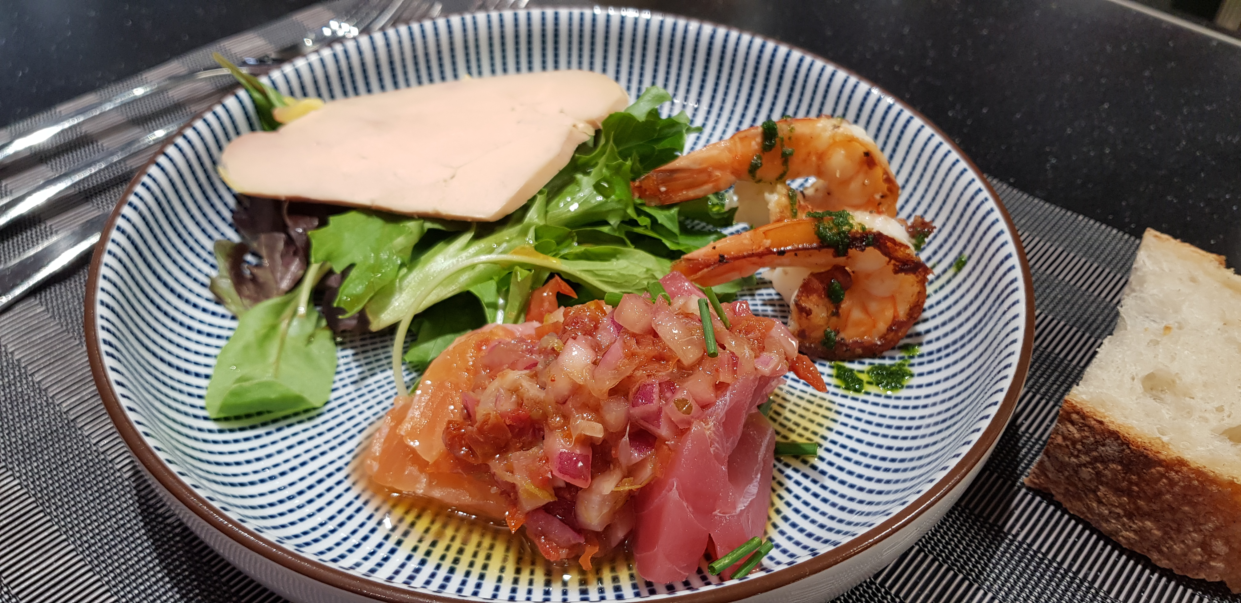 Un bon moment gustatif. De l entrée au dessert ce fut copieux généreux a l image du chef cuisinier. Le fait de voir le chef cuisiner devant vous montre sa maîtrise des produits frais. Le cadre du restaurant est agréable et silencieux. Je recommande vivement même si je trouve qu il vaut mieux manger le midi que le soir. Ce que je vous montre 2 entrées 3 plats et un dessert pour moi ;)