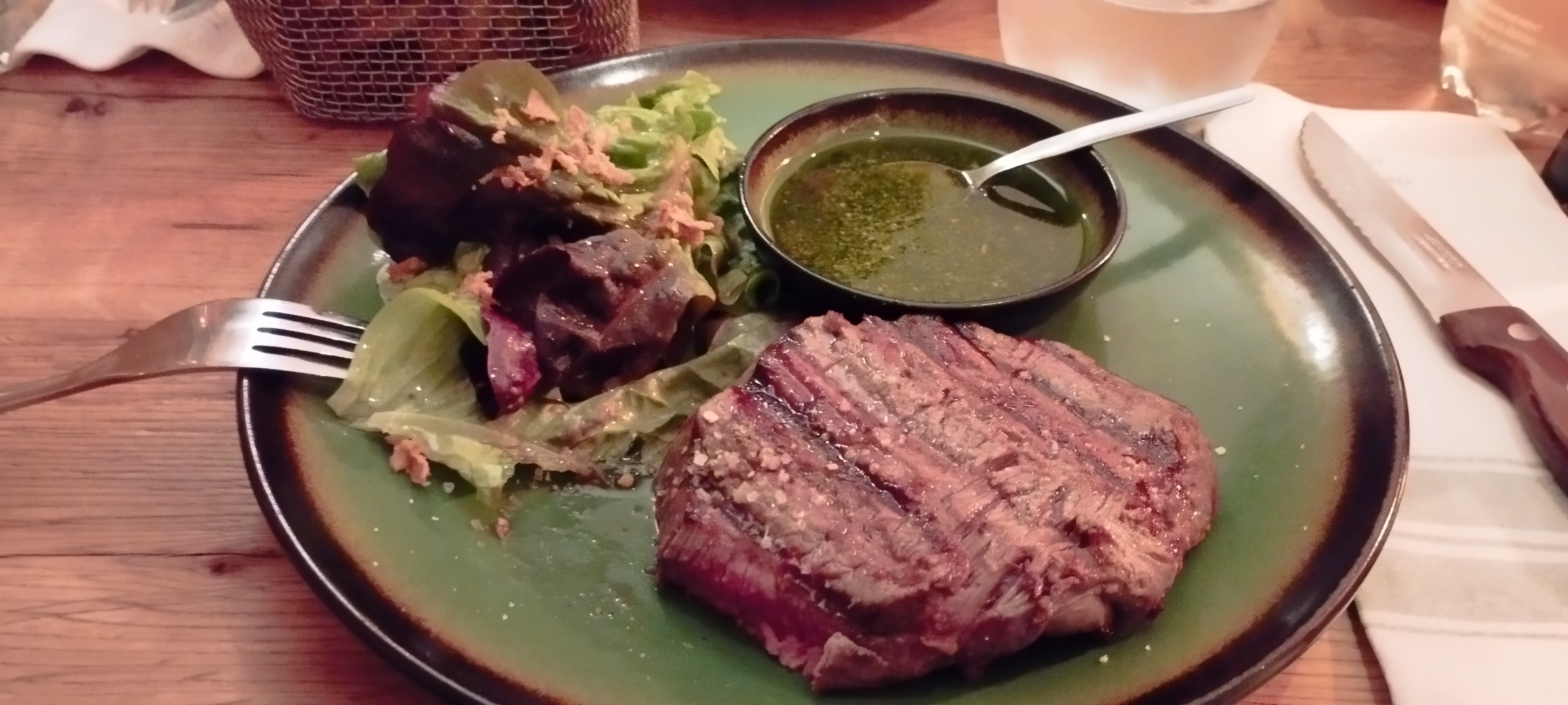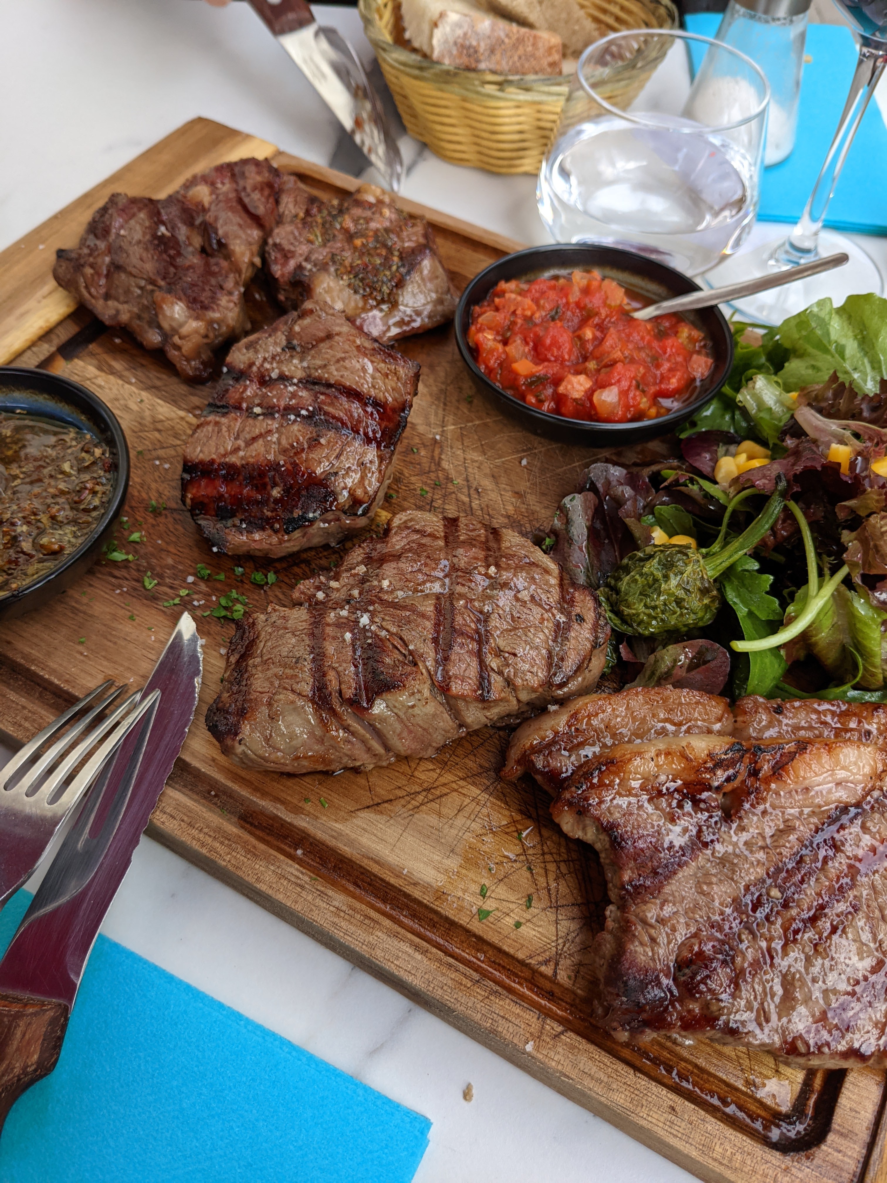 Trop bon: la viande, une tuerie...une viande savoureuse, tendre et juteuse😋présentée sur une planche accompagnée de ses deux sauces (quatre au choix), de la salade verte et de bonnes frites maison avec le vin un régal. Et que dire du dessert, j'en ai dégusté un deuxième: la poire-chocolat est à tomber. Les serveurs sont très sympa!