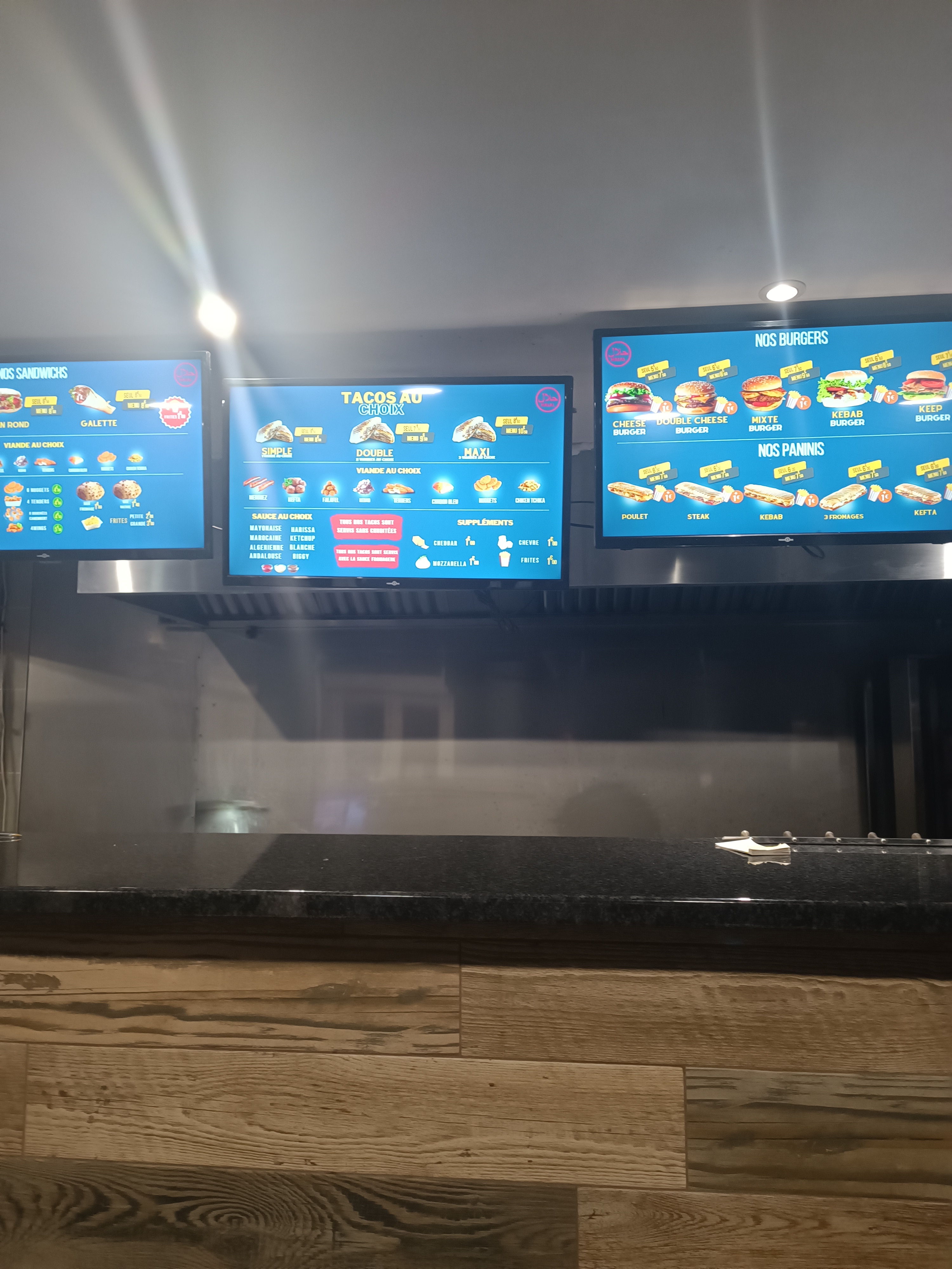 Gérant souriant Tacos bien fourni en sauce et bon goût Pas trop cher Service très rapide Je conseille