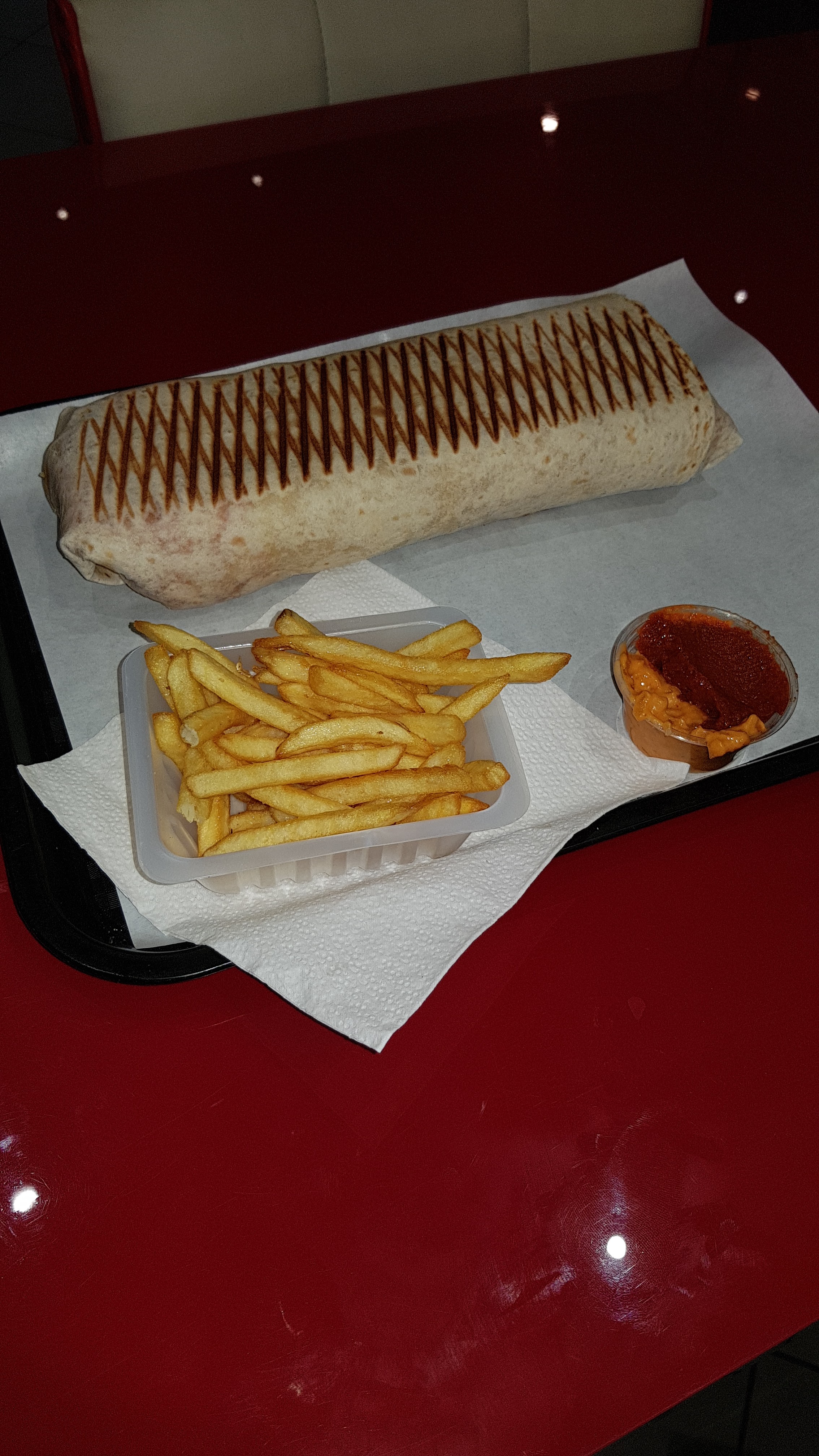 Livraison à domicile pas de sauce demandée, viande sèche le tout épicé pour faire passer le manque de goût Je ne recommande vivement pas