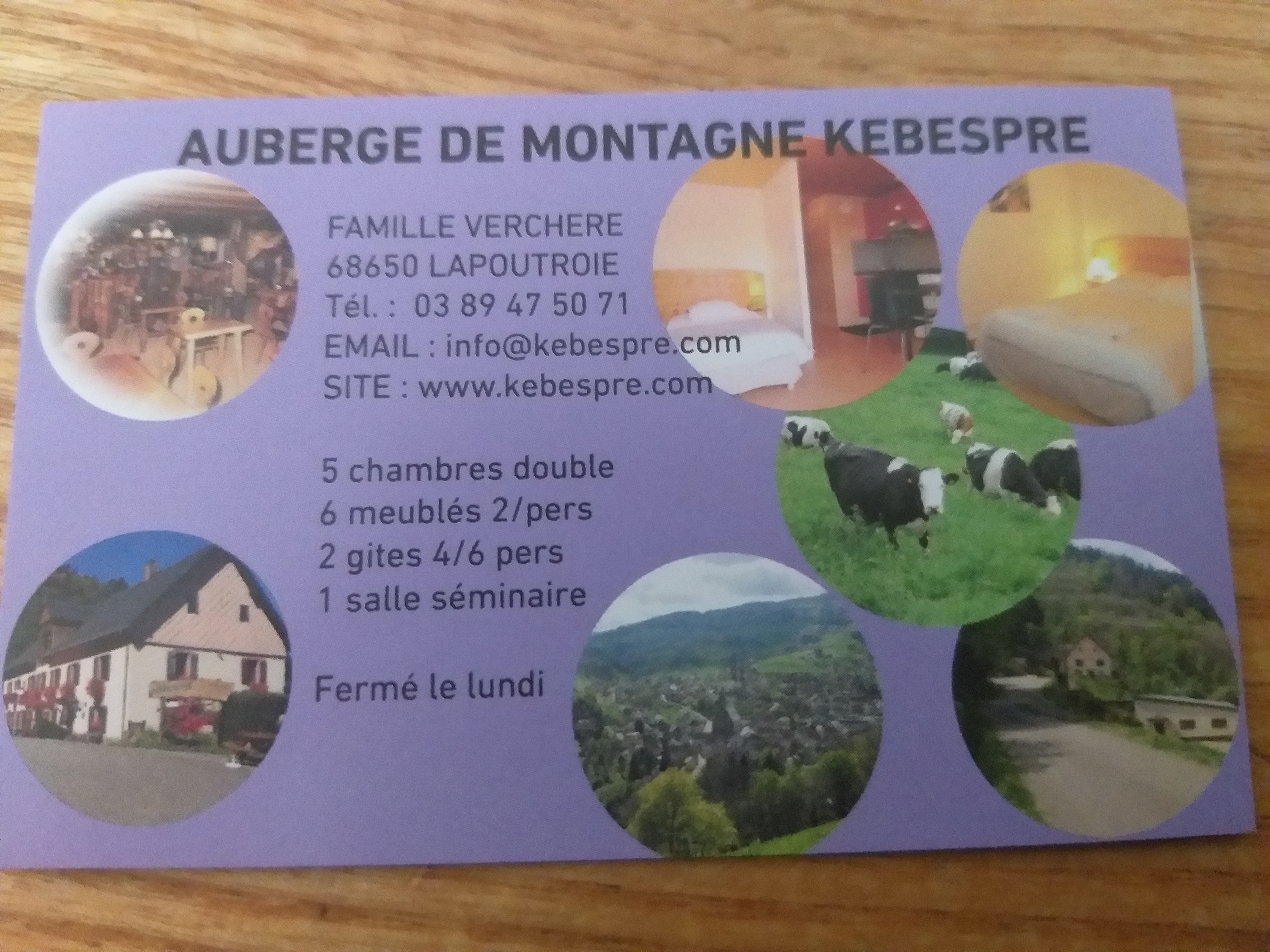 Un séjour en Alsace ? L'auberge de montagne Kébespré est un lieu idéal pour se détendre. Les propriétaires Christophe et Claudine sont dotés d'un relationnel exceptionnel. Ils nous accueillent et nous bichonnent comme si nous étions de la famille. De belles ondes flottent dans l'air et rejaillissent sur les clients qui deviennent vite des copains que l'on a hâte de retrouver. La cuisine servie avec amour par la perle du logis est gourmande et délicieuse. Le confort des chambres est apprécié. Atout supplémentaire... Le rapport qualité prix est imbattable.