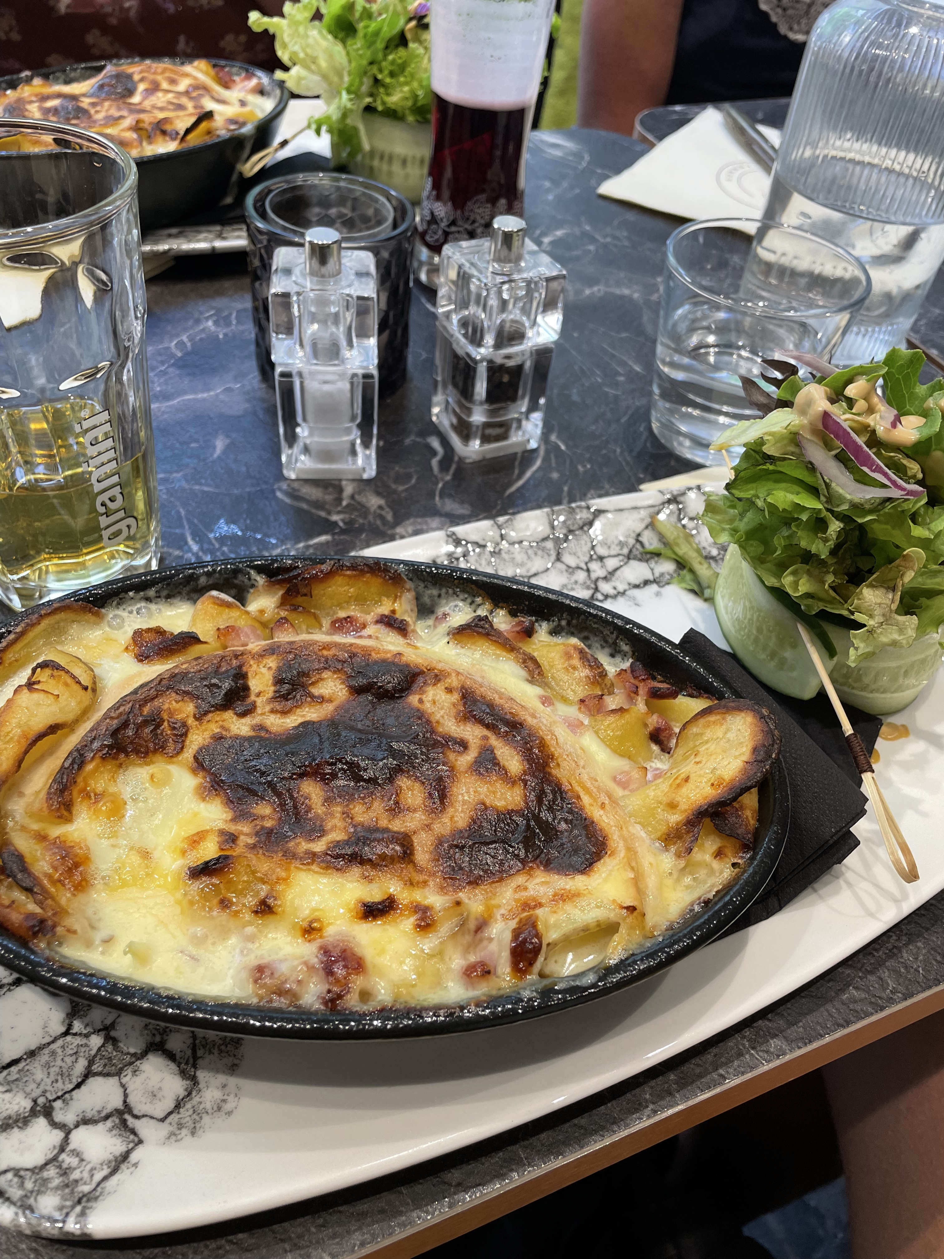 Les tartiflettes sont délicieuses! Service impeccable aussi! Cependant, ma mère a pris une salade Kelsa (il y avait un perce-oreille dedans?) et il n’y a presque rien de consistant à l’intérieur ; elle a dû prendre du pain pour ne plus avoir faim. *Faites juste attention à vos sac, on s’est fait voler notre sac qui était accroché à notre chaise contenant nos clés de voitures, portefeuilles, clés d’appartement, etc. On était 5 et personne n’a rien vu, donc soyez vigilant. On était sous les arches tout près de l’intérieur, on ne comprend pas comment c’est possible… Bref, c’est un lieu très touristique et il n’y a pas de caméra de surveillance à l’extérieur du restaurant.*