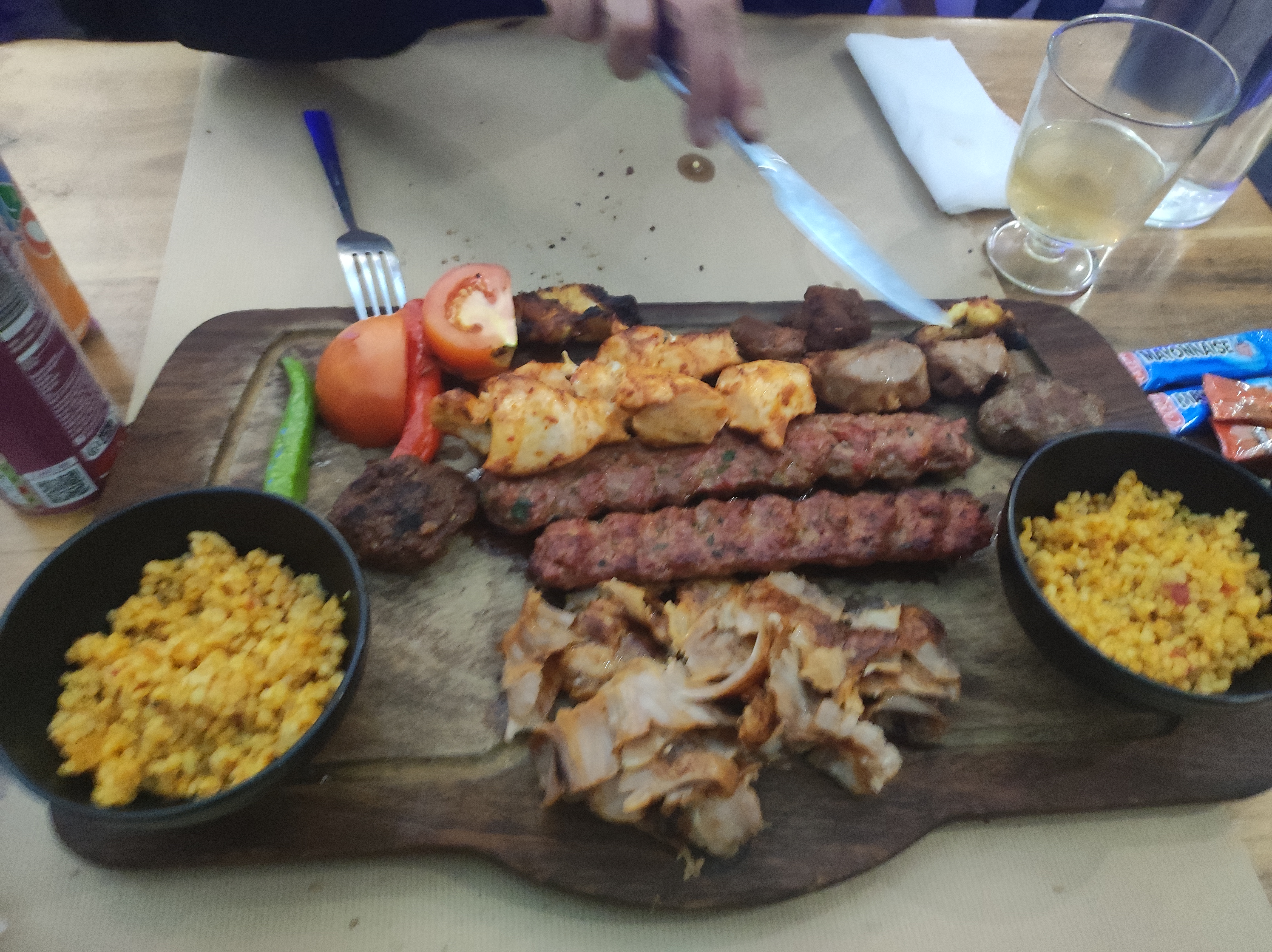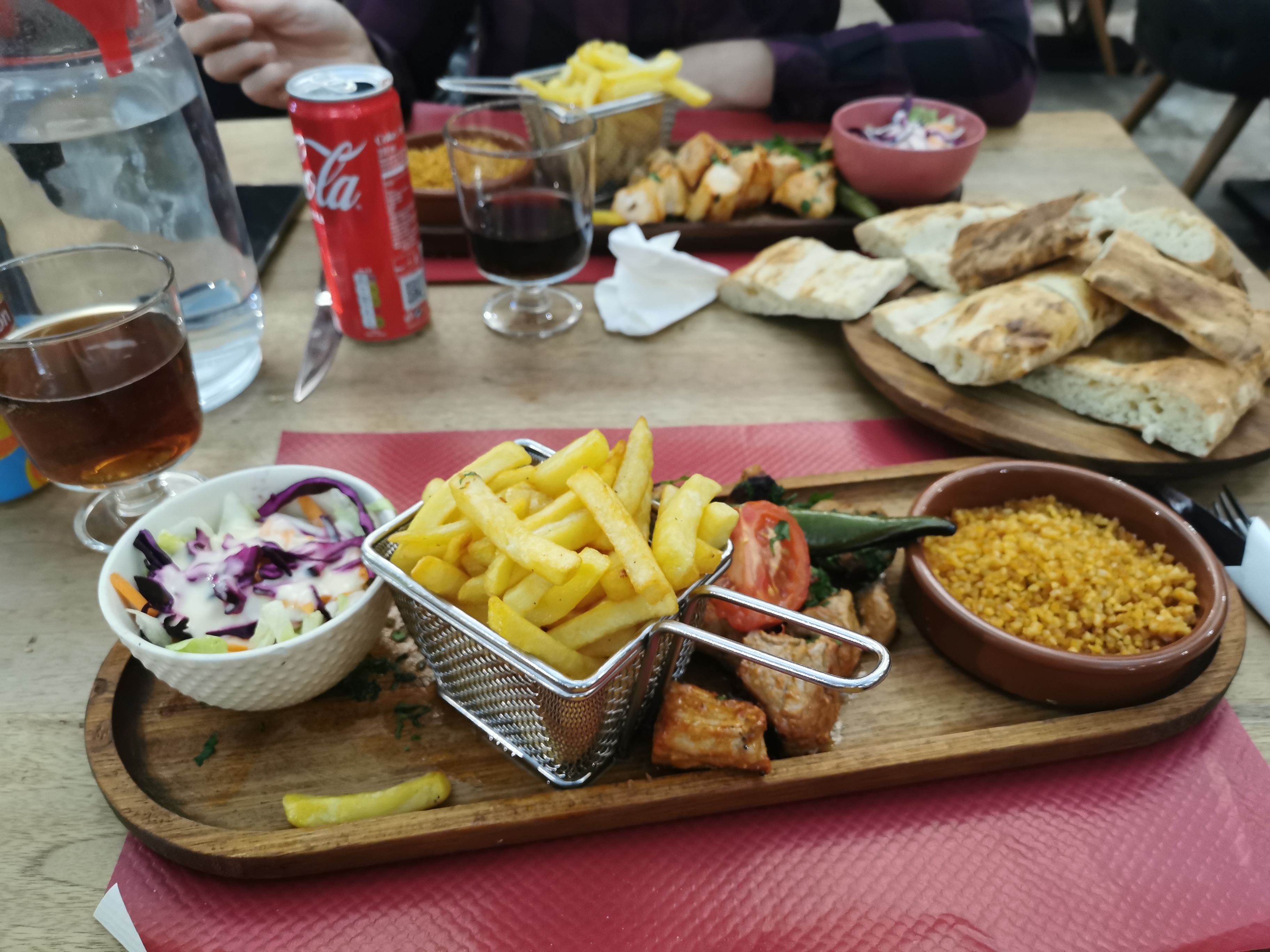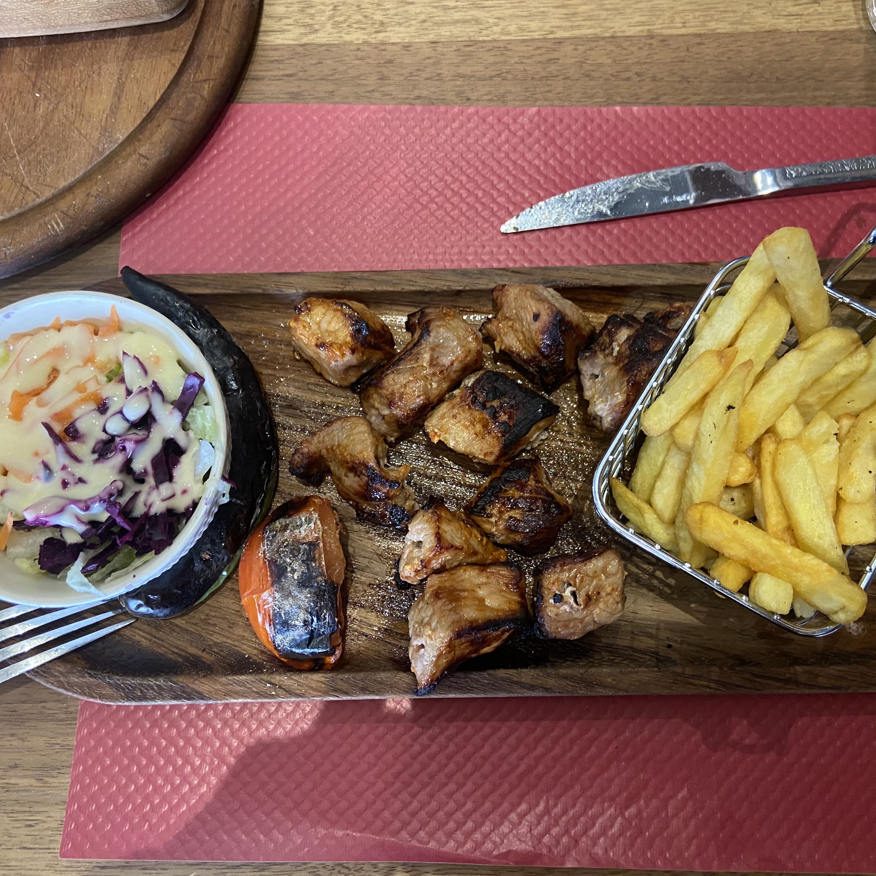Superbe expérience de la cuisine Turque !!! Nous avons été agréablement surpris. Accueil avec un du pain et des sauces divines, puis nous avons pris un mix de viandes servis avec des frites du boulgour et un mélange salade/chou/carottes ! La viande succulente, très bien cuite et hyper tendre ! Puis un thé offert en fin de repas vient combler ce bon moment ! Le seul petit bémol que nous avons à dire, et la fumée qui prend à la gorge et aux yeux 😌 mais qui ne nous empêchera pas de revenir ☺️
