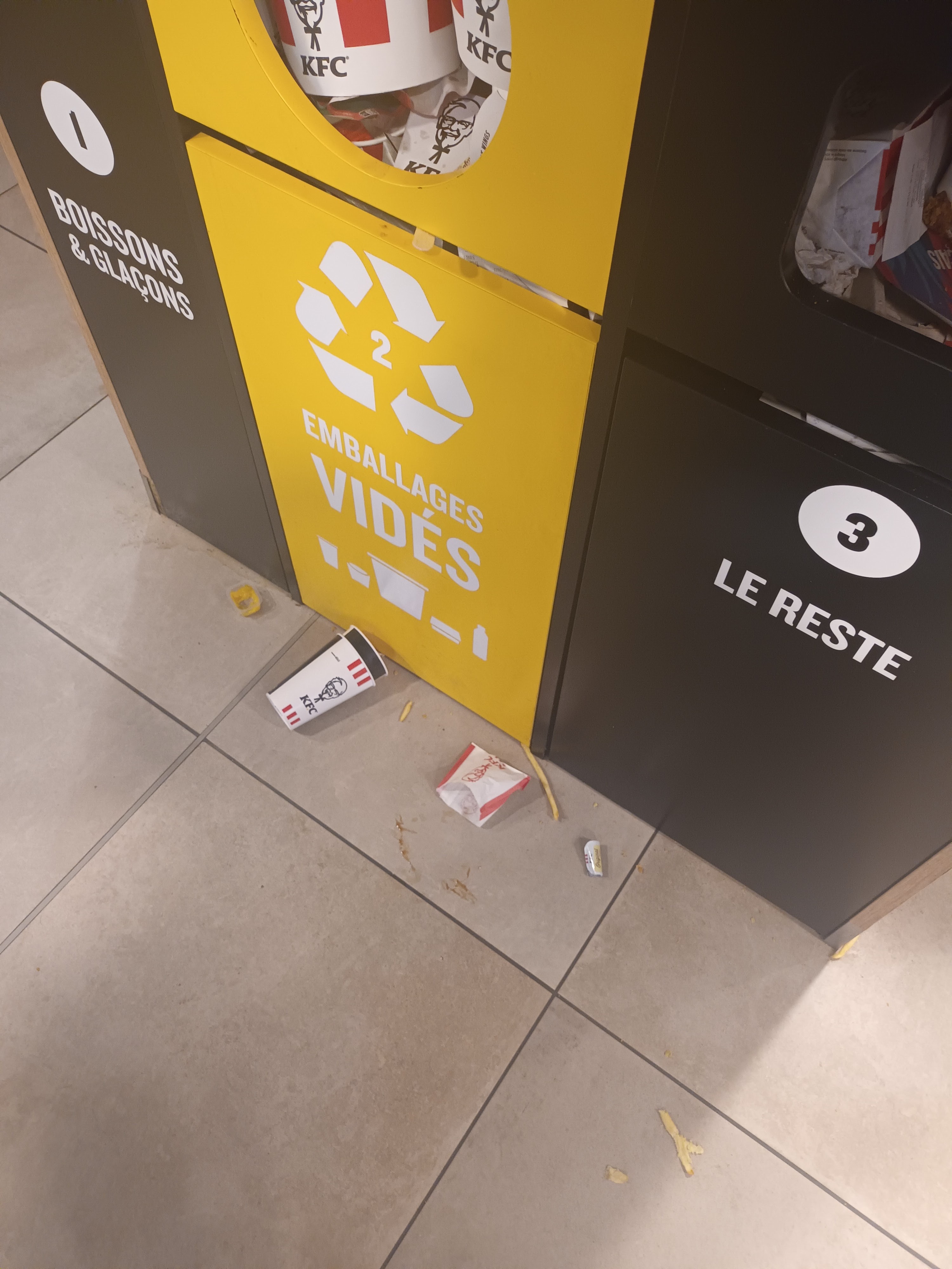 Maïs cobette froid, frites archi-salées, boissons sans glaçons, tenders minuscules et plein de morceaux d'os à l'intérieur (et ce n'était pas des wings), les verres de leur vaisselle sont plein de traces d'on ne sait quoi, sans doute du ketchup ou de la sauce barbecue, en tout cas ils n'étaient pas propre, mais alors pas du tout. Lors du règlement, je tends le QR code de mon compte client à l'hôte de caisse, il encaisse mon argent, imprime le tiquet de caisse et se rend compte qu'il a oublié de scanner mon QR code : ah désolé, ensuite on m'apprend qu'il manque des maïs cobette, et que nous ne pouvons en avoir qu'un, nous avons du prendre les frites qui étaient encore plus salées que la Mer Morte ! Les tables, chaises, les poubelles et le sol sont très sales, il y a clairement un manque d'entretient, du moins, le nettoyage n'est pas fait optimalement. Je ne parlerai pas de la playlist diffusée dans la salle qui laisse à désirer... Les toilettes sont l'endroit de ce restaurant le plus propre, hormis un verre posé à côté du lavabo ?? Je n'ai pas compris à quoi il servait. Nous avons pris un pot de tenders pour quatre personnes alors que nous n'étions que trois, nous sommes ressortis de KFC en ayant encore faim, alors que nous sommes trois petits estomacs. La taille des tenders diminue de plus en plus chaque mois j'ai l'impression. Bref, 35€ dépensés chez KFC, 35€ qui auraient pu être investis autre part, chez la concurrence par exemple, au moins, chez eux, on ressort avec le ventre plein...