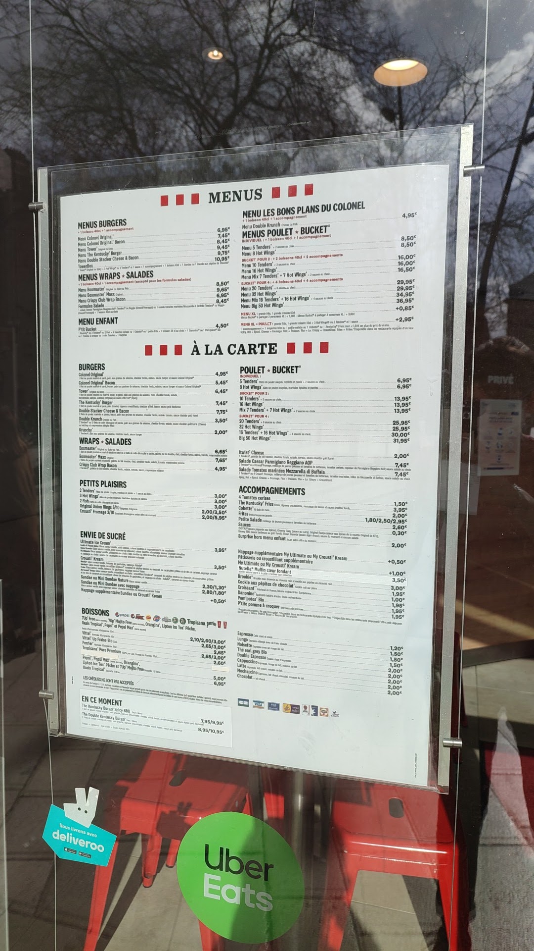Rien à dire sur la gentillesse du personnel et leur service le soir où on n’est venue ( 2 personnes) les frites étaient bien chaudes et bonnes par contre sur 5 sandwichs au poulet il y en avait 4 qui avait le même patty poulet, ça saute aux yeux quand on voit l’aspect de ce dernier ( tout mou et tombant sur les côtés et même la panure toute molle) que le temps de conservation de ces derniers n’étaient pas respectés ( probablement gardé plus longtemps que ce que la chaîne KFC autorise) il ne manquait que des pattys Chicken frais pour que le repas soit vraiment super mais la qualité de nos sandwich été ruinée par ça ;