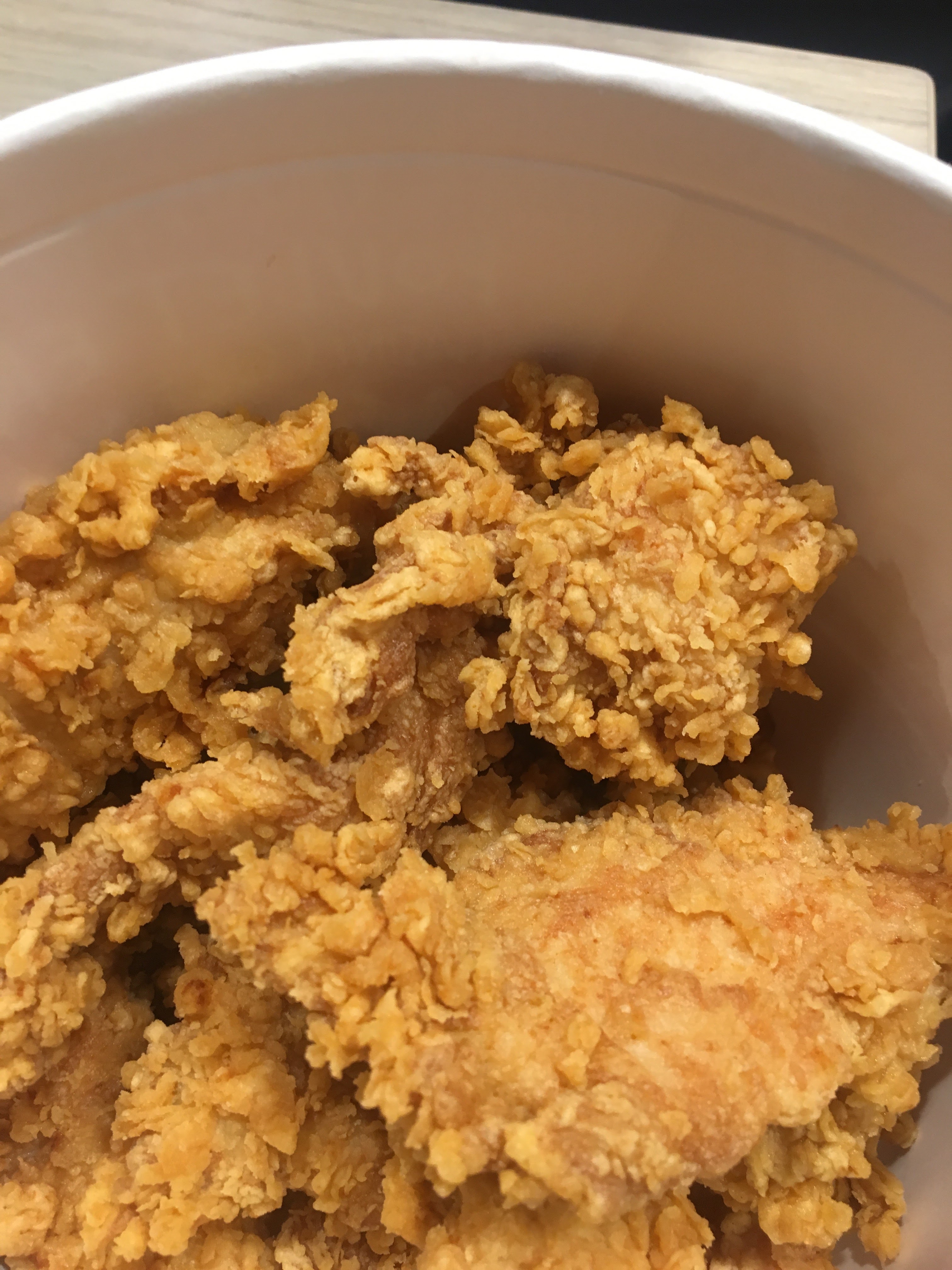 Passé au drive ce dimanche, arriver chez moi pour manger un bucket pour 4 à 42€, je m’attendais à manger. Poulet dur et sec, du carton, immangeable. Cuit au moins 3/4 fois avant d’être dans le bucket. Plusieurs fois ça m’est arrivé, c’est finit. Faut vraiment faire des efforts pour le prix on est pas des chiens. A FUIR