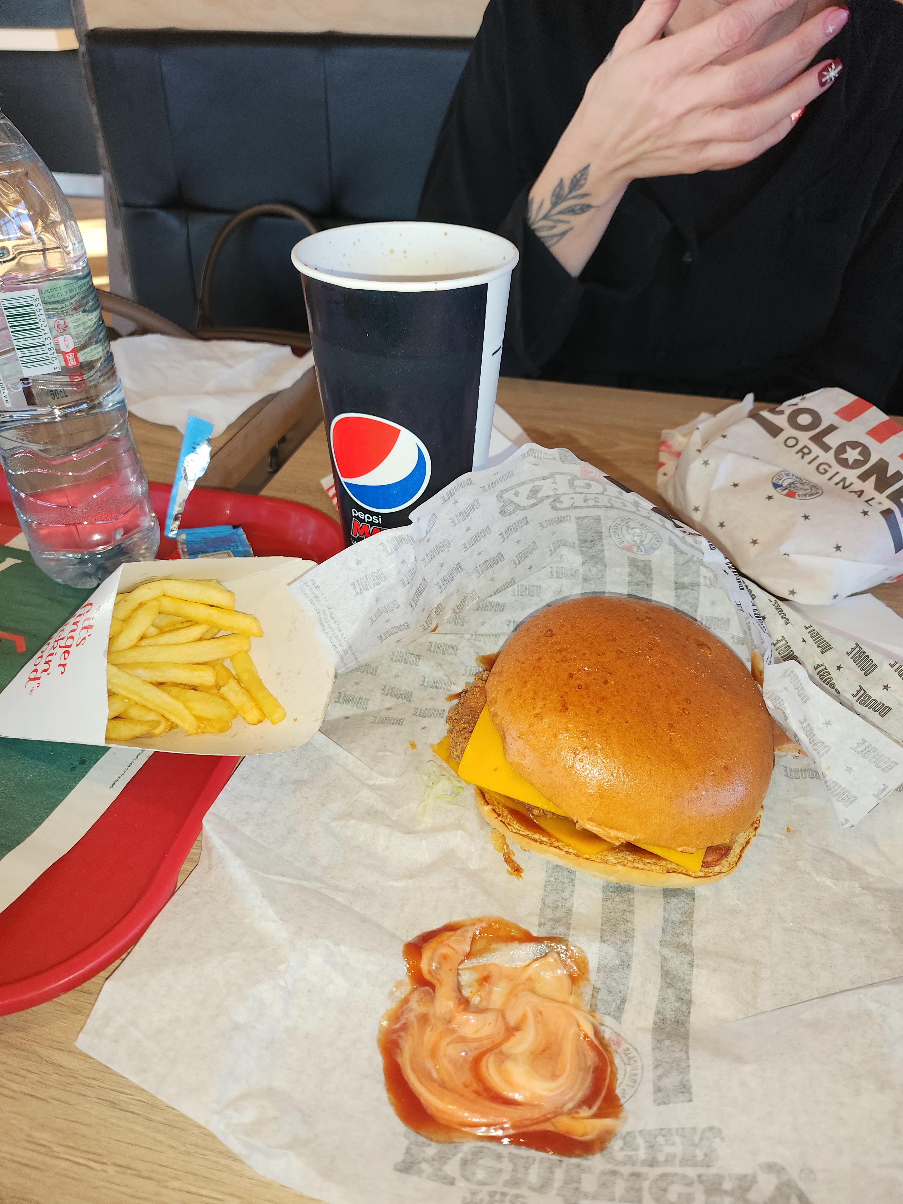 Hamburger froid, fromage non fondu , nous avons demandé de les rechauffer, c etait a nous de penser à aller les redemander alors qu l n y avait presque personne, le personnel se tournait les pouces. la salle était dégoûtante : tables non nettoyées, par terre sale ( frites, papiers gras etc...) . Au bout d un moment, le manager a envoyé quelqu un faire un peu de nettoyage, elle a nettoyé les tables avec sa main en mettant les saletés dans son autre main, pas d eponge ou de chiffon, a ramassé quelques papiers en laissant la moitié par terre . Par terre de cuisine sale. Bref, dégoûtant, pas d hygiène, personnel ,y compris le manager, mous et j en touriste. 1ere et dernière fois !