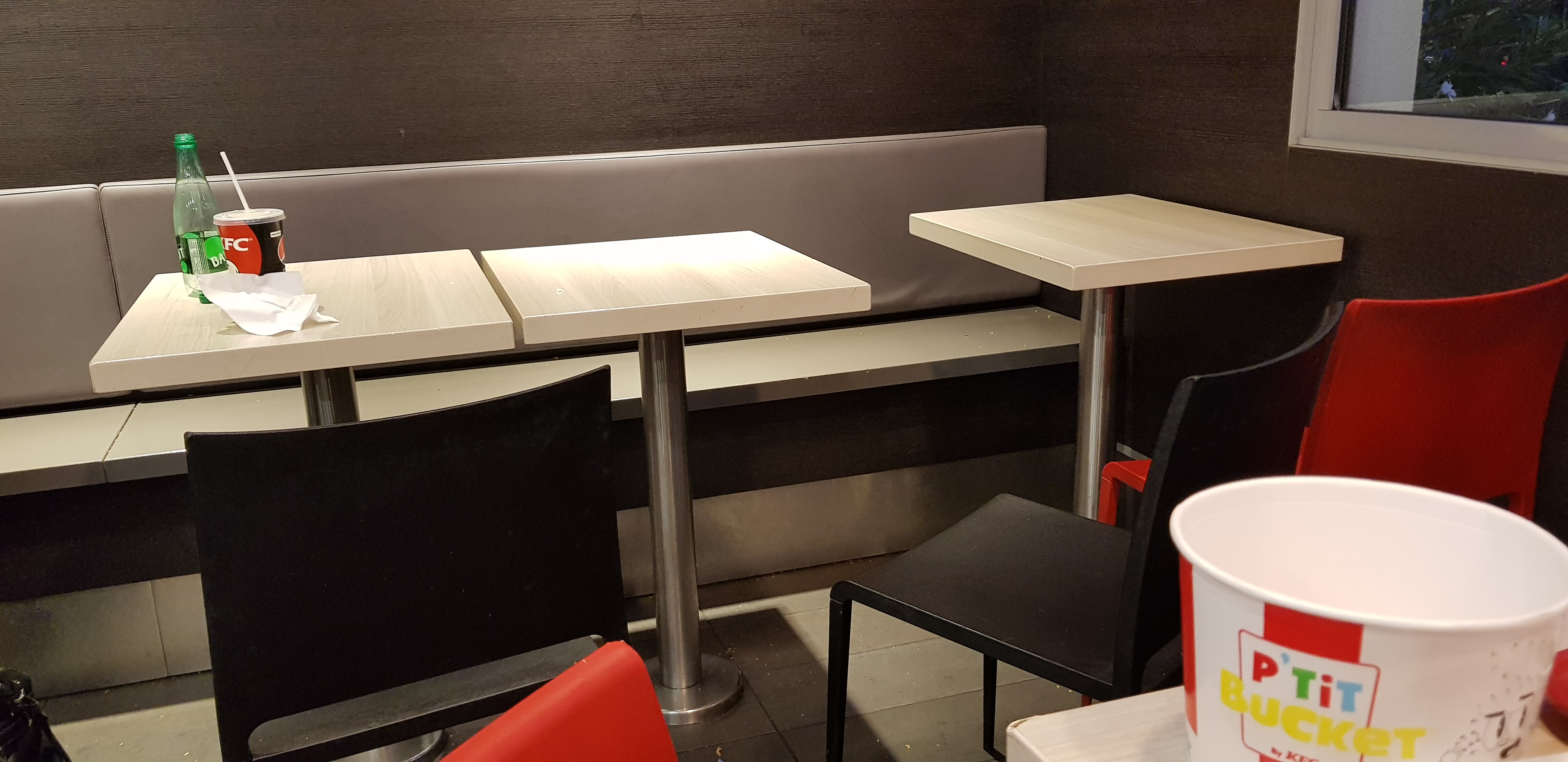 Bonsoir, je n'ai jamais ça et c'est peut dire, c'est à vous dégoûter de venir dans ce genre de lieu.. Sur tout le temps où nous sommes restés, aucun personnel de salle pour venir nettoyer les tables, nous prenons les serviettes pour pousser les déchets des clients précédents. Le sol est maculé de déchets, le mobilier est immonde et DÉGUEULASSE.. Une personne est venue en salle au moment où je poste, pour réunir les plateau et je raconte pas son entrain nonchalant... heureux de bosser.. C'est FLIPPANT FUYER, JE NE REGARDE JAMAIS, les avis des autres, j'aime bien faire mon propre opinion mais je vous laisse juger les images.. Ils ne méritent même pas d'avoir la licence KFC... JE PENSE transmettre ce poste à KFC France