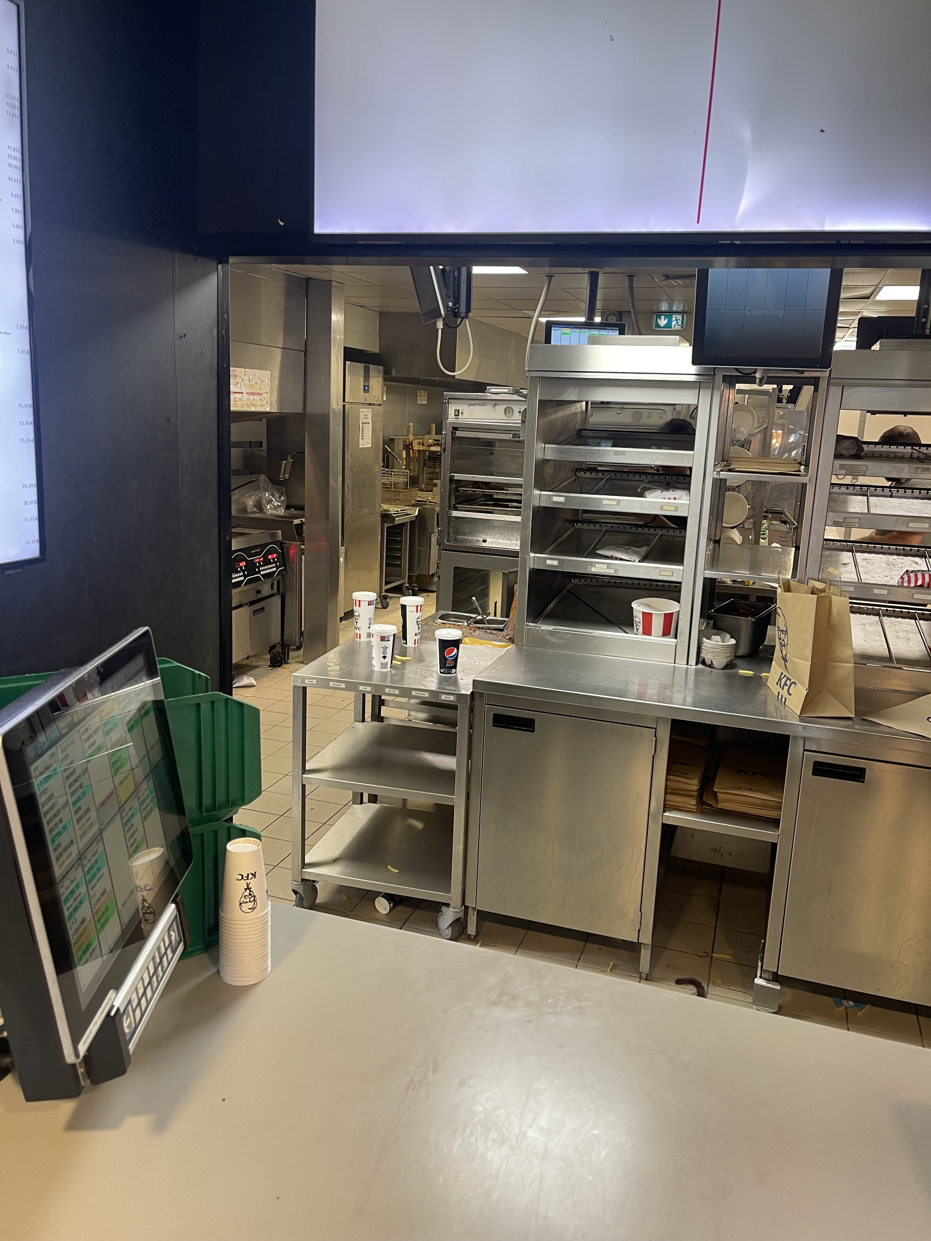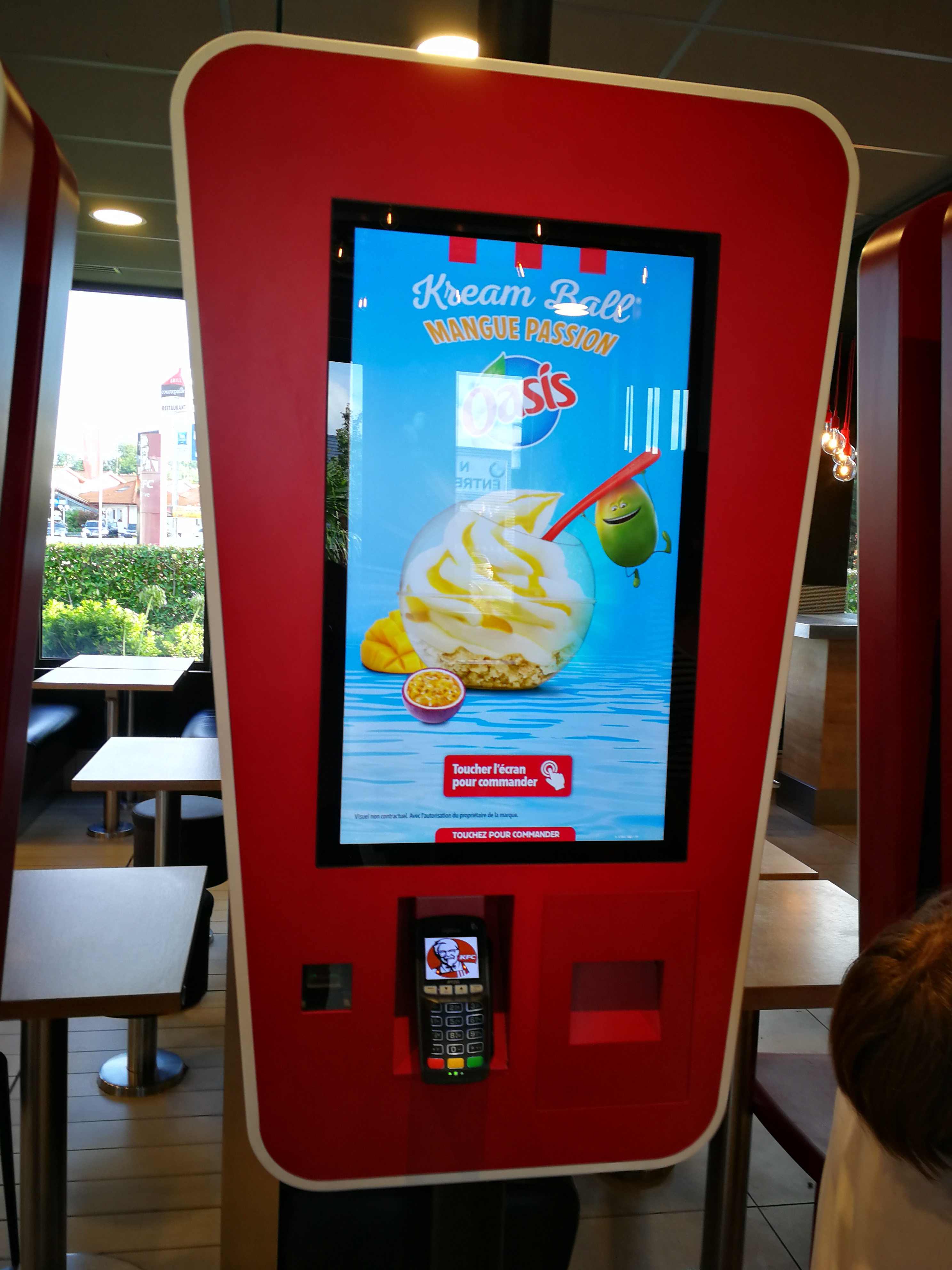 Écran tactile défectueux,à peine tu touches l'écran ça te met des sandwichs dans le panier donc vigilance +++, manque un tenders dans le menu bucket pour deux ...absence de jouet dans le menu enfant mais pas de réduction sur les menus bien sur!!! A éviter voleur et pas aimable !