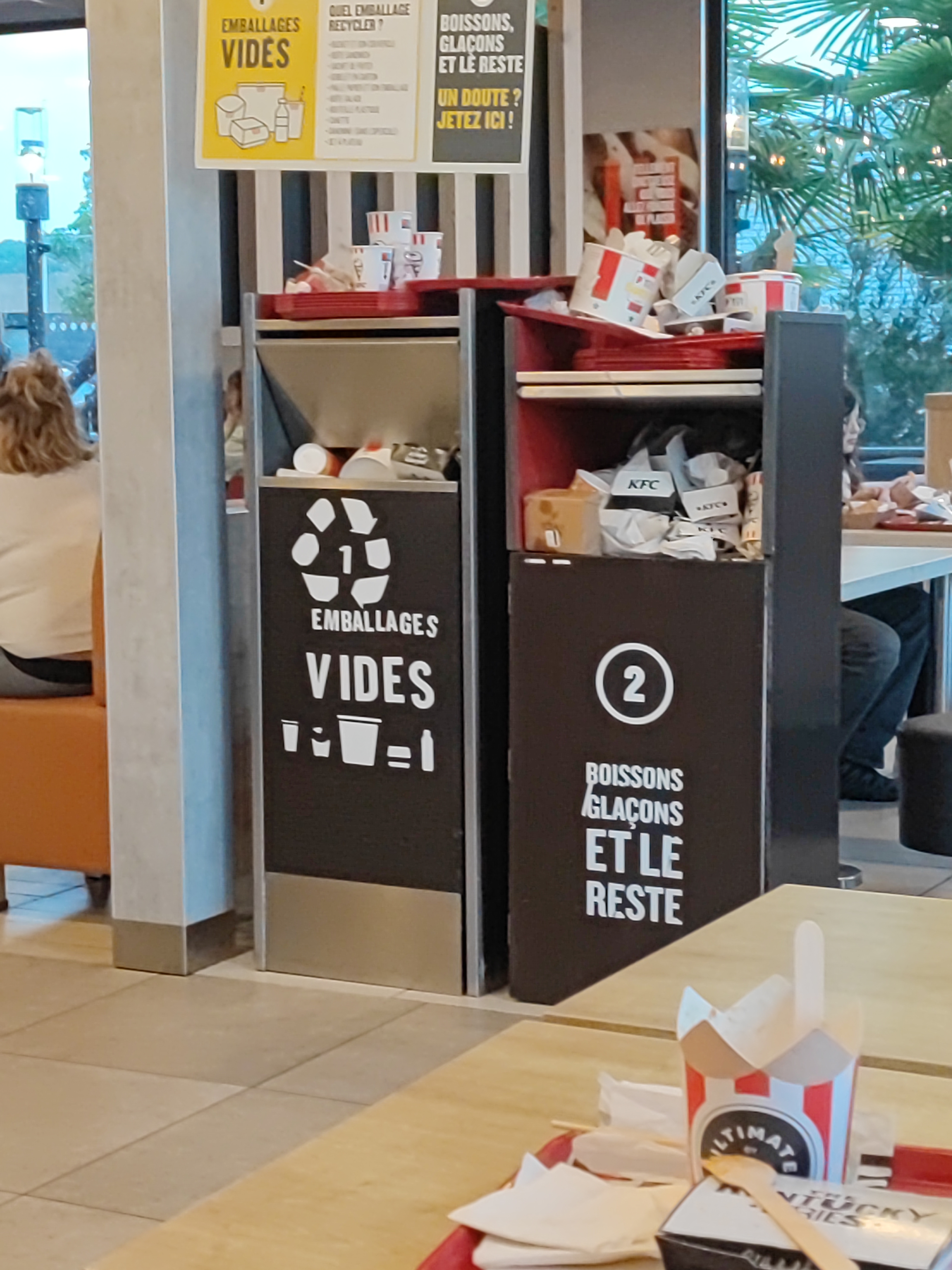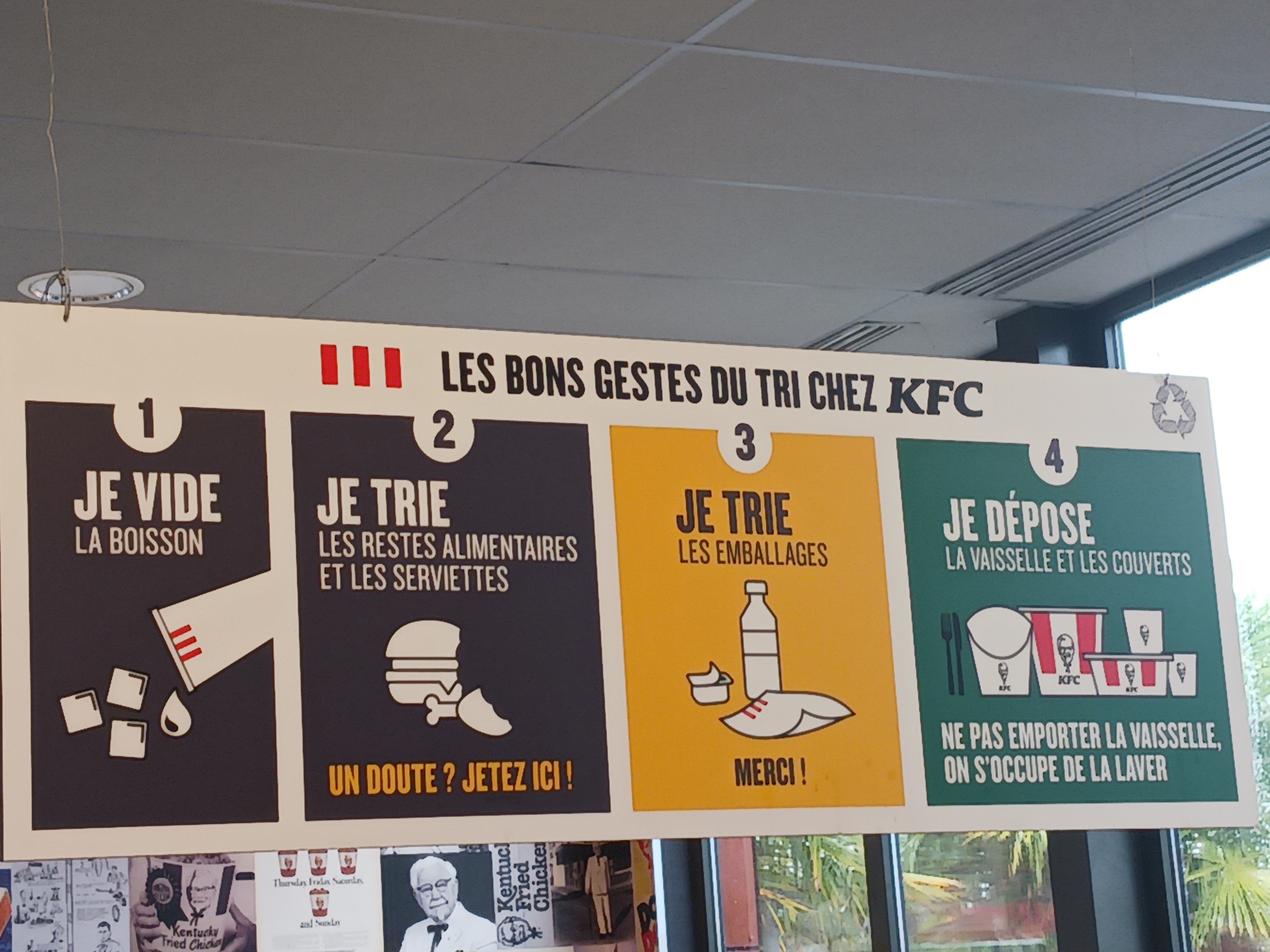 Alors au niveau de la nourriture, l'objectif y est, la nourriture est conforme aux attentes. Néanmoins, sur d'autres aspects, le KFC de Bayonne a quelques progrès à faire. J'ai été déjeuner vers 15 h 30, une personne en cuisine et une au service, des clients obligés de se manifester, car la commande a été passée il y a plus d'une demi-heure. Une fois servi et arrivé en salle, il faut choisir la table la moins sale parce que le ménage n'a pas été fait. Il sera fait par la suite partiellement sur les tables, mais pas sur le sol. Journée pluie donc peu voir pas de personnes qui mangent à l'extérieur et pourtant détritus qui jonchent le sol. De plus, depuis le 1ᵉʳ janvier 2023, les services de restauration doivent fournir de la vaisselle réutilisable lors de commandes sur place, à mi 2023, seul le plateau est réutilisable.