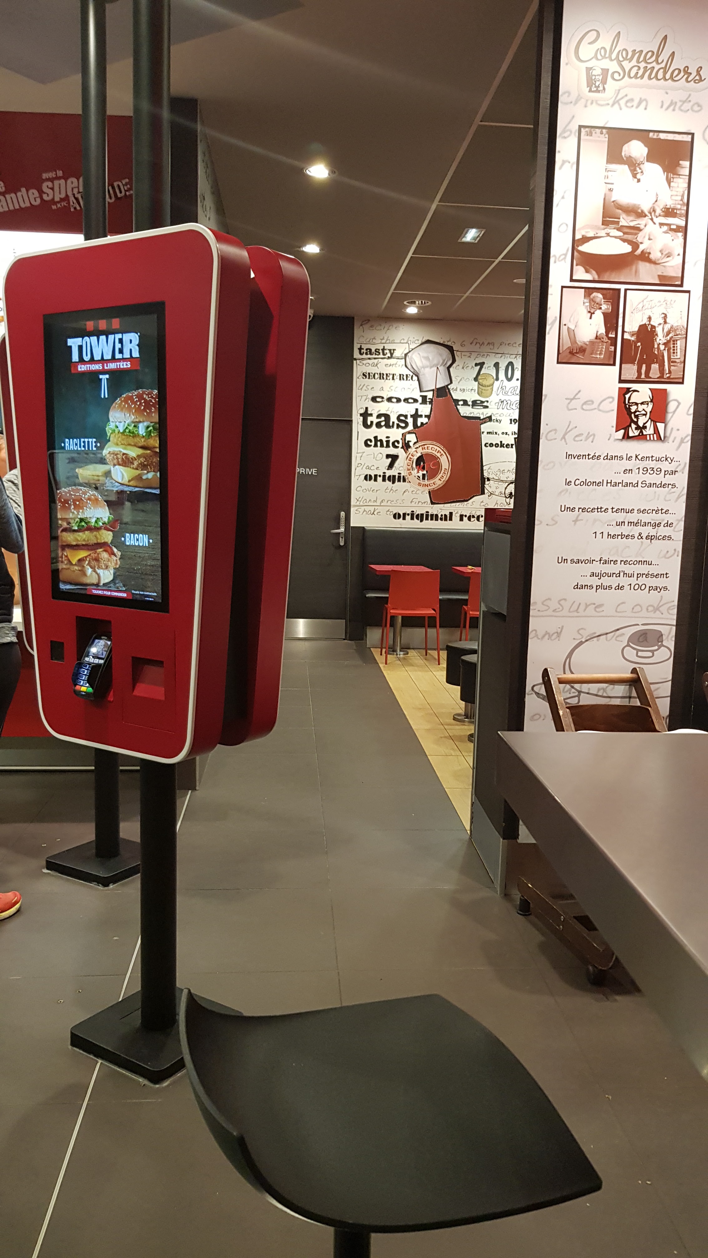 Nous en avons eu pour environ 48 euros pour 4 personnes. -> 4 Menus ; 1 crispy hotdog classic 1 burger colonel original 1 burger colonel original bacon 1 boîte de 5 tenders 1 crousti kream kitkat 1 sunday fraise 1 sunday vanille 4 boissons et 4 frites moyennes 🍟 Les burgers, le hotdog et les tenders étaient bons surtout le poulet bien tendre. La boisson à volonté. Il ne faut pas être un mangeur car un burger ou hotdog, c'est juste. Les frites congelées toutes fines comme au McDo, pas top. Les tables n'étaient pas nettoyées et les tabourets ne sont pas pratiques, on a dû garder nos manteaux sur les genoux.