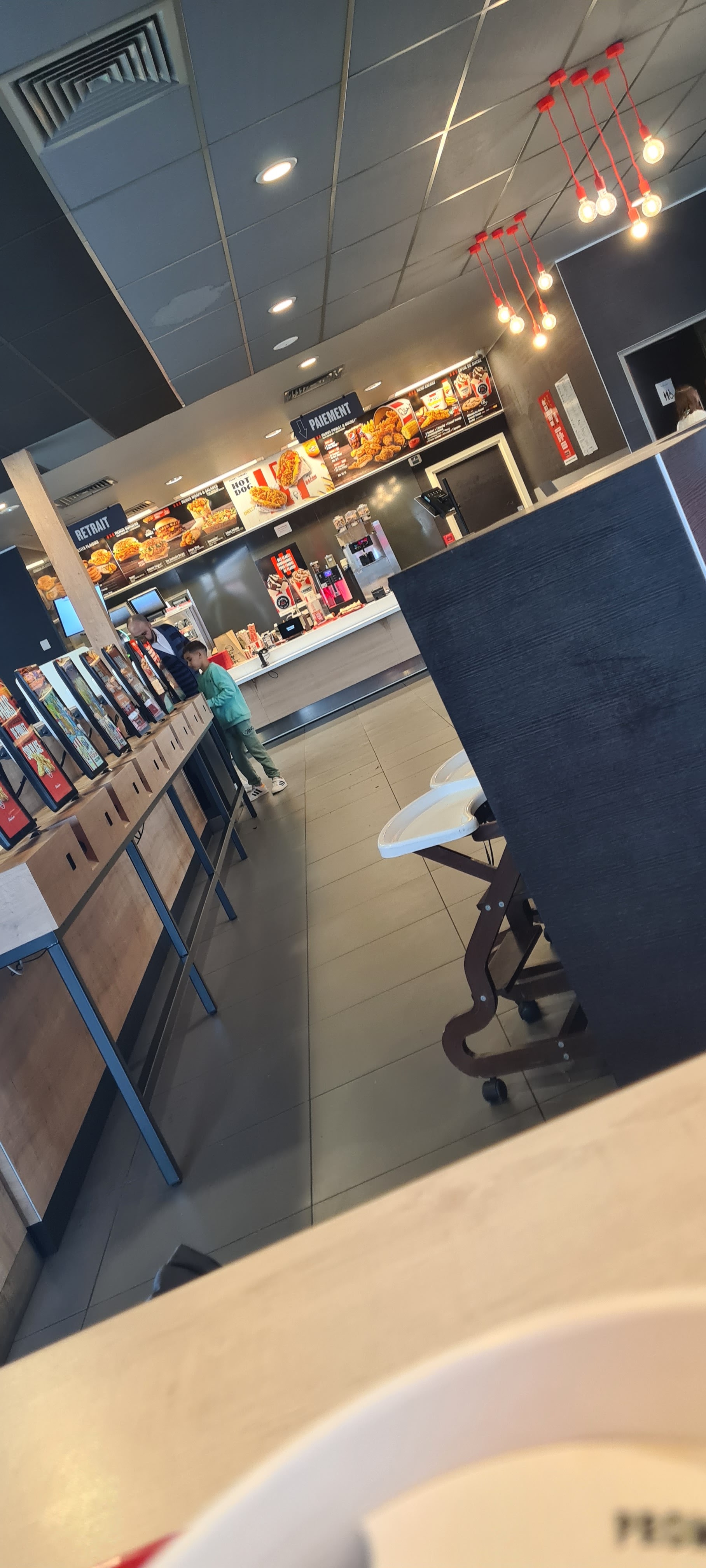 KFC très bon et produit très bien fini, l'insonorisation de l'espace jeu pour enfant coupe un peu l'envie de rester manger sur place, tables et assises assez sale du passage présents des personnes ( mais étant passé à 12h30 un mercredi c'est compréhensible vu le rush qu'ils ont à faire)