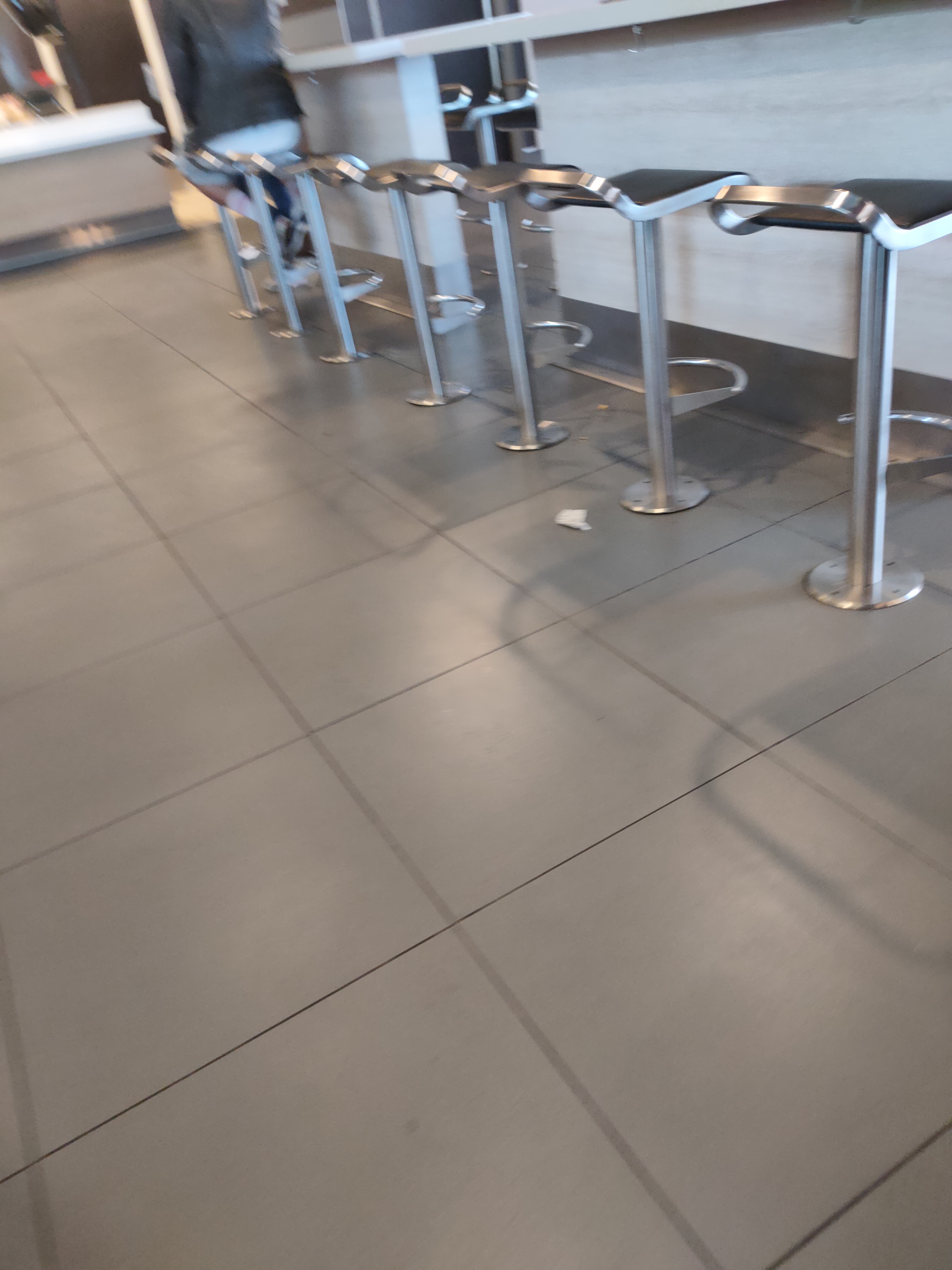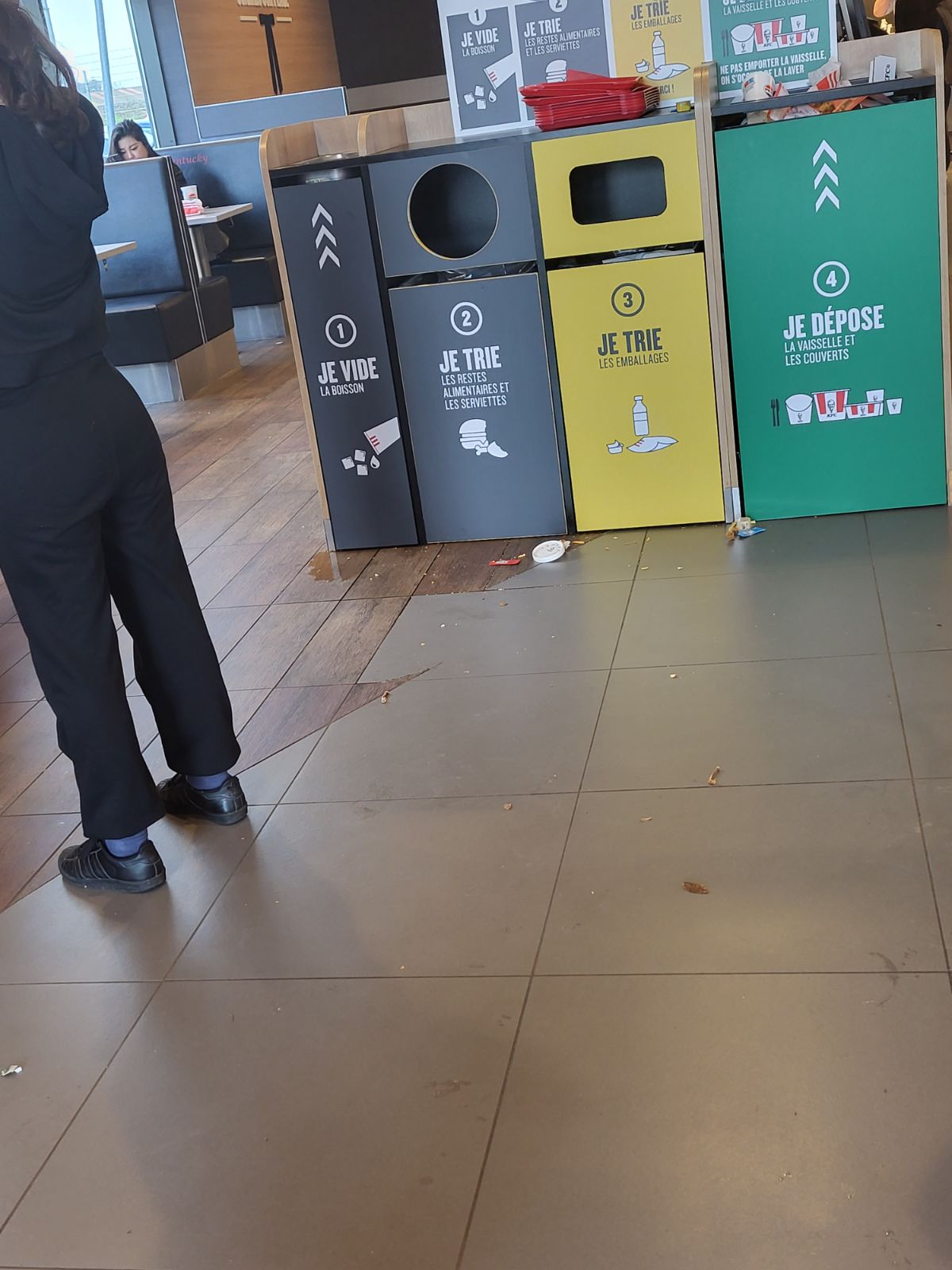 C est sale, tables, sol, poubelles. Il était 15 heures et le personnel derrière le comptoir ne s active pas....ça glande.