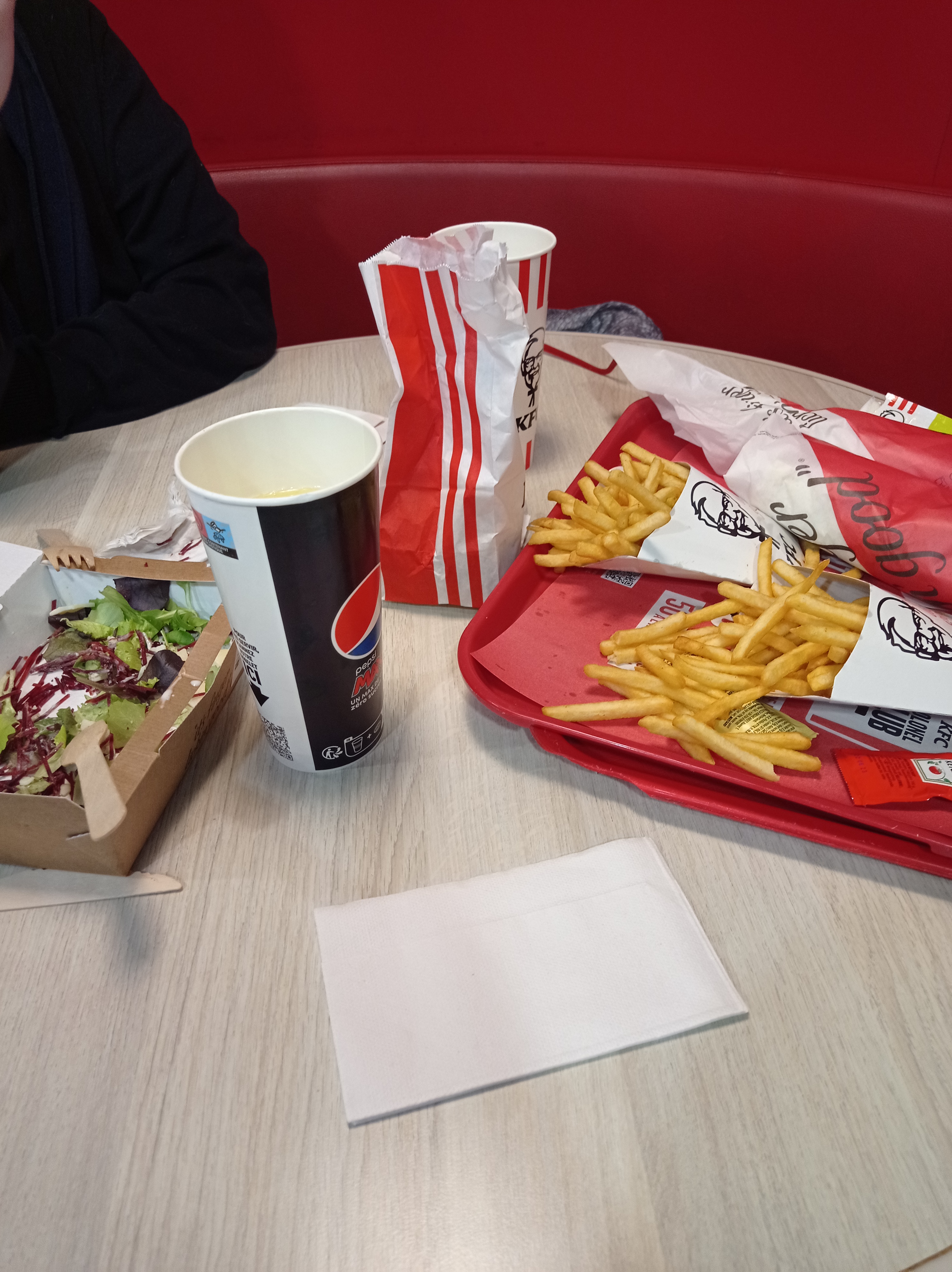 Pour les connaisseur c'est une Chaîne de restauration rapide offrant des morceaux ou sandwichs de poulet frit avec accompagnements variés. Commande à la borne automatique et nous avons attendu un petit peu quand même. On a même trouver ça assez long. Ça arrive dans ces restaurants aussi... Les toilettes qui pour info se trouvent à l étage étaient pas super propre, quand à lui le restaurant l était. Les nouvelle pailles ont fait leur apparition. On se sert au goblete via le distributeur pour les gens qui mangent sur place