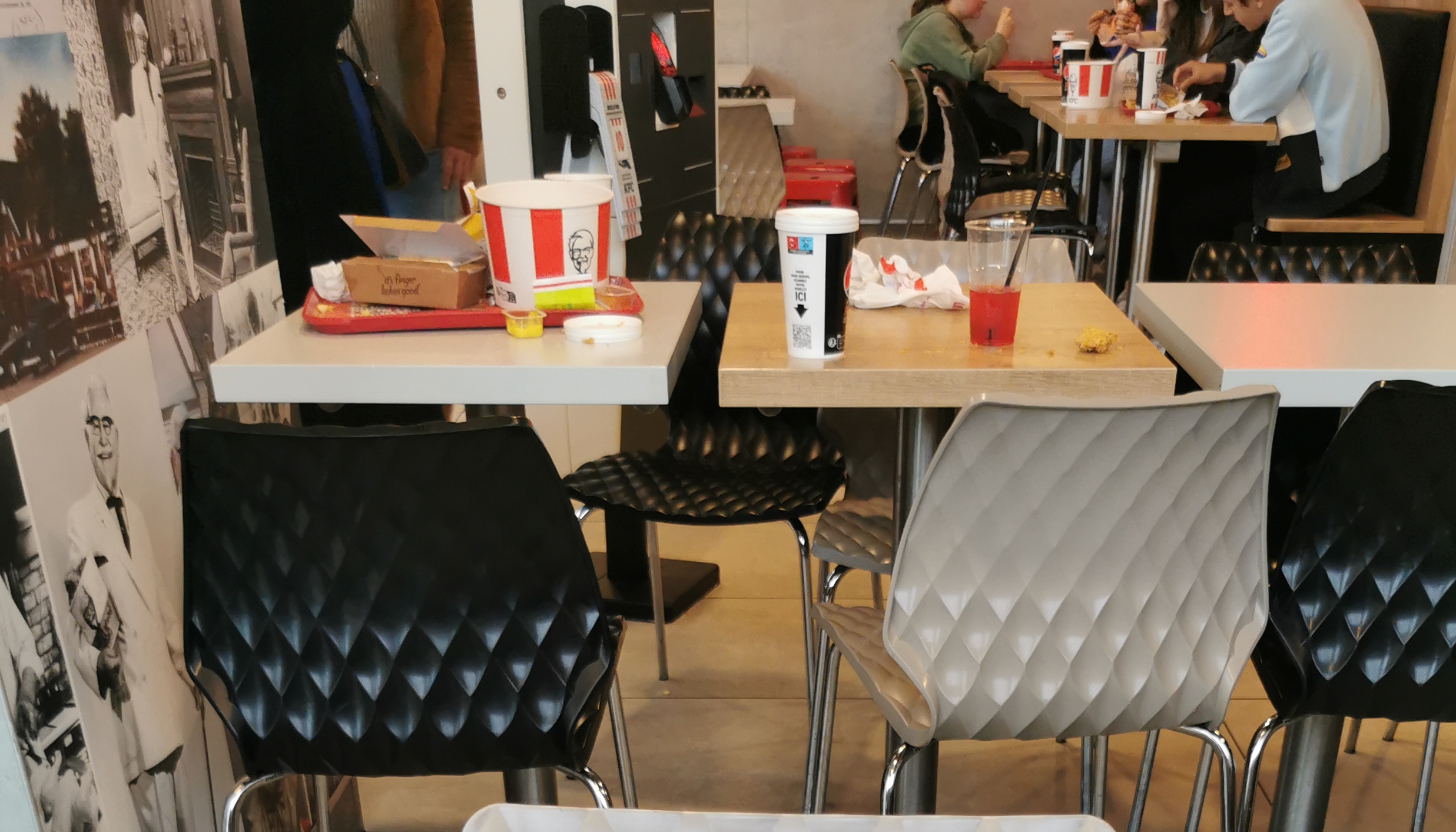 KFC manquant de propreté alors qu'il n'y avait personne. De plus, j'ai attendu environ 20min et tout ça pour qu'il manque des frites. Le burger était froid et le temps d'attente interminable sur une chaise collante. Aucun geste commercial.