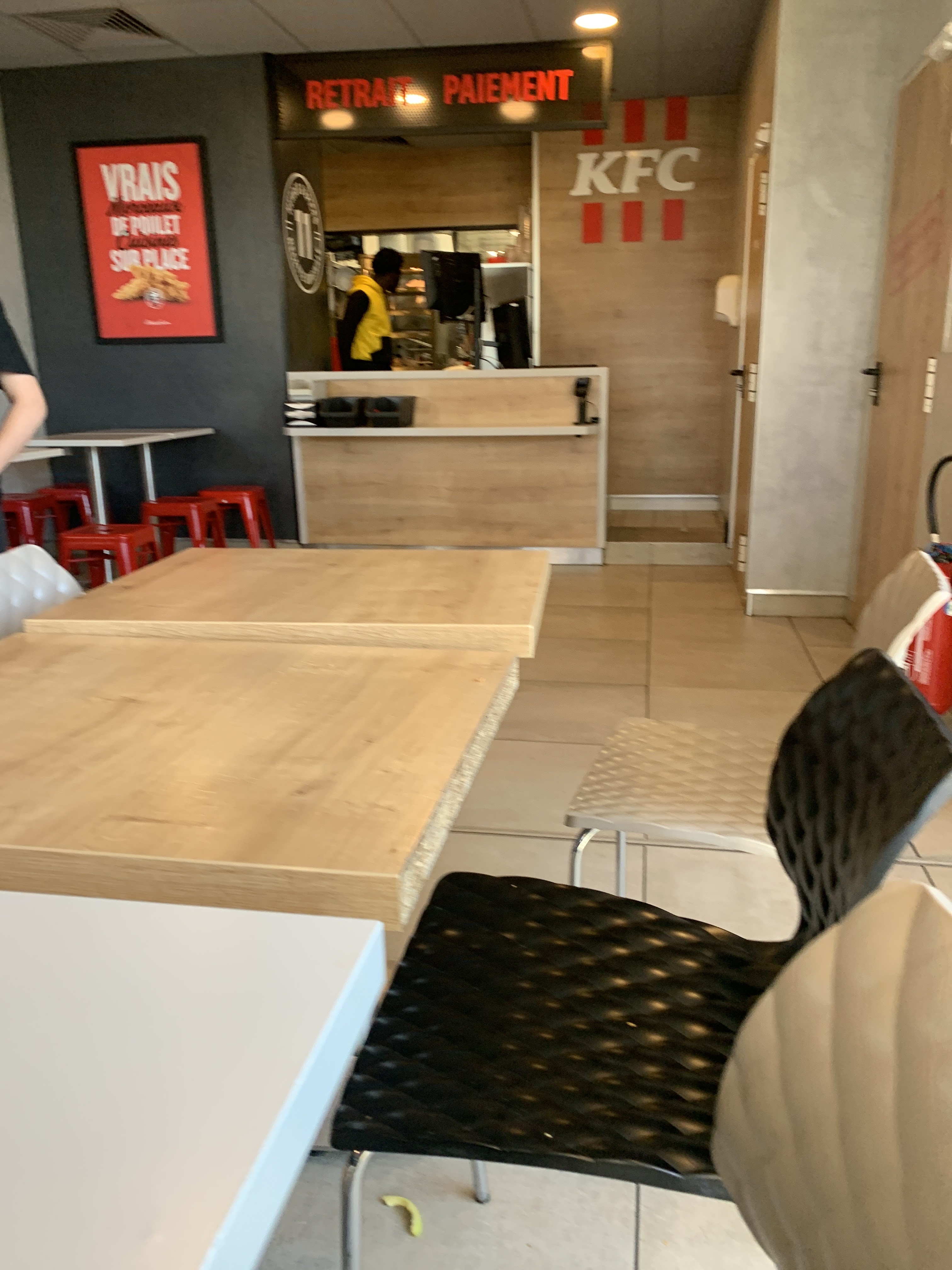 Un KFC comme un autre mais ... les tables sont rarement nettoyées et honnêtement placer un écran à l´extérieur avec les numéros de commandes en cours permettrais d´attendre dehors sans être entassé entre le comptoir, les bornes de commandes et les toilettes.