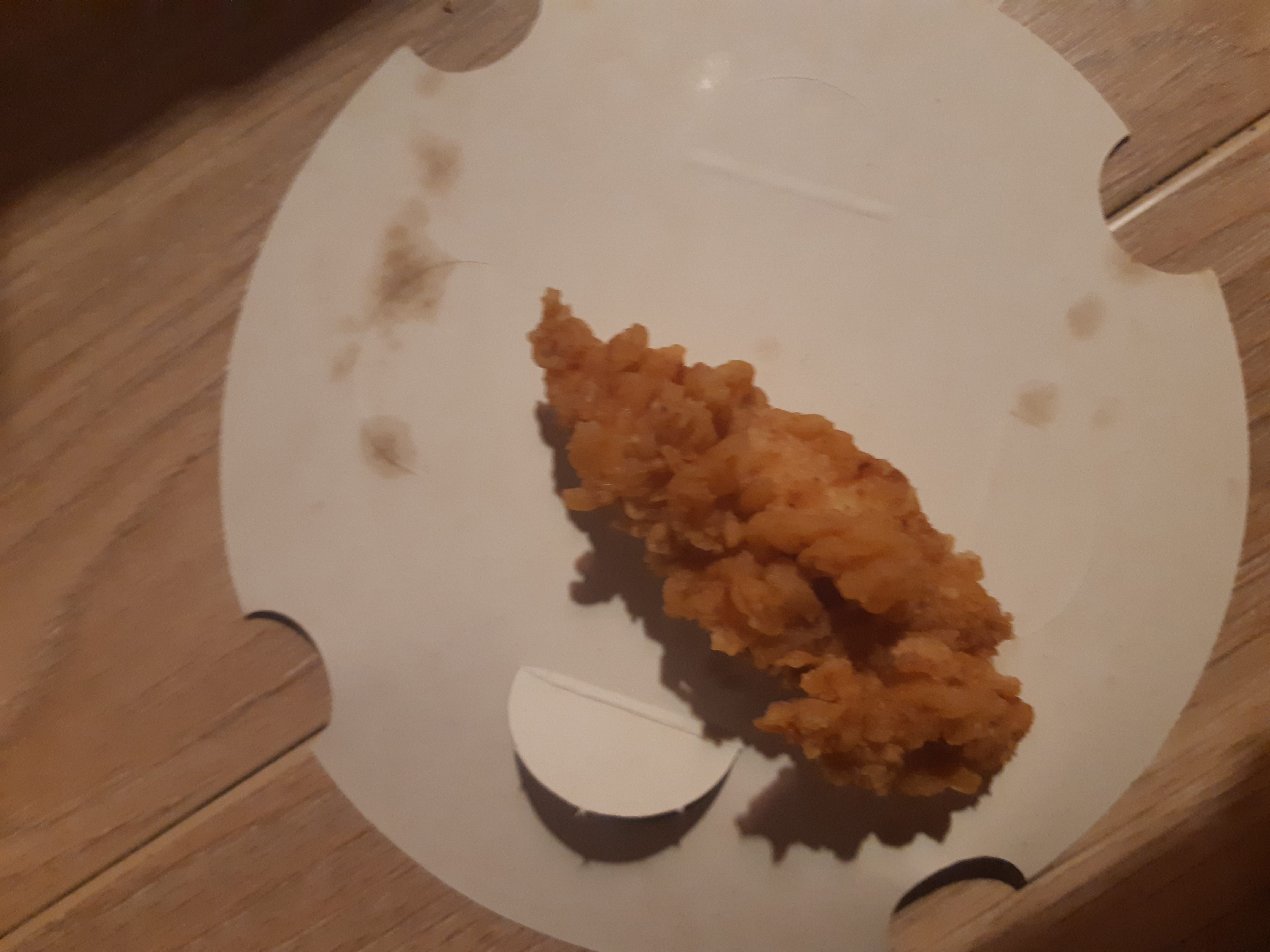 Froid et dur. On a été servis très vite comparé à d’habitude ( environ 5 min ) mais le poulet étais froid, sec et dur; les frites étais une sur trois chaude; les sauces étais mal répartis et trop concentré donc un peut écœurant sur ces bouchée la; l’odeur étais un peut celle d’une seconde cuisson. on attendais pas mal parce que KFC est bon d’habitude mais celui ci est vraiment pas bien. ils auraient pus nettoyer les tables aussi il n’y avais pas tant de monde
