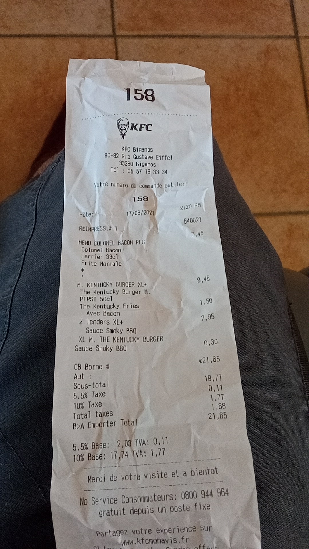 Aller au KFC ce lundi, vomi au moins 50 fois dans la nuit intoxication alimentaire. Arrêt d’une semaine, perdu 4 kg, si vous voulez une perte de poids express foncez ! Bon plan A FUIR