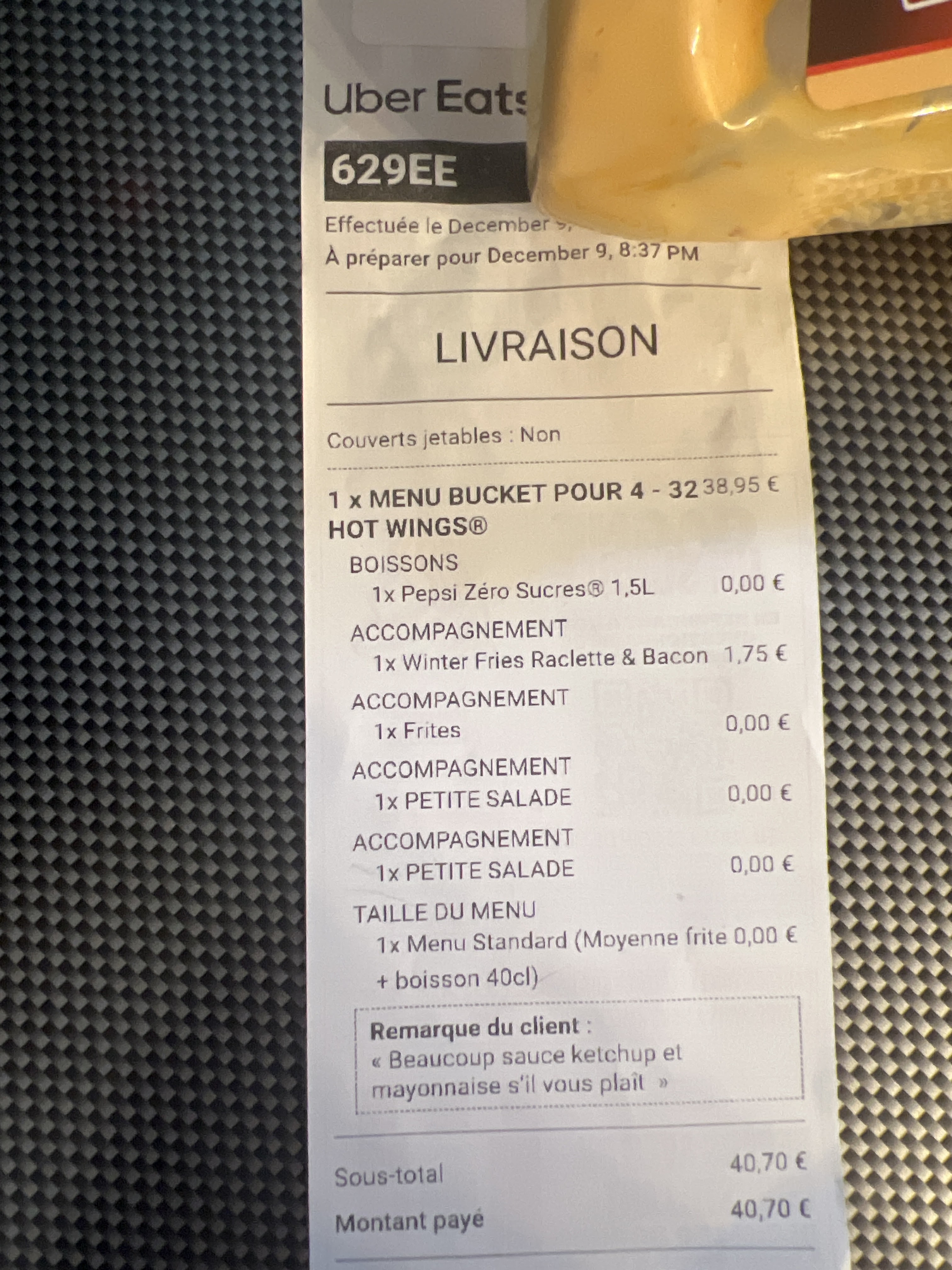 Commande vers uberEAT 629EE, la commande a été livré avec aucune sauce et il manque une frite! Commande très mal soigné!!! Téléphone non joignable! Equipe zero efficace!!! C’est le seul KFC à Bobigny donc on a pas de choix de laisser mal traité!!!!!