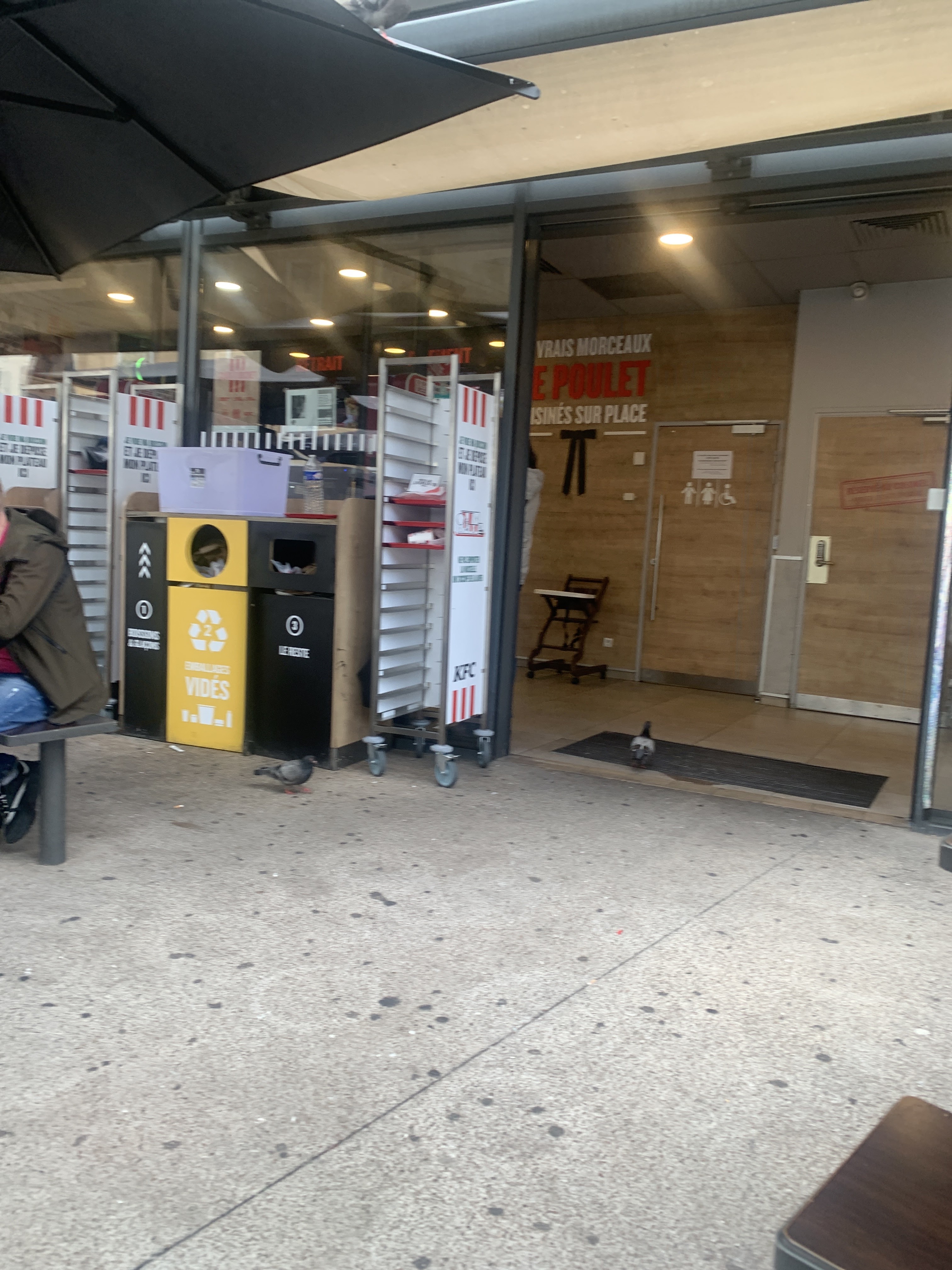 Un KFC spécial pigeons 🐦 Il faut que vous trouviez une solution c’est degeulasse ! En plus de ça le manager ce jours là parler un peut grossièrement : « c’est bien bravo on c’est fait déchirer la balle » en parlant à son équipe assez lente.. et aussi « wesh », soyez pro et éviter de parler ainsi on n’a pas besoin de le savoir. Pour en revenir aux pigeons, une cliente et devant les yeux c’est fait attaquer son plateau de nourriture par tous les pigeons ! Elle avait juste fait un aller retour à l’intérieur du restaurant. Je ne pense pas revenir ici bien qu’il soit pratique (mais un peut cracra)