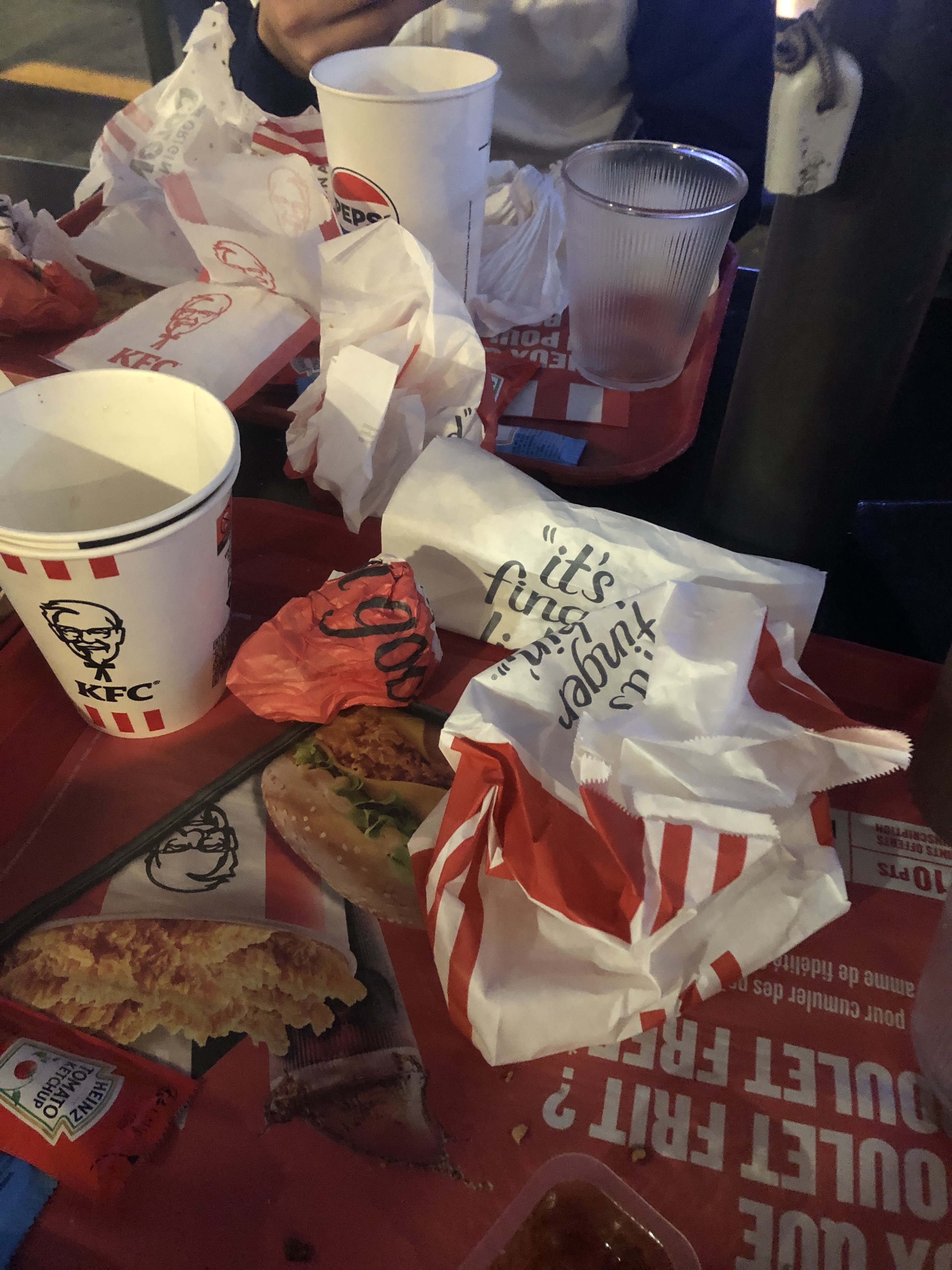 Restaurant très sale accompagné de pigeons dommage car j'adore vraiment le KFC ,mais c'est flippant les poubelles débordante à toutes heures, sous effectif où employé négligé,je ne sais pas.