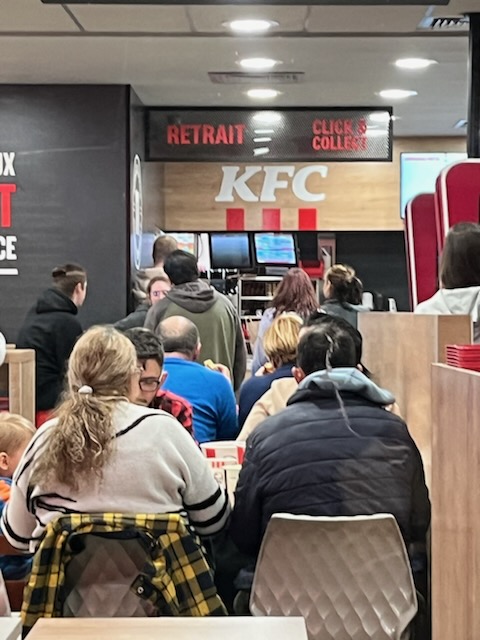 Attente trop longue . Personnels qui rigolent tous entre eux mais pas un bonjour aux clients . Toilettes digne d une autoroute… même si le KFC a été refait c est toujours aussi sale !!!! dommage pourtant c est bon …on ira à popeye maintenant….