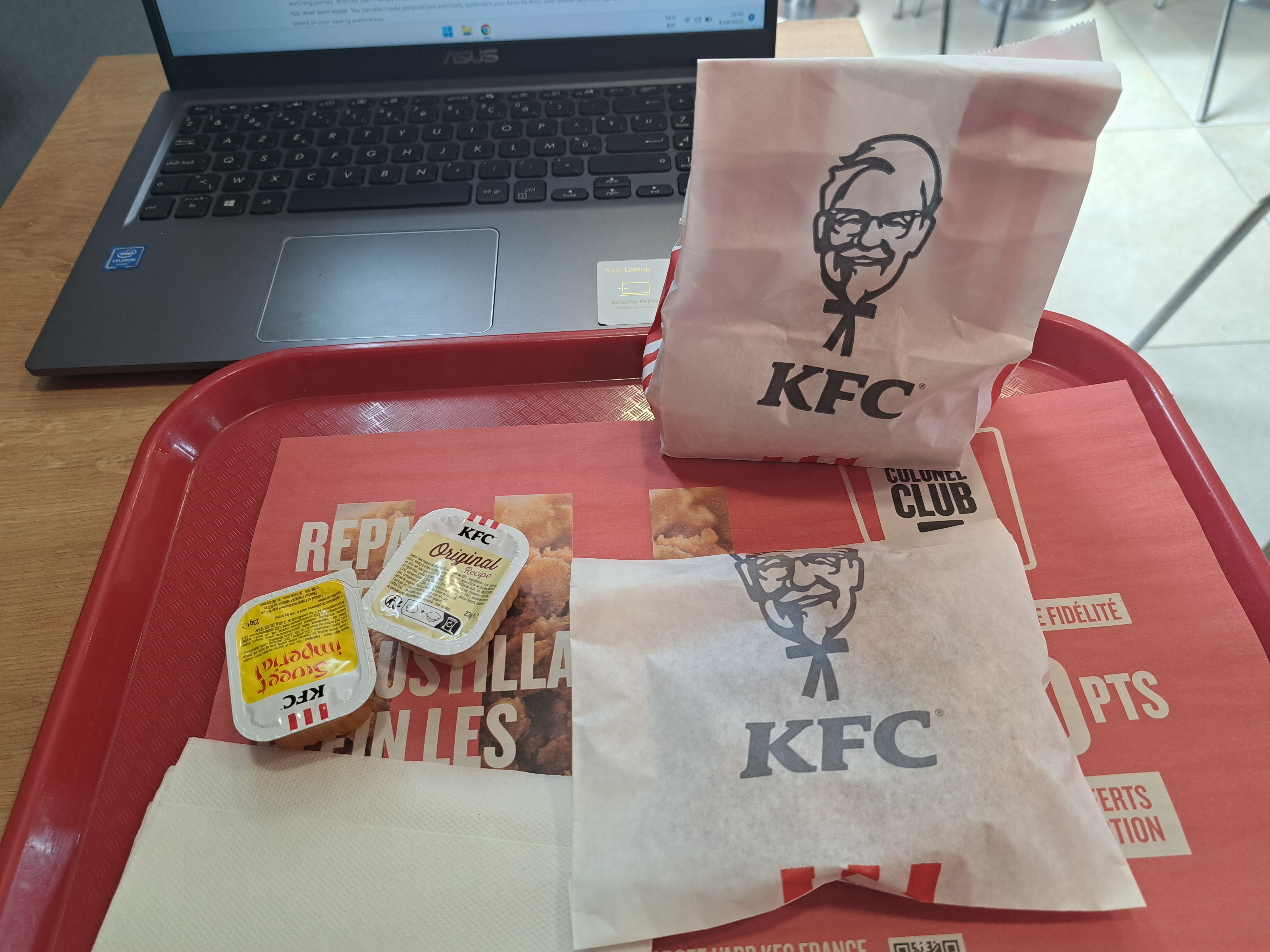 J ai commandé un colonel original bacon, le poulet était trop sec surtout sur les bords et au milieu toute la sauce c est pas très agréable à manger. En plus mes frites était froide. Franchement je suis déçu ...