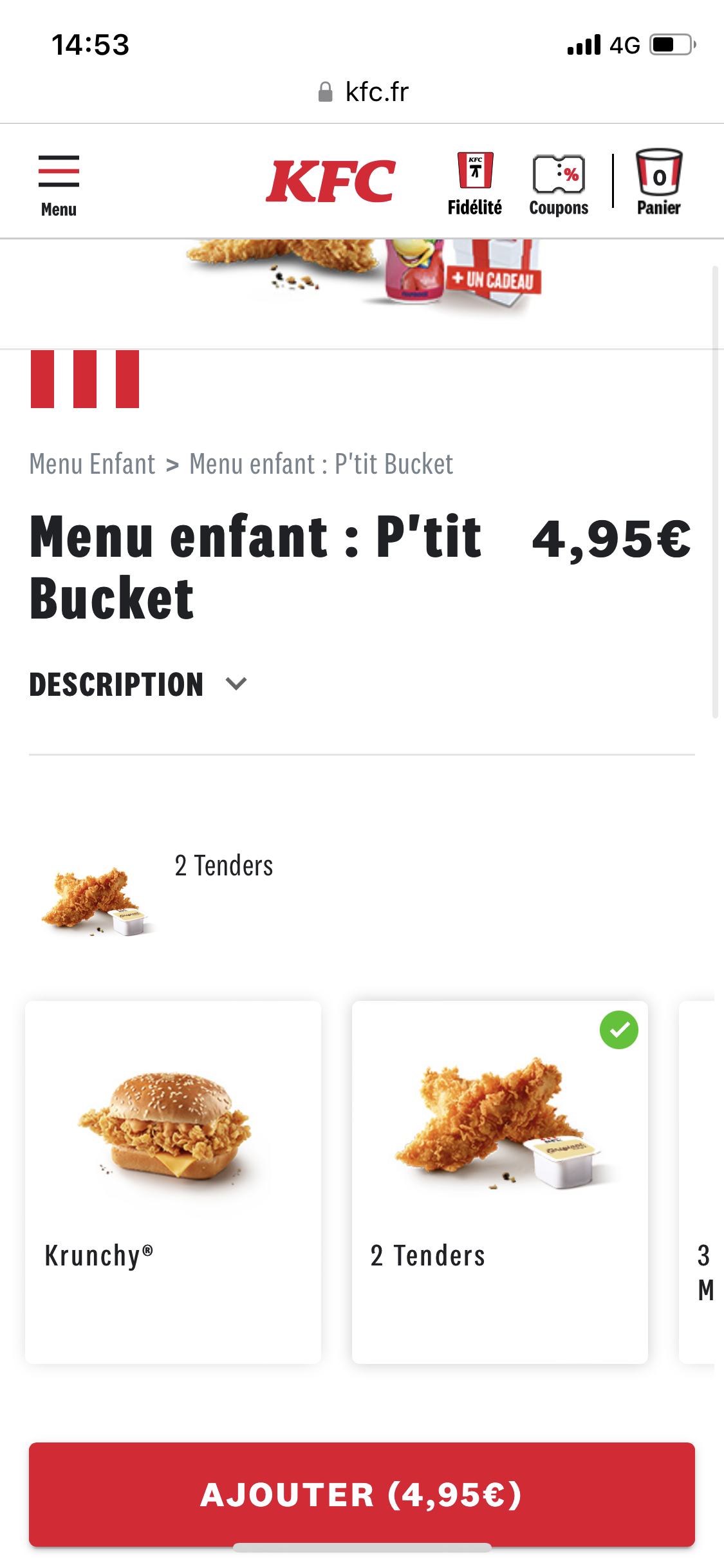 Mérite 0 étoile ! Pour le menu enfant j’ai pris les 2 tenders on nous dit que y’a pas de sauce dans le menu enfant alors que si preuve photo(la photo viens du kfc de osny et du site quand on commande à cergy même en click and collect ) PREUVE QUE IL Y A UNE SAUCE sur la photo non !? On nous donne pas le jouet ensuite frites froides et le personnel très aigrie voir hautaine ( une jeune femme d’une vingtaine et brune à la caisse). Les prises ne fonctionnent pas ! Les tables salles pas nettoyés , sol qui colle et toilette déplorable ! A fuir