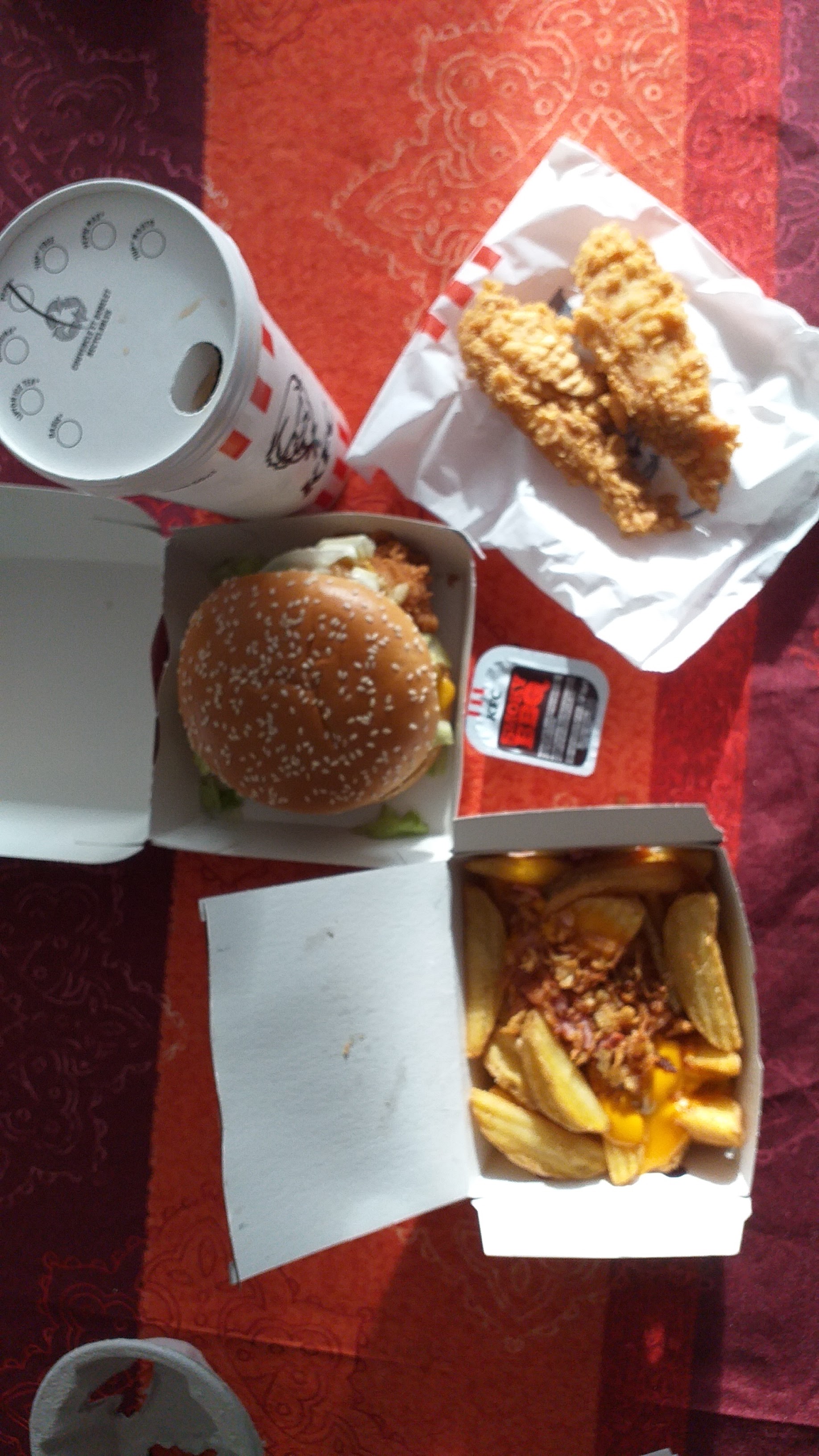 Cela reste du KFC commande complète ( en même temps peu de monde dans le restaurant ) mais préparer vous à garder votre blouson pour manger il fait plus froid dedans que dehors!!!!