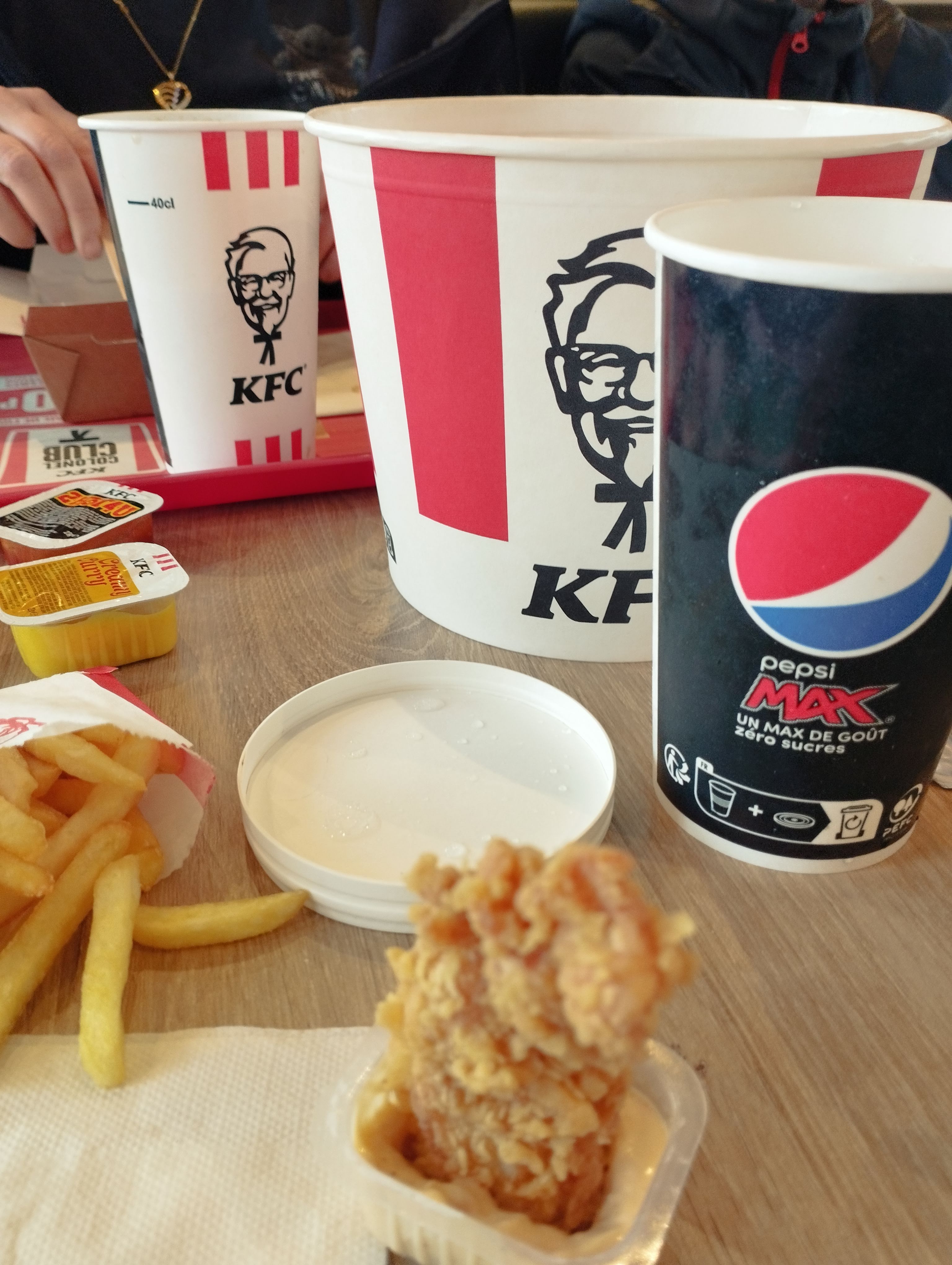 Franchement pas grand chose à dire, c'est un KFC pas trop mal, les burgers sont excellents et les frites bien chaudes. Par contre vous auriez grand besoin qu'une personne fasse du nettoyage entre 2 rush car pour être venu à 17h à un moment plutôt calme c'était clairement degueux de partout ! Pas une banquette ni une table de propre pour manger sur place, le sol est jonché de déchets...