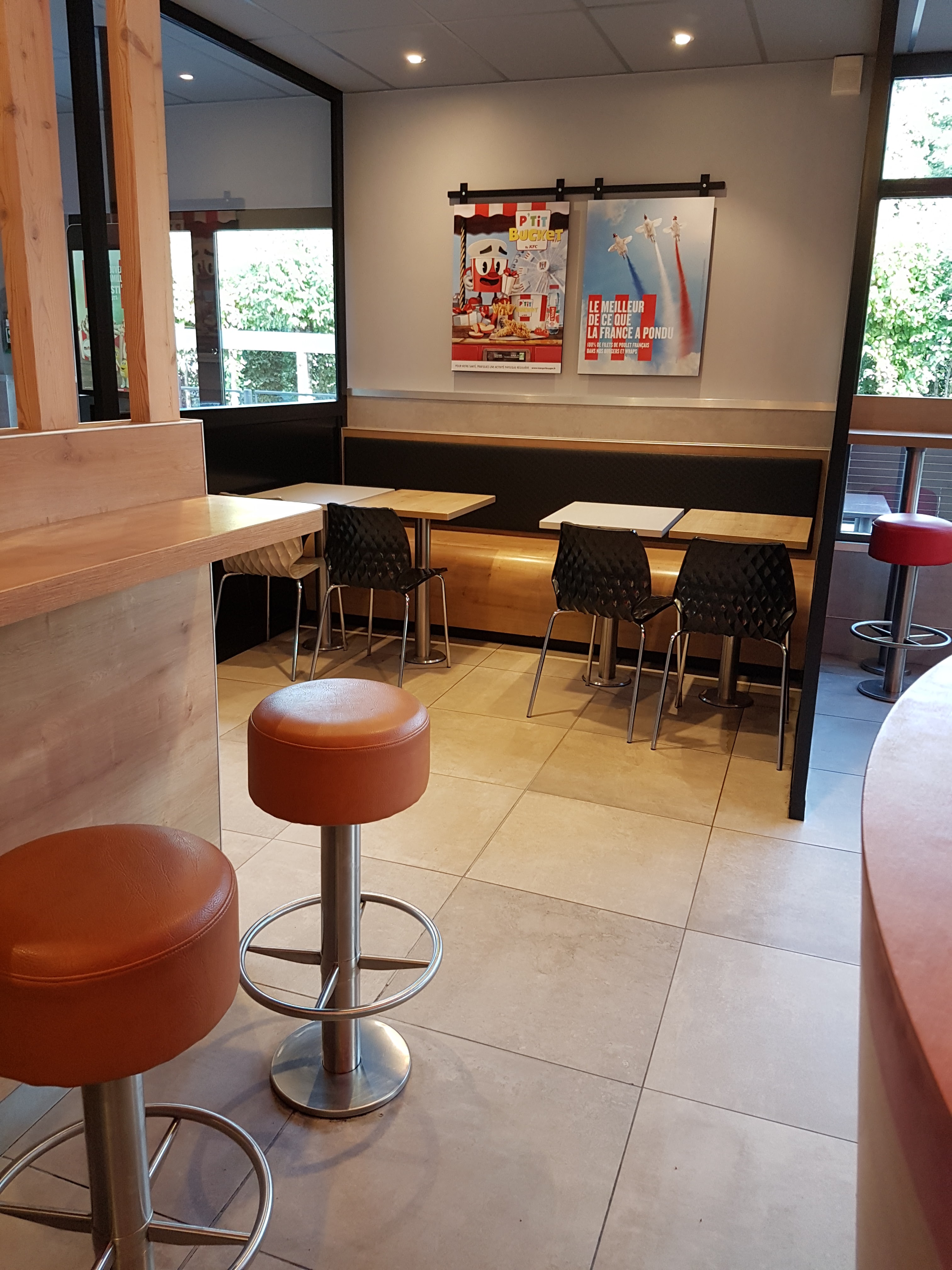 Bonne surprise! Service ultra rapide et appliqué car pour une fois il ne manque rien et l équipier s est même approché de nous pour savoir si tt allait bien! Néanmoins cela ne mérite pas encore toute les étoiles car les assises dont les banquettes avec le bord en arrondi sont vraiment de mauvaise qualité et particulièrement pas étudiées pour recevoir des enfants.