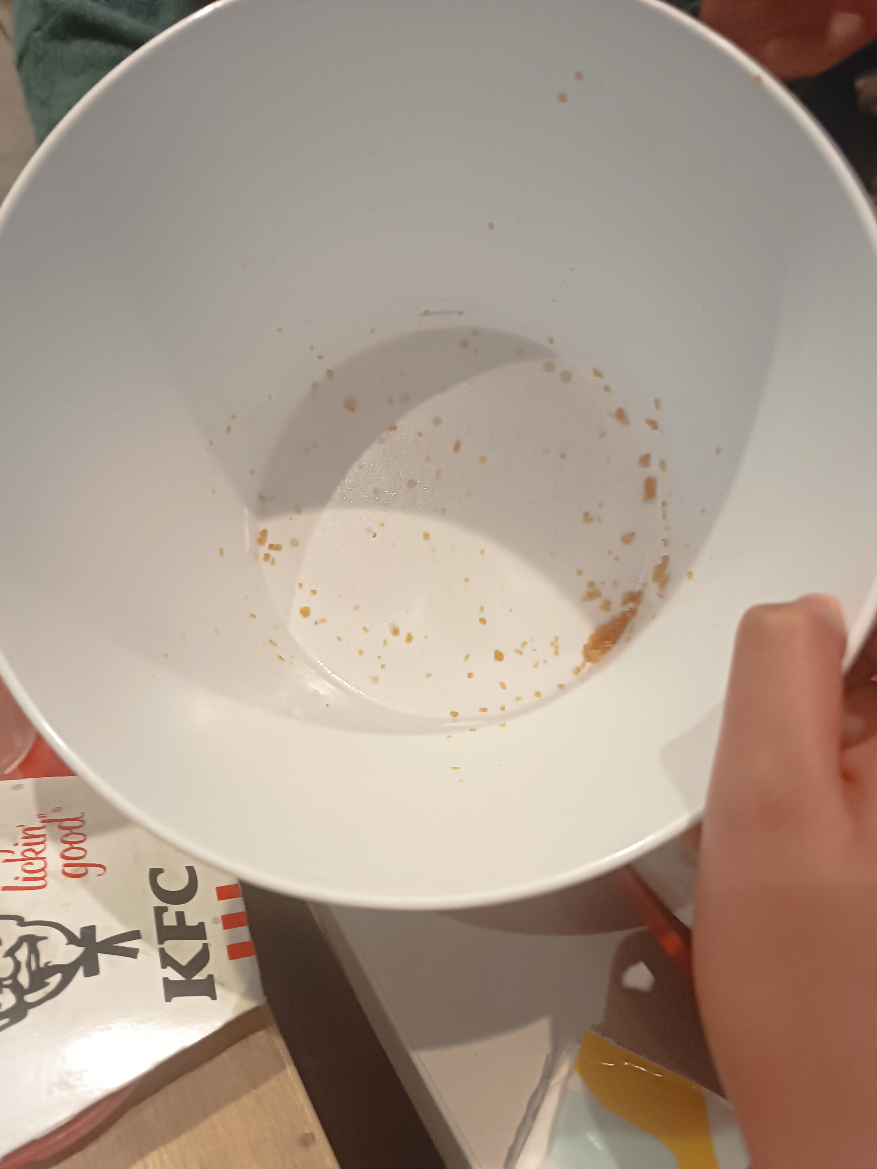 je suis tombé malade et la chapelure c'est du béton armé a s'en casser les dents le poulet en seau était horrible pourtant les tenders dans le wrap étais ok donc je soupçonne KFC de congeler décongeler (ou autres choses du genre) les tenders en bucket ce qui est gravissime si c'est le cas je peux que mettre une étoile