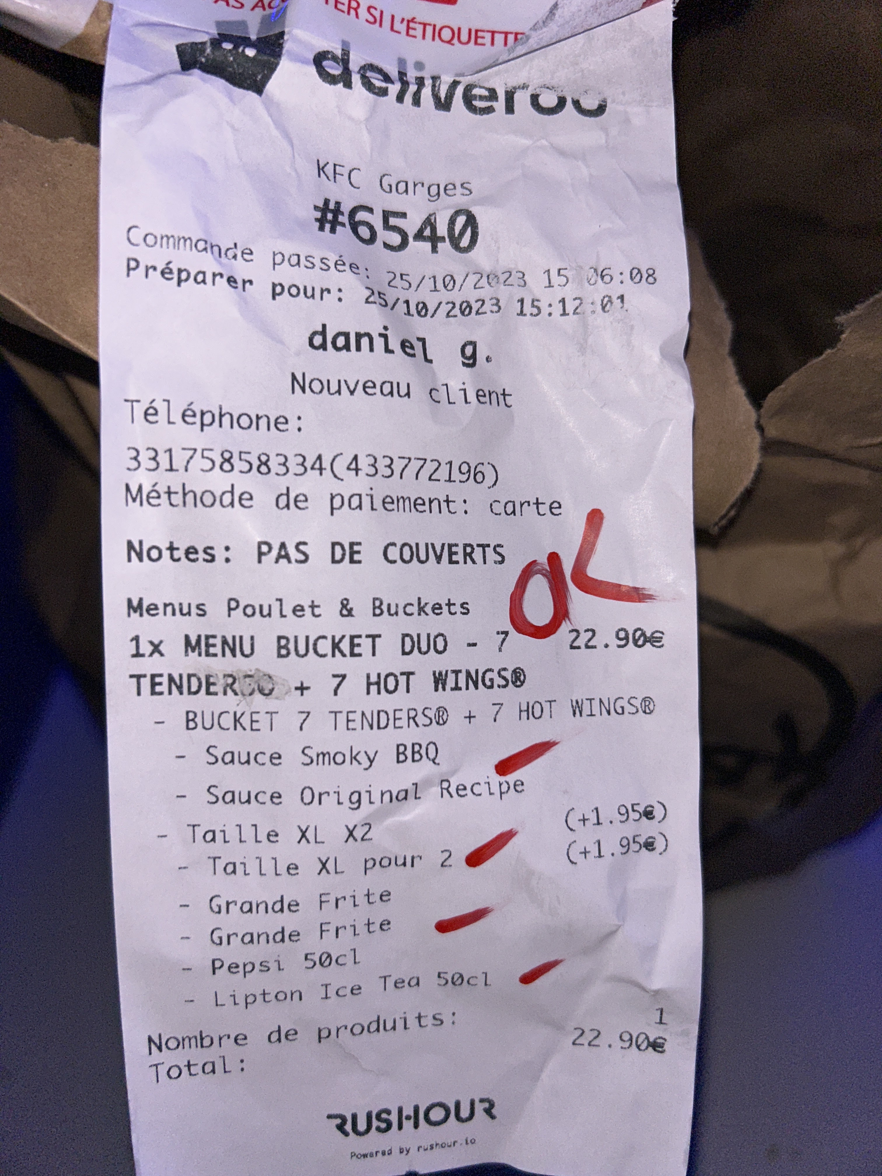 Nous avons commandé un bucket mais une fois arriver dans mon parking le sac en carton ( vraiment pas solide ) s'est déchiré et tout est donc tombé par terre. Nous y sommes retournées et ils nous ont refait le menu gratuitement bien évidemment.