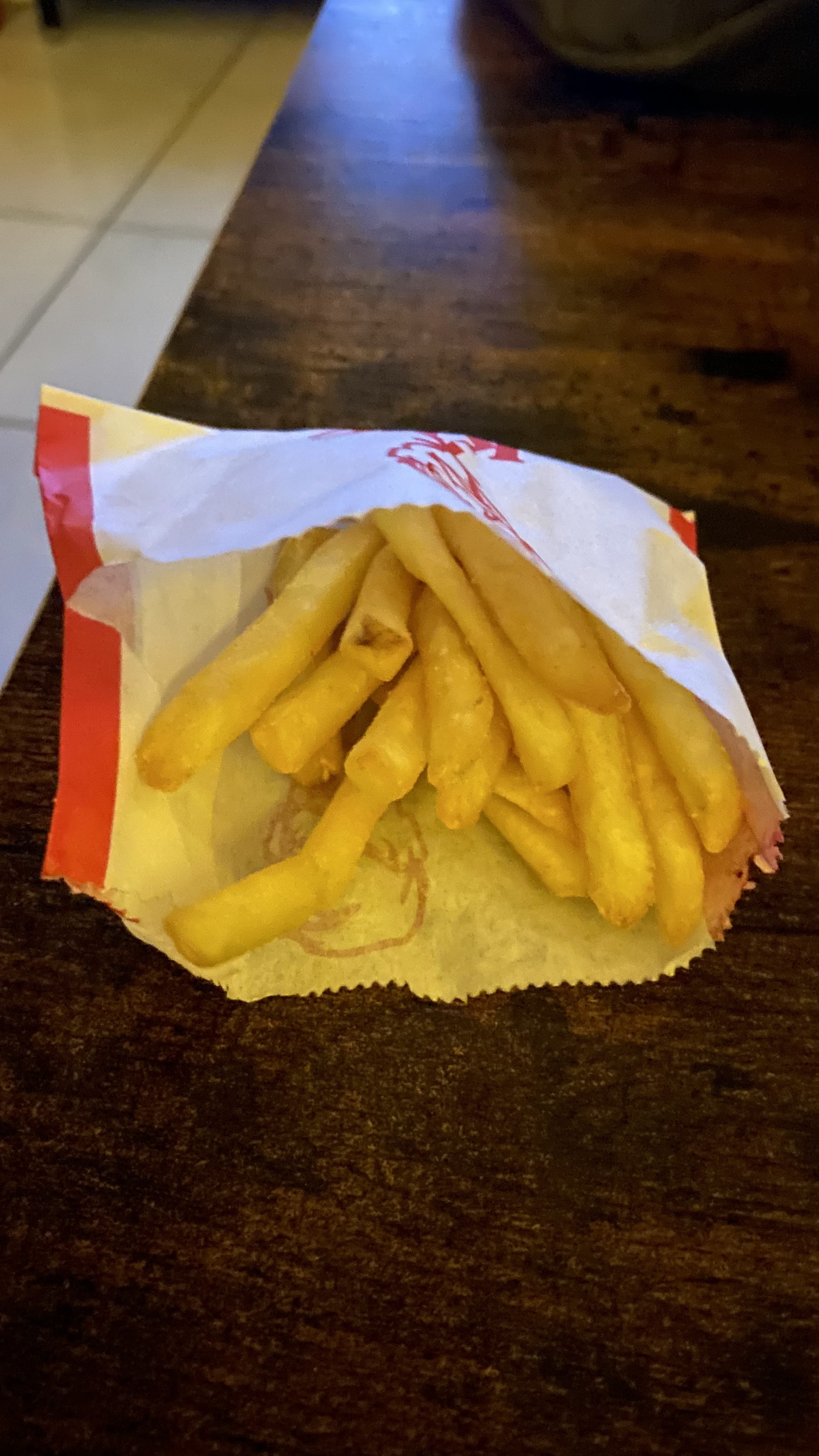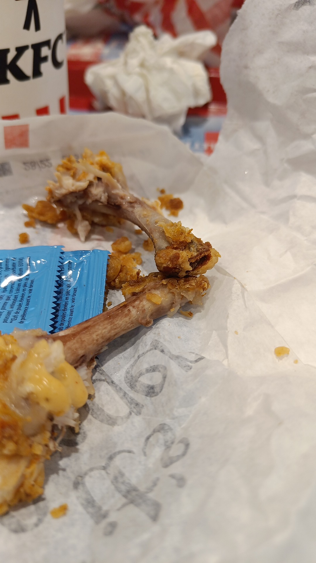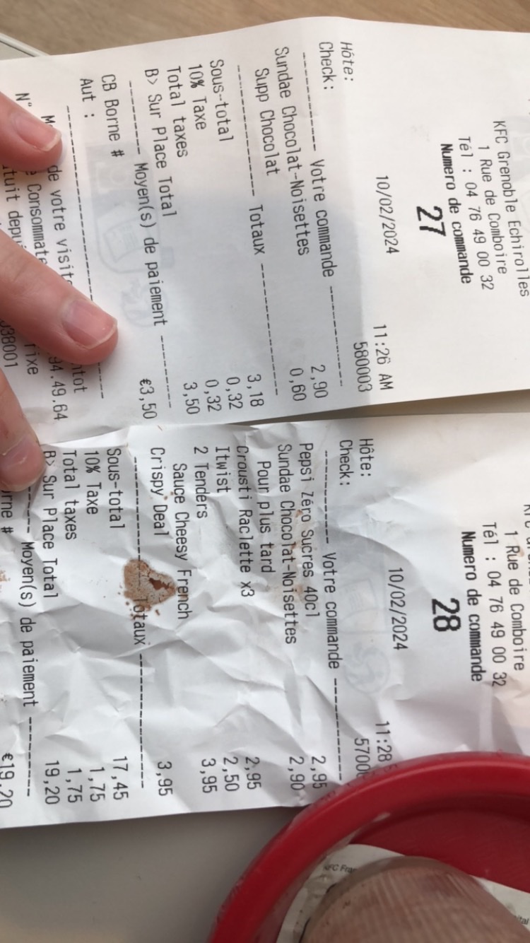 Les sauces ketchups mayo c’est en option ? Et les frites sont en rupture ? Parce que regarder la taille de la frite. Il est où le respect ? 😂 Il y a toujours un problème quand je commande au drive de ce kfc , c’est fréquent qu’il oublie une glace , un sandwich ou une frite Au-delà du fait que l’on doit vérifier qu’il y ai bien la totalité des produits payer dans le sac , il vas aussi falloir que l’on vérifie que les emballages ne soit pas à moitié vide maintenant ? C’est quoi la prochaine étapes ? J’descend de m’a voiture et je fait mon sandwich moi même ? Vu l’augmentation du prix des menus je trouve sa totalement inacceptable !