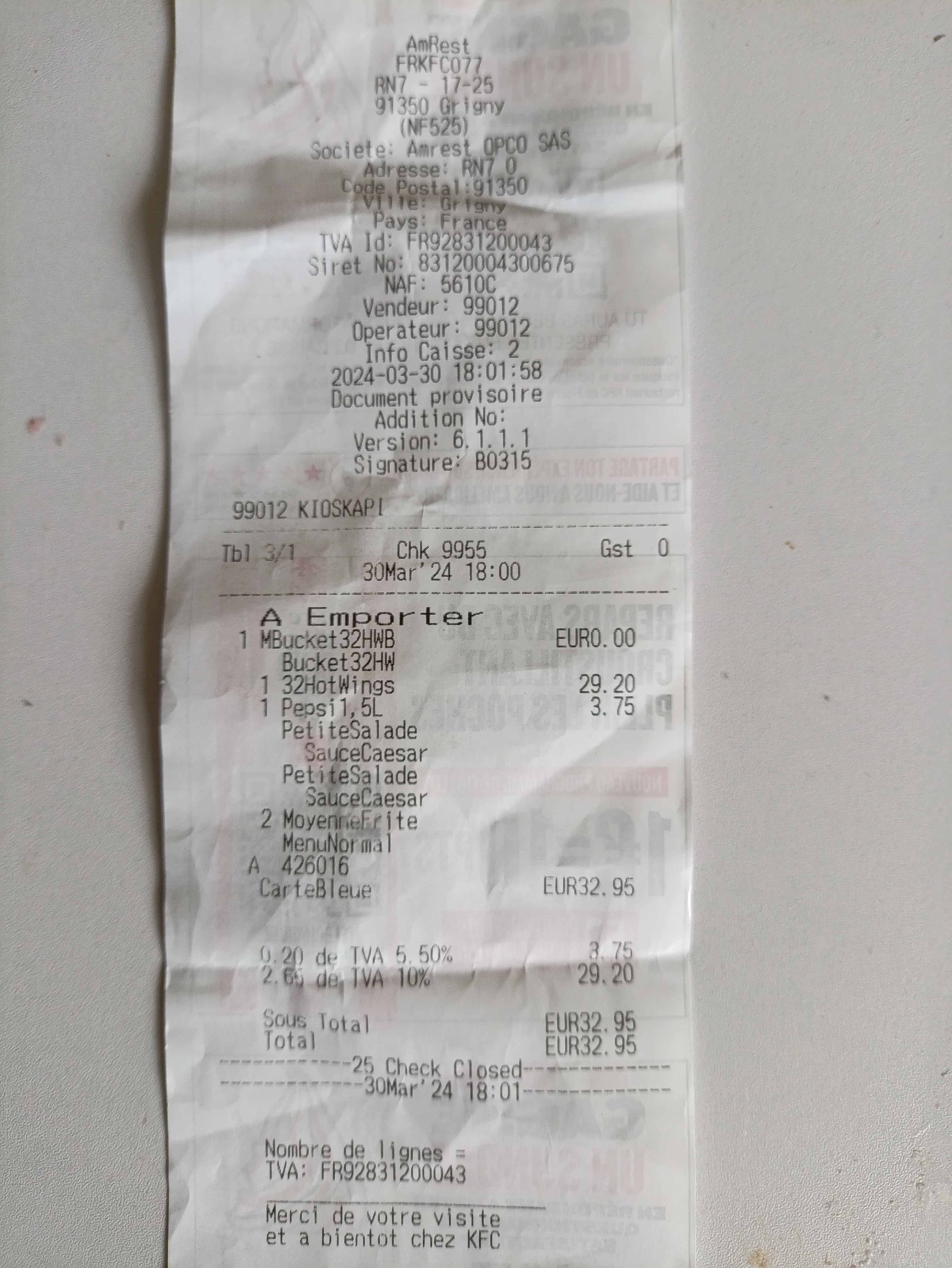 Plusieurs commandes passés par uber. Des oublis à chaque fois mais le pire, c'est un jour où j'ai commandé avec une offre un acheté un offert et que lors de la livraison surprise un seul menu. On appel le restaurant qui nous dis qu'il ne font pas ça alors que l'offre était bien valable et que sur le ticket de caisse agrafé sur le sac c'est bien écrit, la réponse ? oui c'est écrit mais je ne sais pas pourquoi, on ne fait pas ah très bien. Donc une personne ne pouvais pas manger et se contenter de cette excuse et de plus j'avais payé un supplément pour des Kentucky fries et j'ai eu des frites basic avec comme réponse demandez à uber de vous rembourser. Je ne conseil pas du tout ce restaurant pour ce qui est des erreurs, après je ne suis jamais aller sur place, c'est peut être mieux... Mais je n'irai pas vérifier.