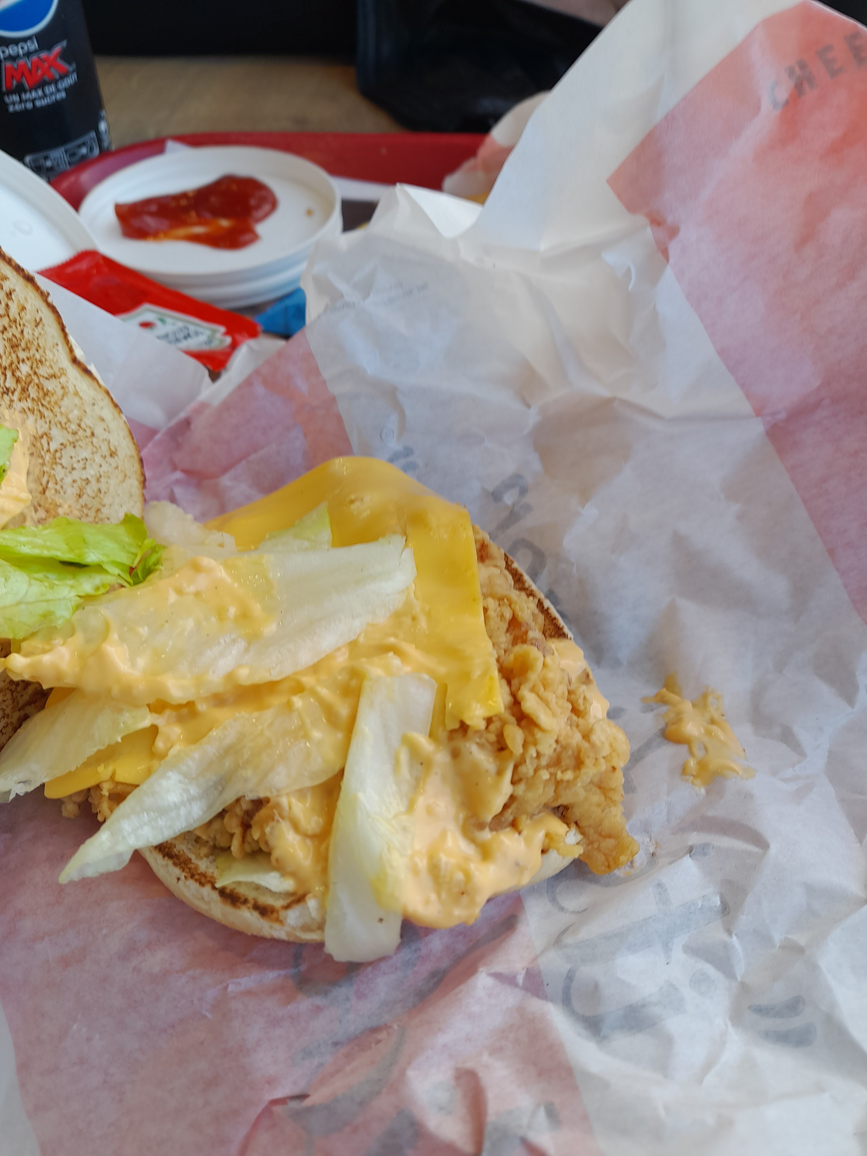 La jeune fille du comptoir était agréable. Cependant la nourriture est à revoir... Nous avons pris un Colonel et un Tower, les deux avaient un poulet pané marron, un goût infecte de sel, froid... Il a du être cuit, recuit et encore recuit puis laissé de côté. C'était immangeable, les deux burger sont à moitié partis à la poubelle. Vraiment dommage.