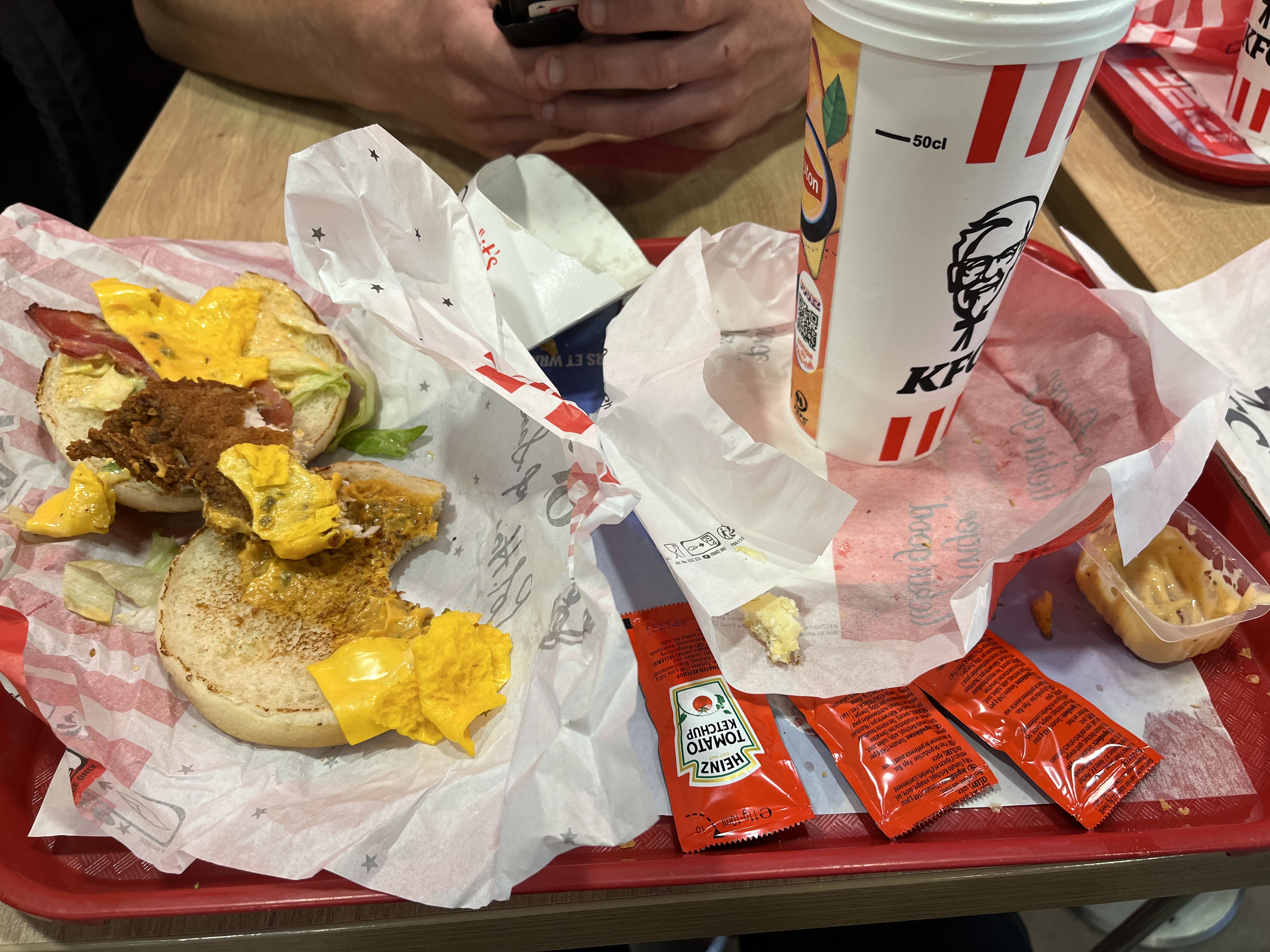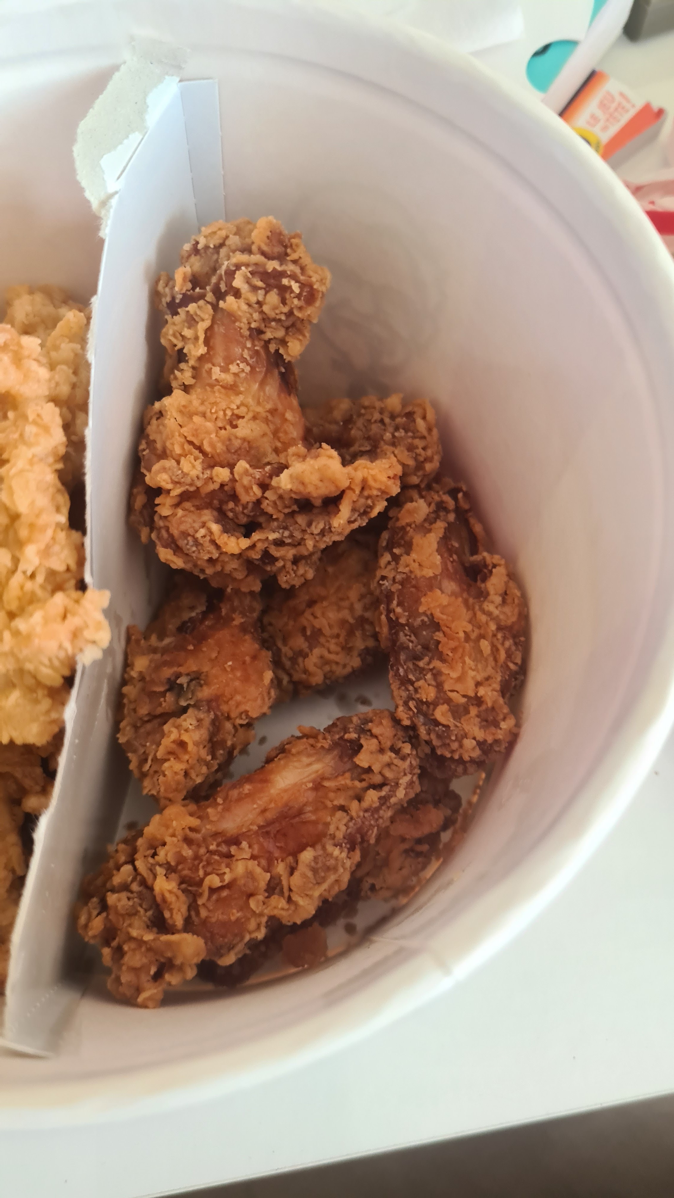 Le poulet était froid a coeur la panure a peine mieux, pourtant à 17h se dimanche kfc etait bien vide, en plus ils laissent un client parler sur haut parleur pendant plus de 30min sans aucune intervention, c'est vrai qu'il y avait que 3 autres client mais quand même