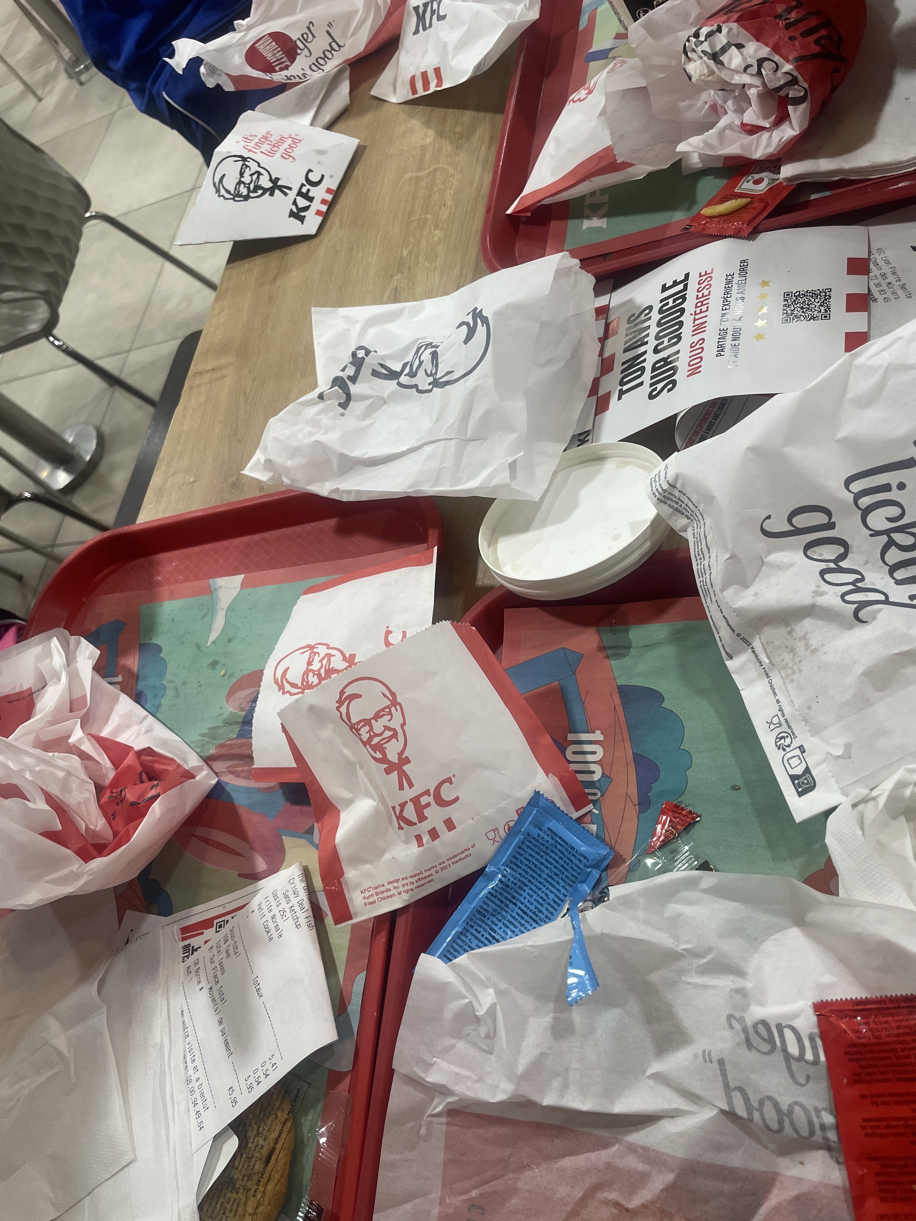 Je ne comprends pas pourquoi les KFC ont des problèmes d'hygiène dans les salles. 2 jeunes ont renversé 2 verres de soda. Ils ont prévenu le staff. 30 minutes plus tard, la flaque de soda était toujours là, en plein milieu du passage des escaliers. Et les poubelles sont constamment archi pleines. Hors mis ce très gros problème (à la Part Dieu c'est encore pire), tout est OK.