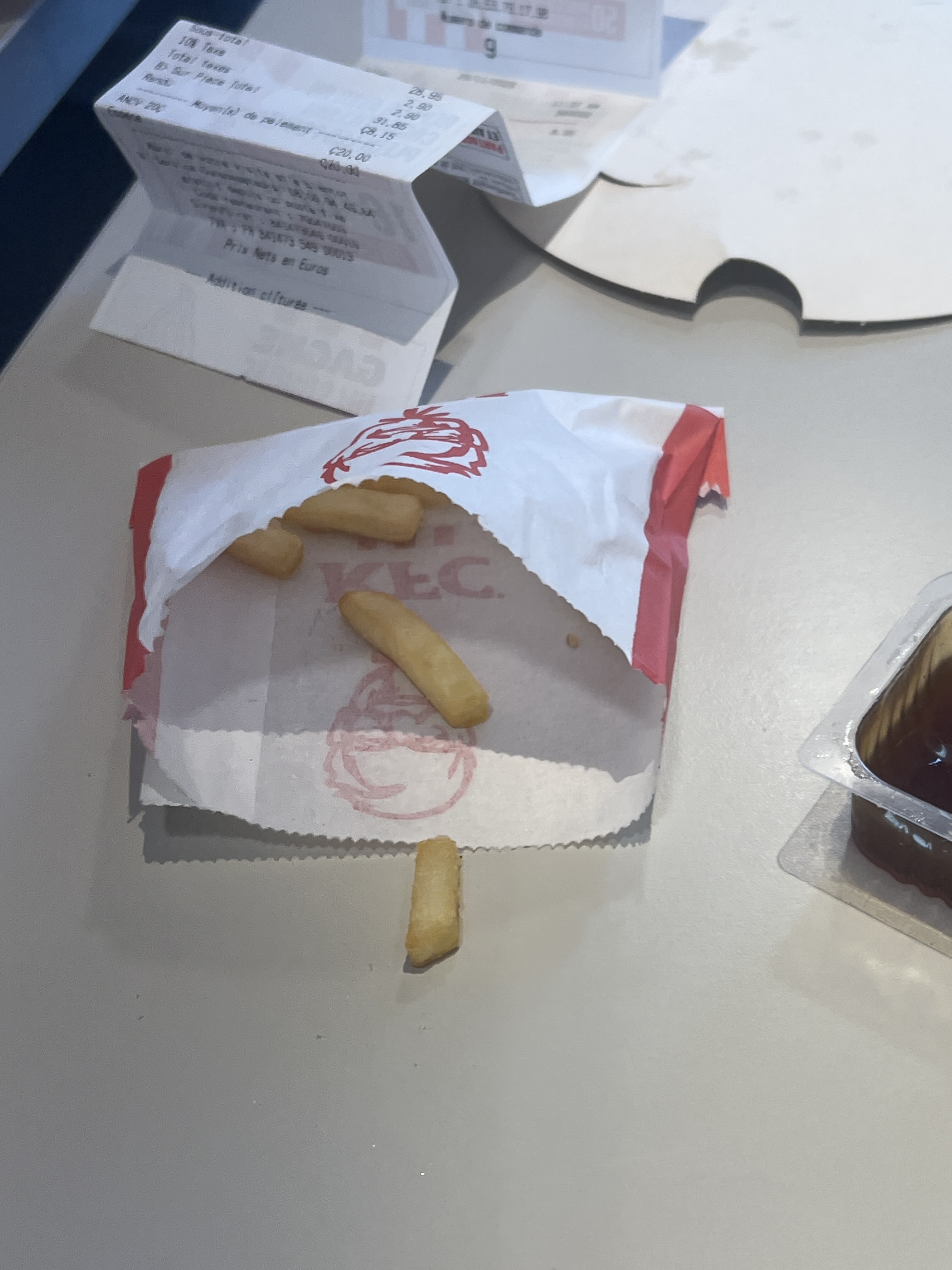 j ai commandé 3 menus à emporter donc 3 frites au début j ai été agréablement surpris car les frittes étaient chaude ce qui est rare mais c est voleurs avaient mis en dernier tout au fond le dernier paquet de frites, les vicieux ..j ai compris pourquoi elles étaient toute rance et froide c est vraiment des vicieux c est pas ce que ca coute . Il m ont refiler des vielles frites juste pour ne pas les jeter. Ca en dit long sur leur méthodes. Même chose pour les tender les 4 dernier tenders au fond ne sentaient pas la fraicheur.... donc méfiez vous pour les commandes au drive vérifiez bien la fraicheur de ce qu vous prenez car il refiles leur veux trucs cuit de 3 h bien au fond . ils se dise que personne ne va faire demi tour pour ca et en terme d hygiène c est interdit
